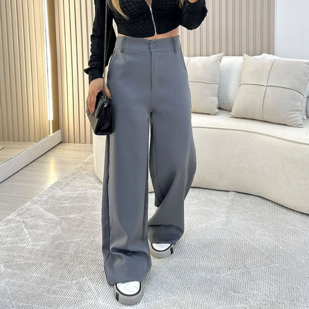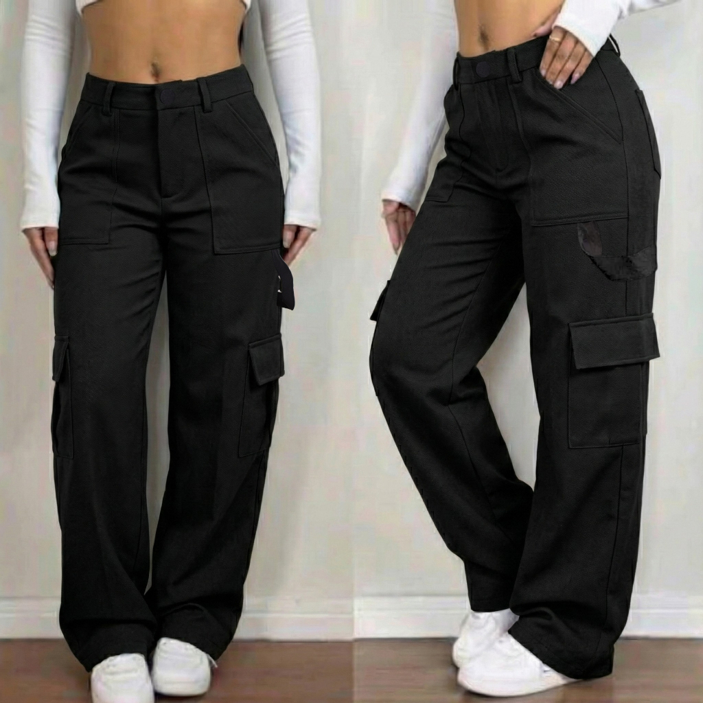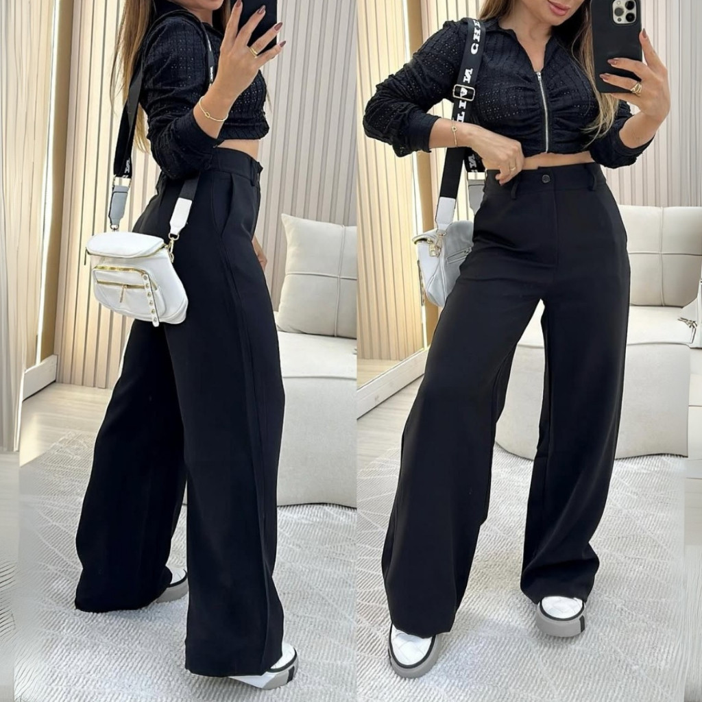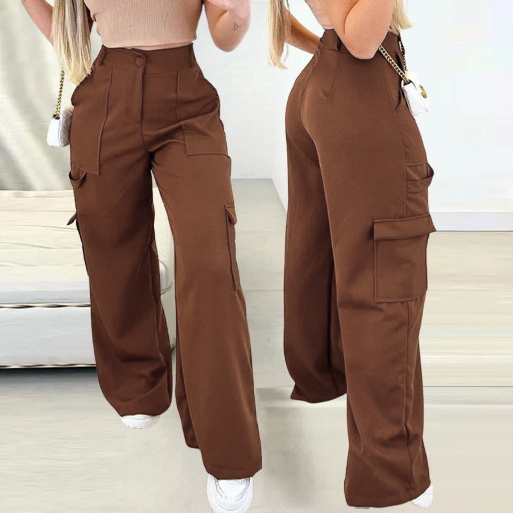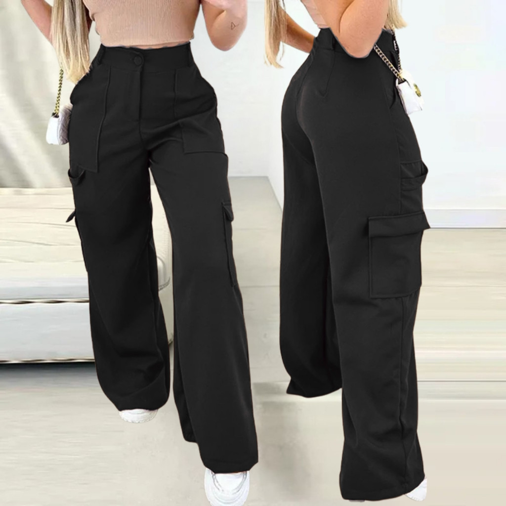 Calça Cargo Alfaiataria Social Feminina Pantalona Bolsos Cós Alto