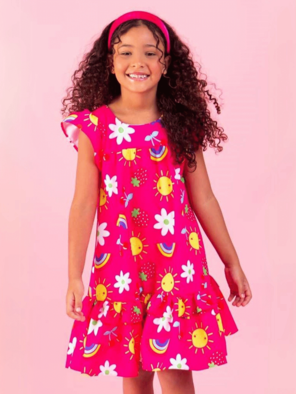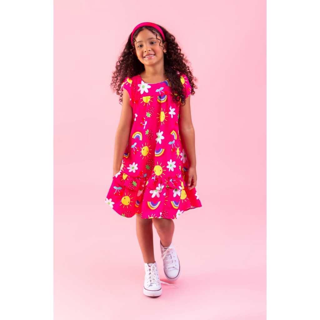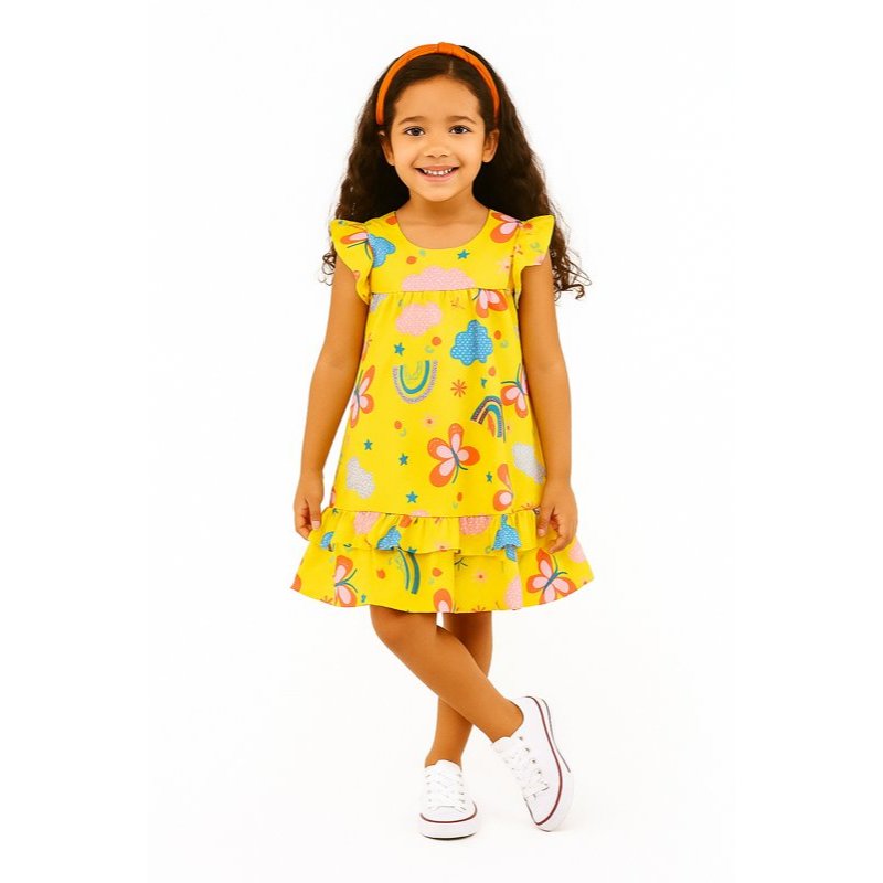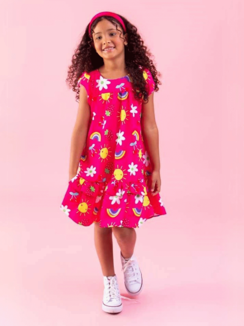 Vestido Infantil Menina Crepe Santorini Estampado Floral Arco-Íris Sol Babado Rodado Colorido