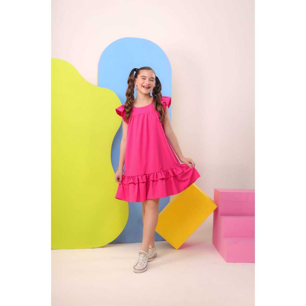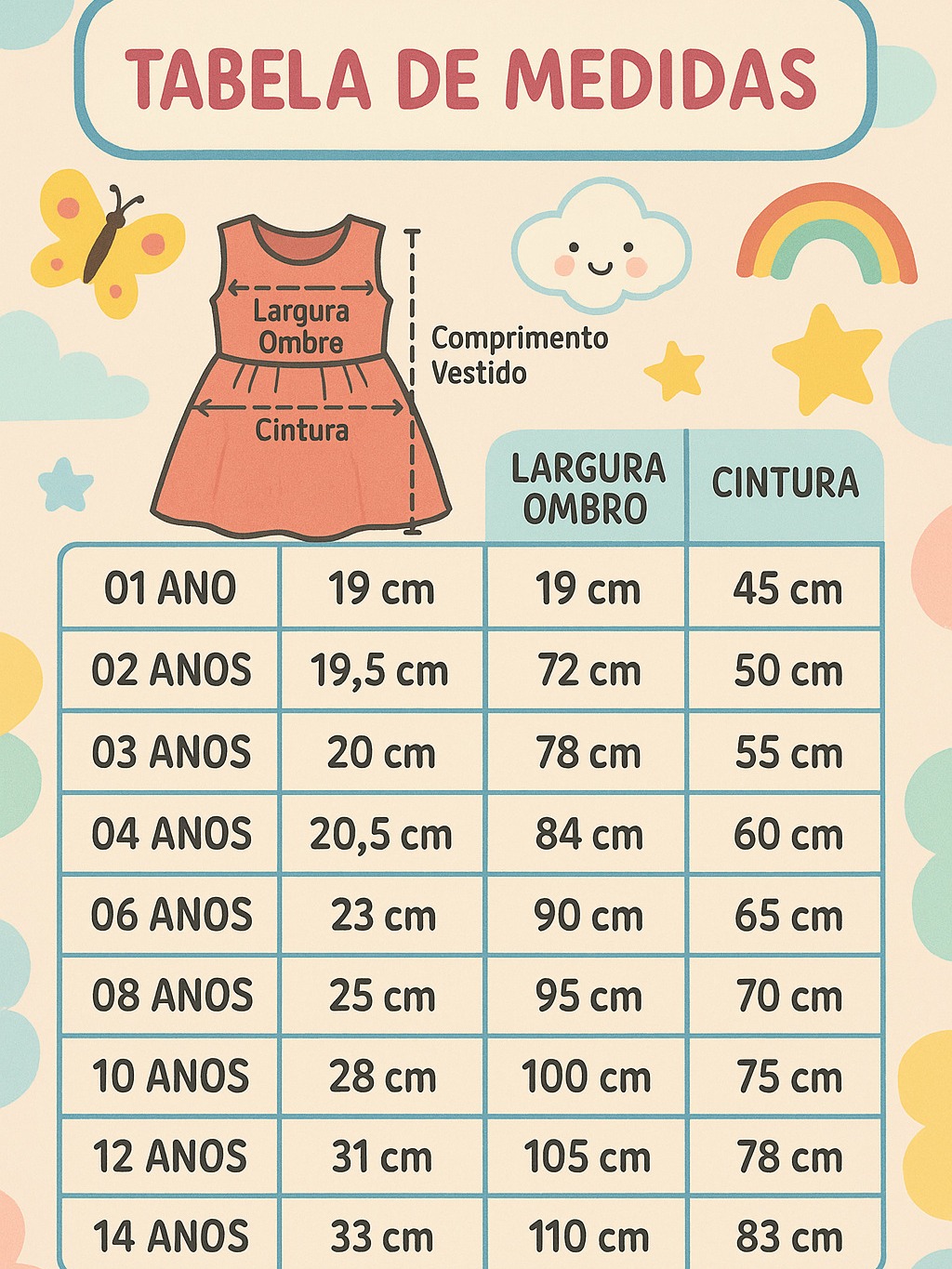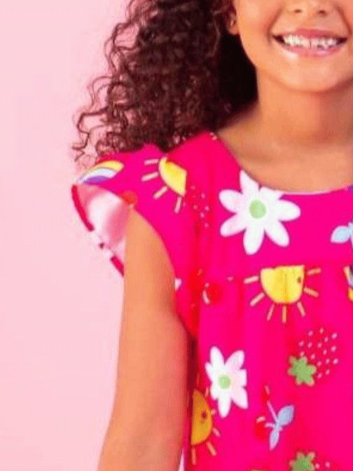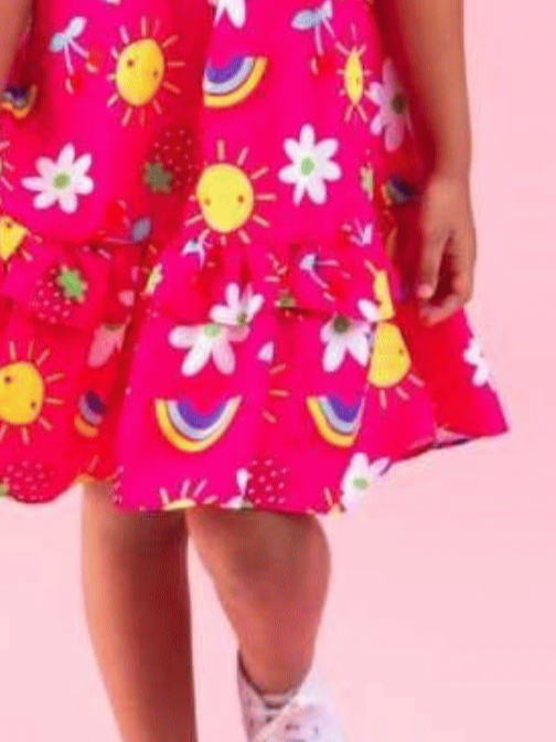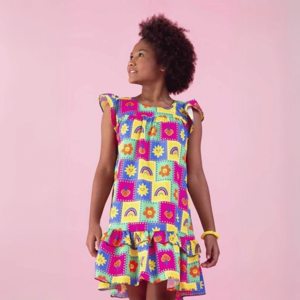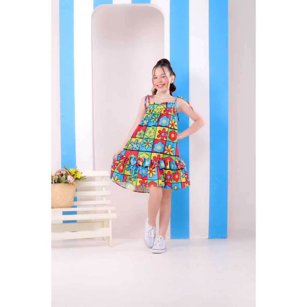 Vestido Infantil Menina Crepe Santorini Estampado Floral Arco-Íris Sol Babado Rodado Colorido