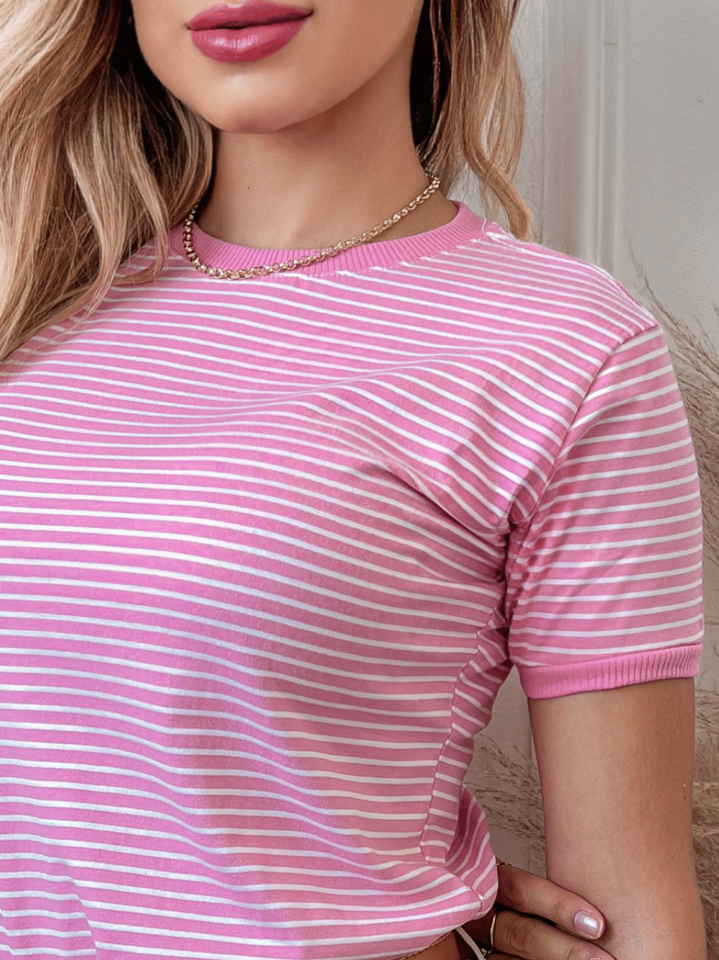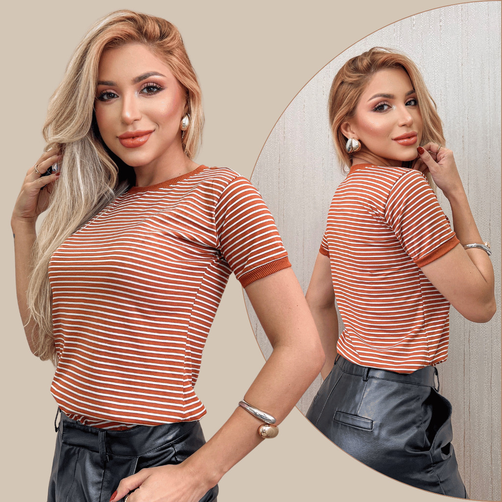 Blusa Camiseta Listrada Manga Curta P ao GG T-shirt Casual Gola Ribana Babylook Moda Verão Oferta