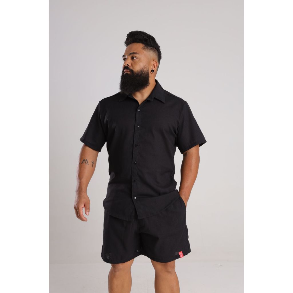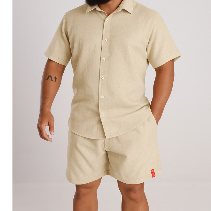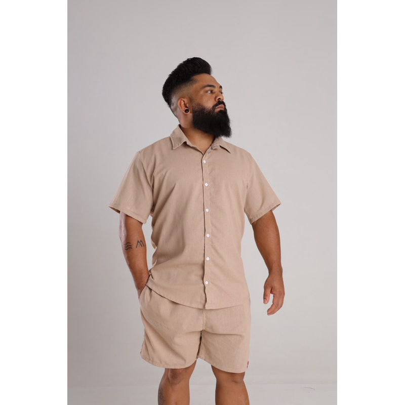 Conjunto Masculino de Linho Elegante Camisa botão e Short Linho Casual Roupa de linho Masculina