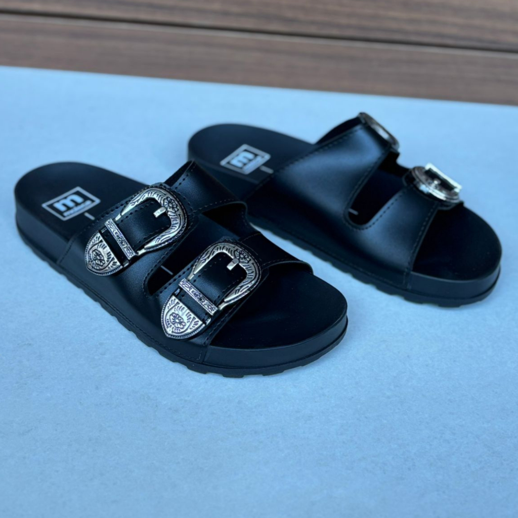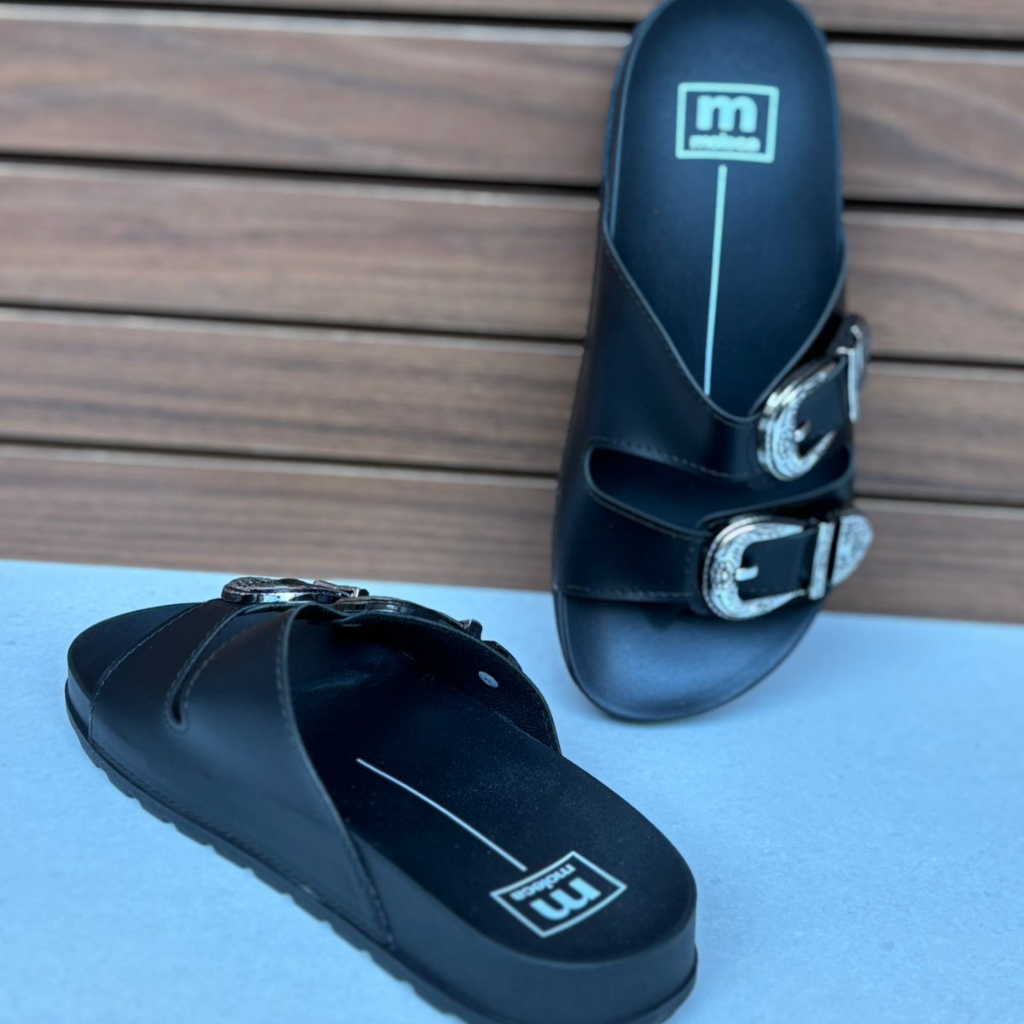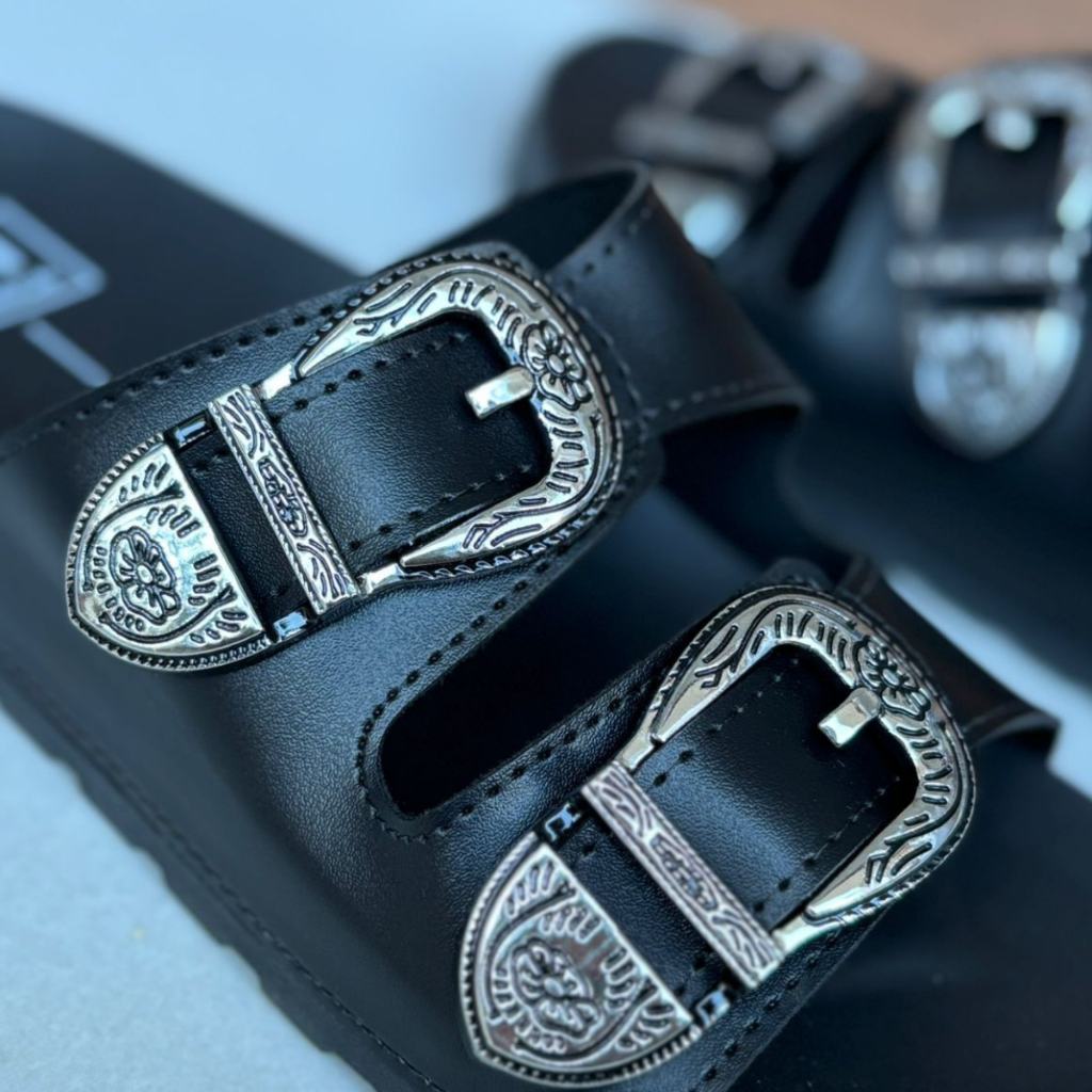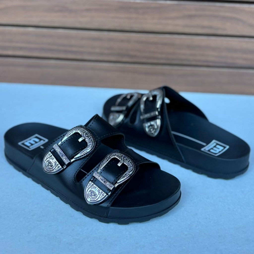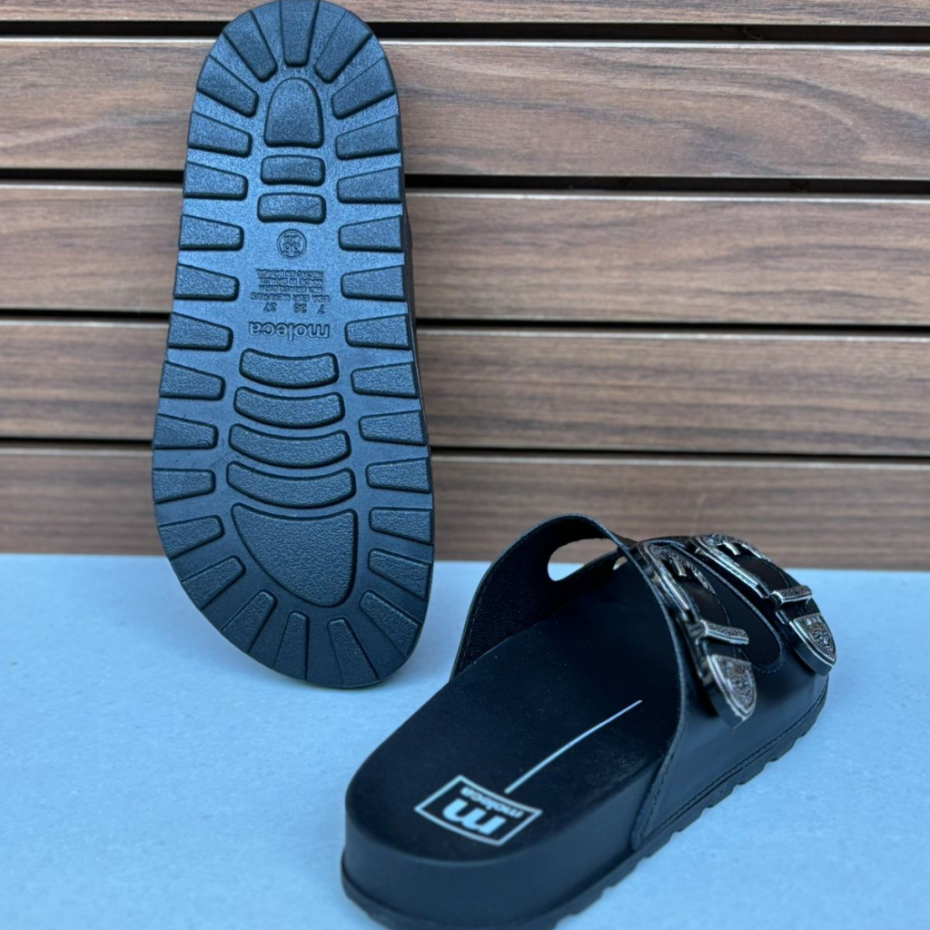 Sandalia Moleca Feminina Slide Preta Com Fivelas Co Nota Preto Liso Moderna Moda Blogueira Original