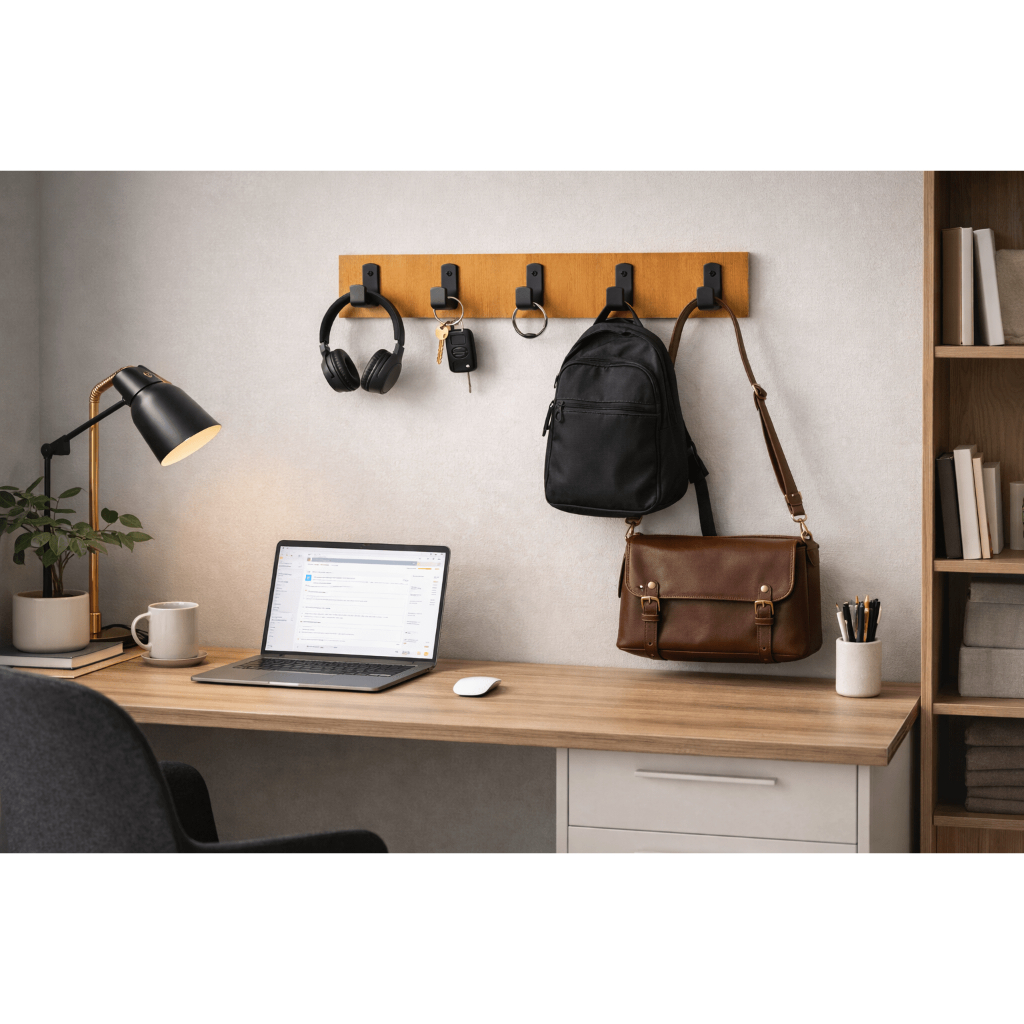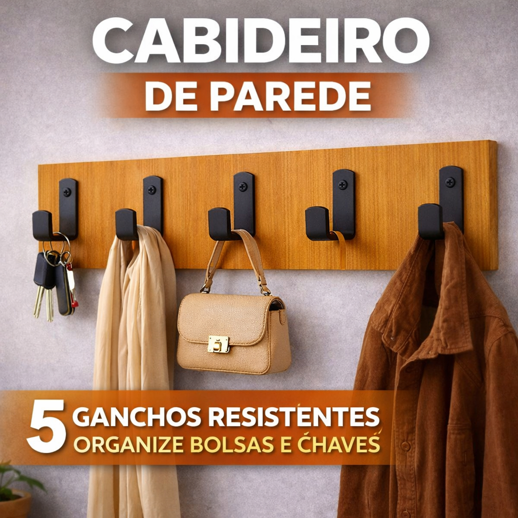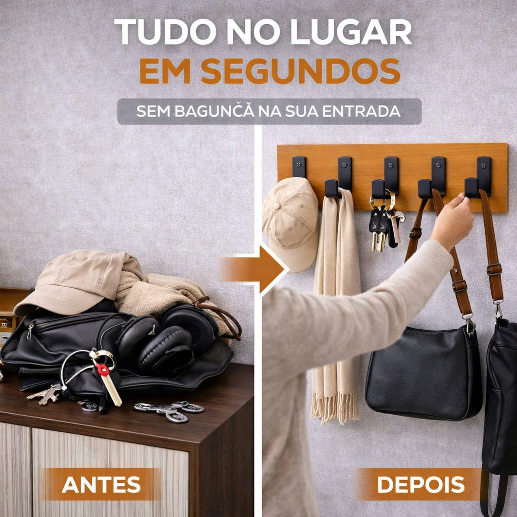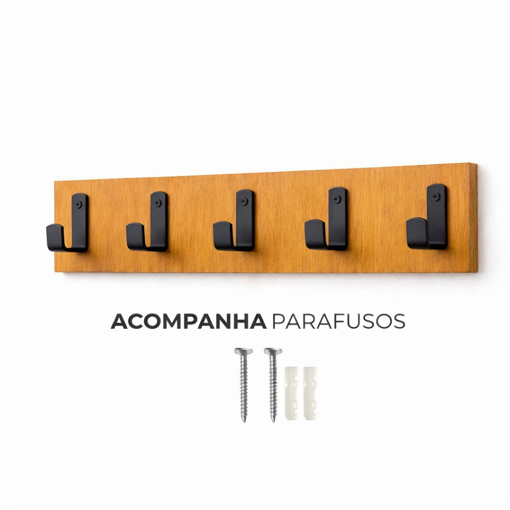Cabideiro de Parede 5 Ganchos em Aço Preto Fosco, Base em MDF, Organizador Decorativo para Bolsas, Chaves e Roupas