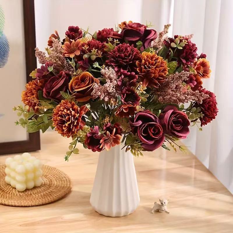 Flores artificiais, 7 cabeças de rosas e crisântemos de outono --9618