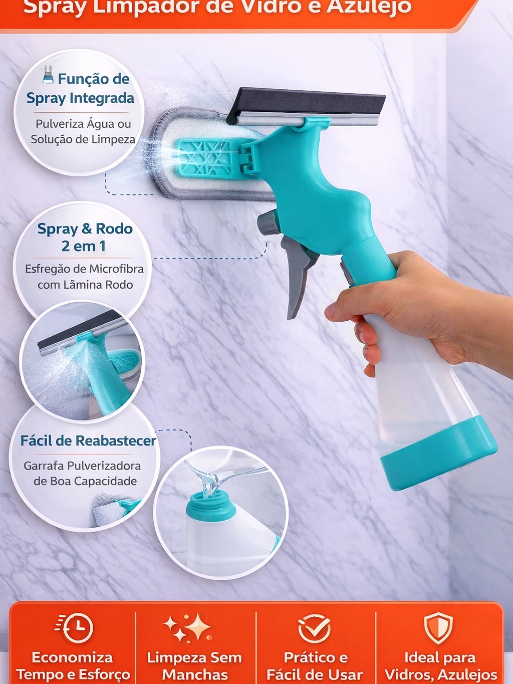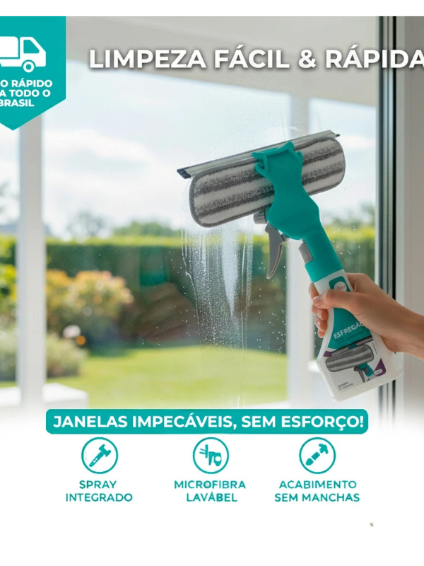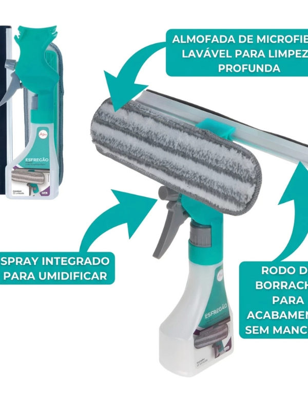 Rodo Mop Mágico 2 em 1 com Spray Limpador de Vidro e Azulejo | Esfregão Microfibra Multiuso para Box, Espelho e Janela
