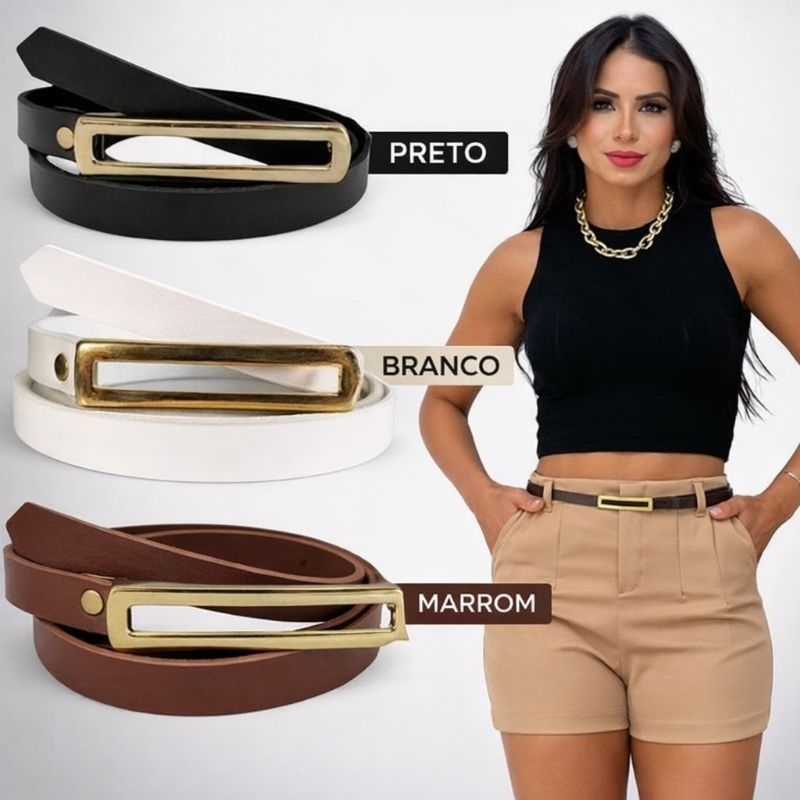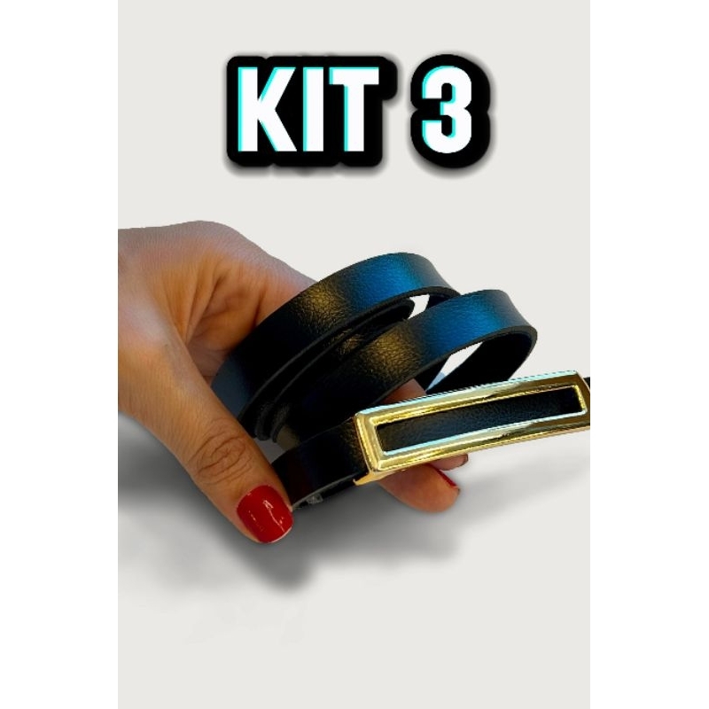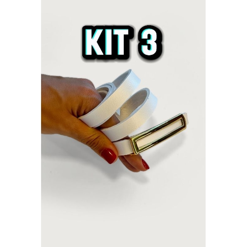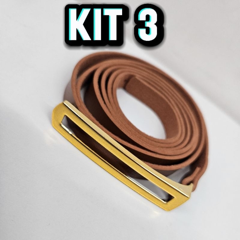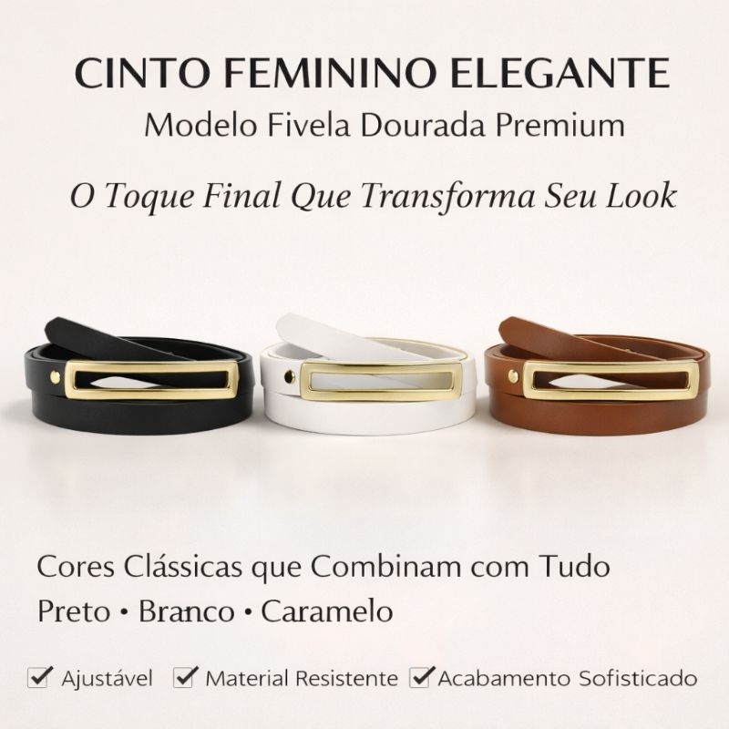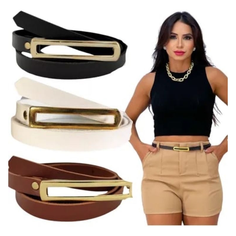Kit 3 Cintos Femininos Couro 110cm Preto, Branco e Caramelo | Fivela Dourada | 1,5cm | Acabamento Premium