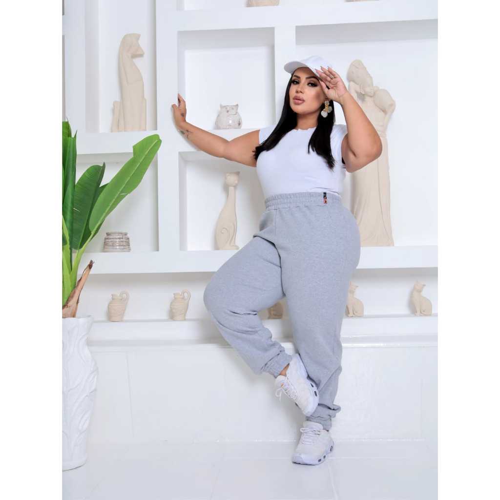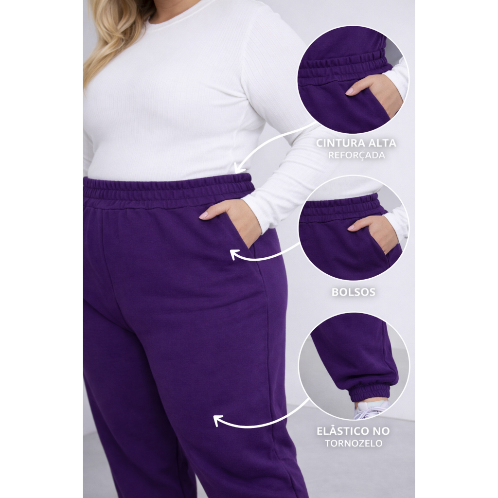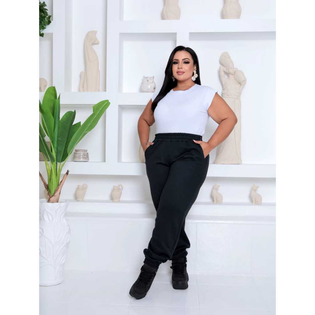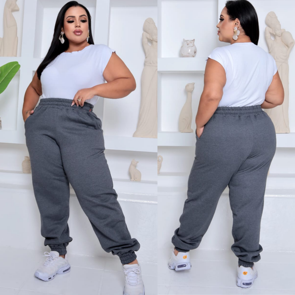Calça Jogger Feminina Plus Size Moletom Cintura Alta com Bolsos Confortável Streetwear Casual Dia a Dia