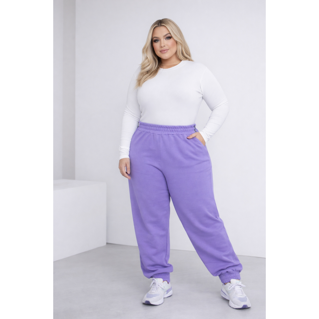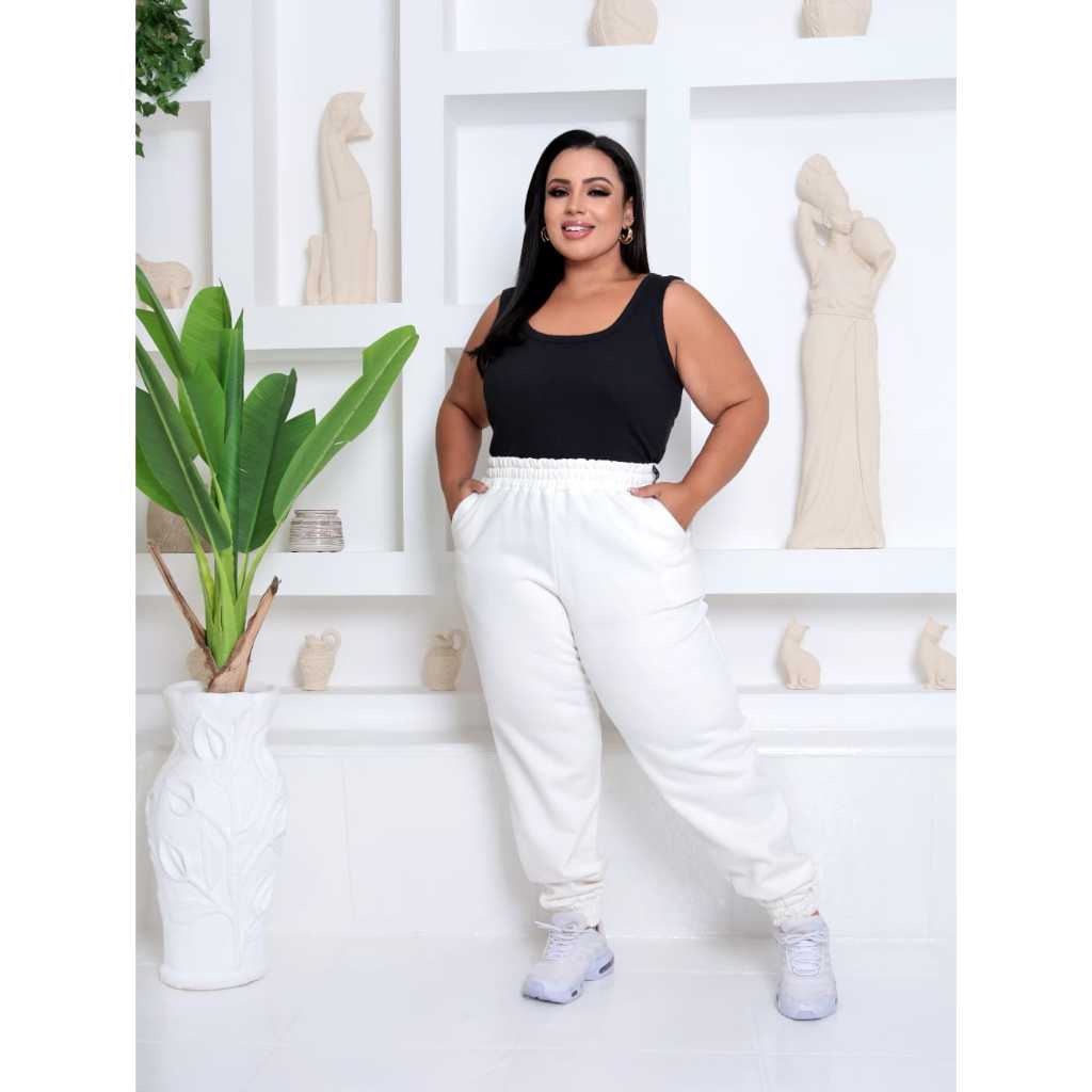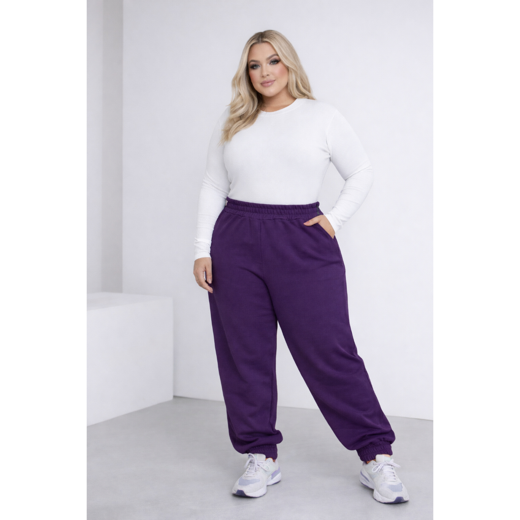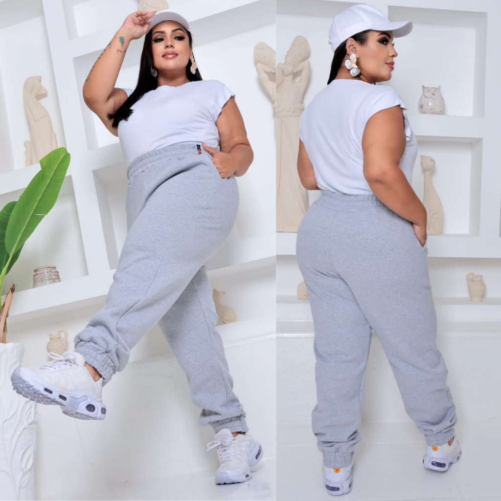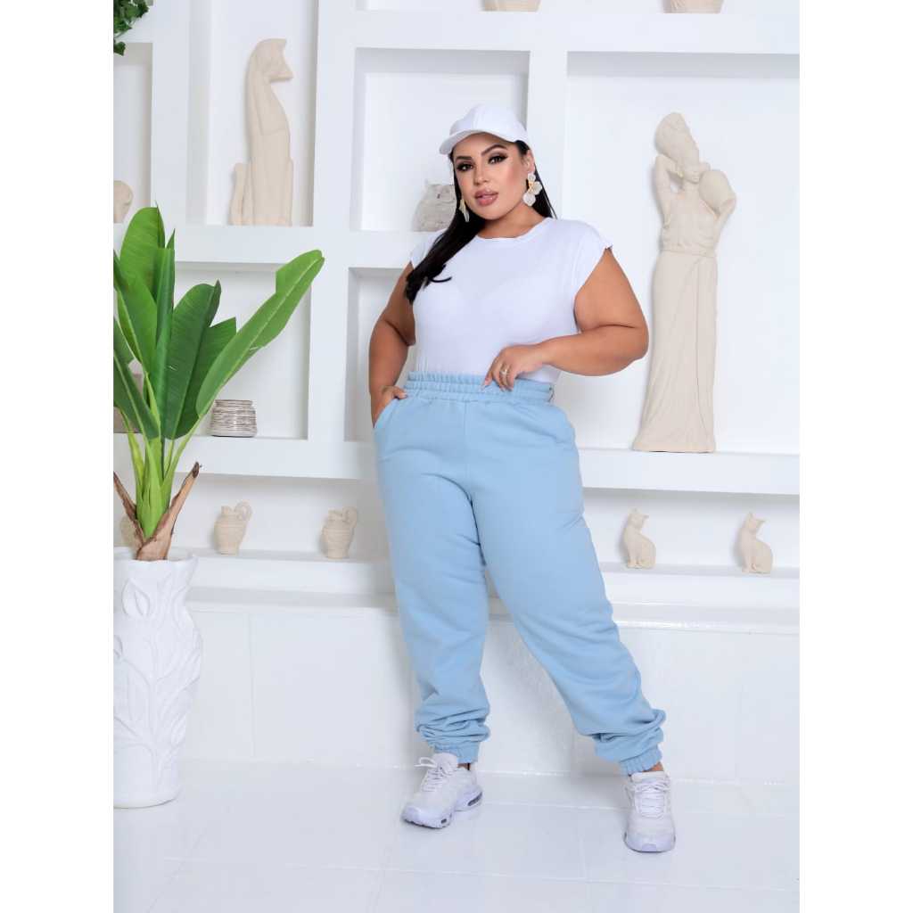 Calça Jogger Feminina Plus Size Moletom Cintura Alta com Bolsos Confortável Streetwear Casual Dia a Dia