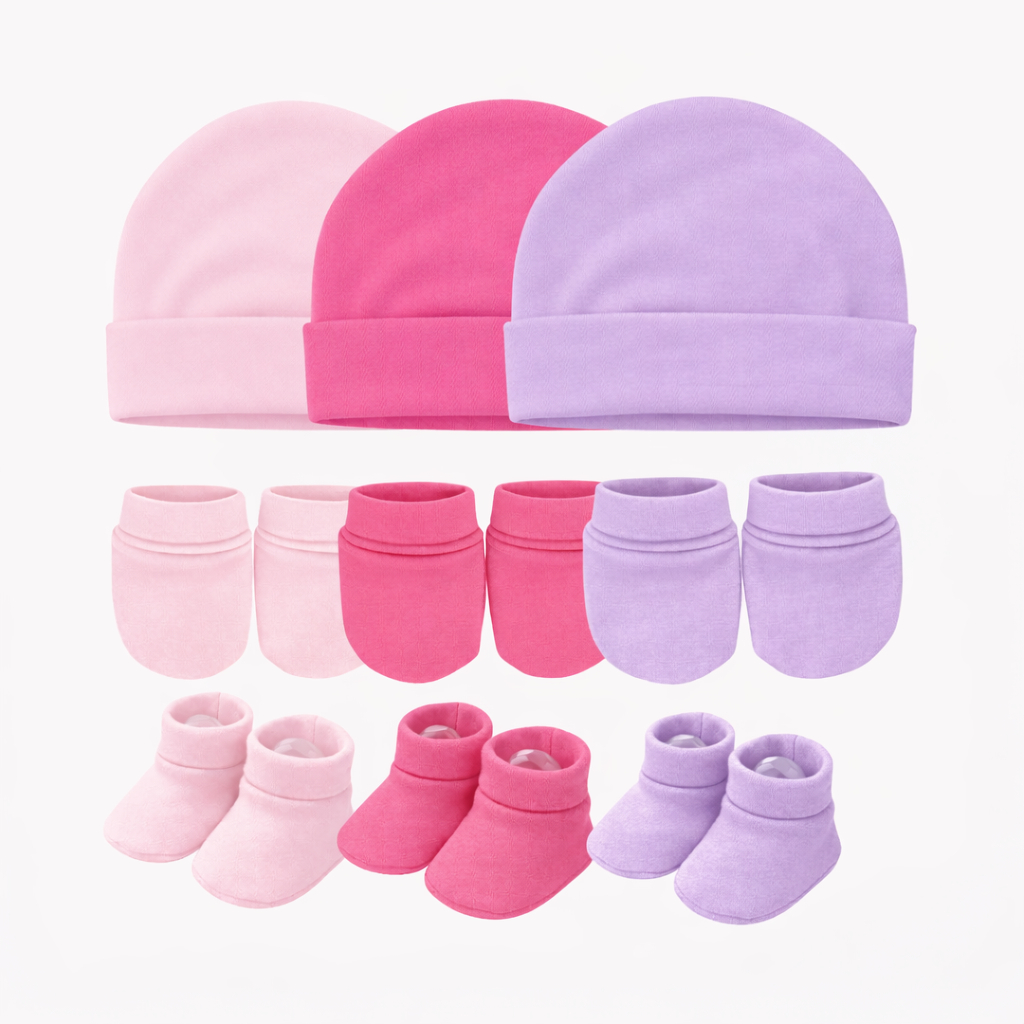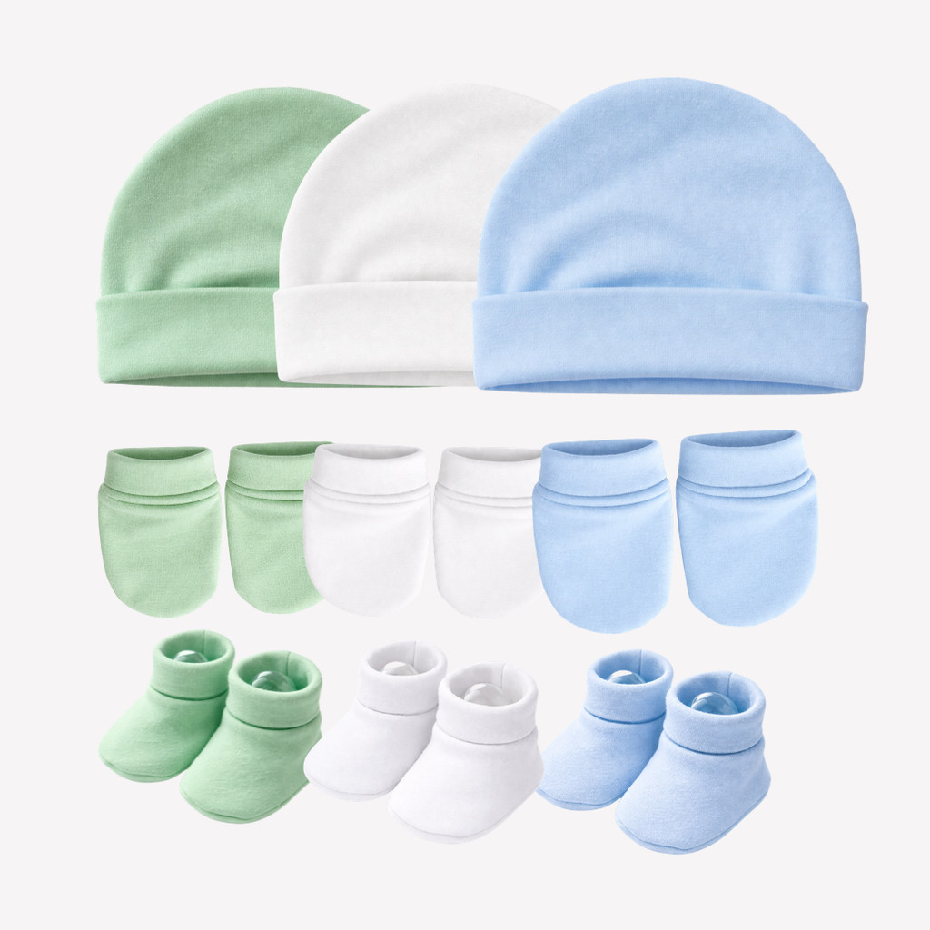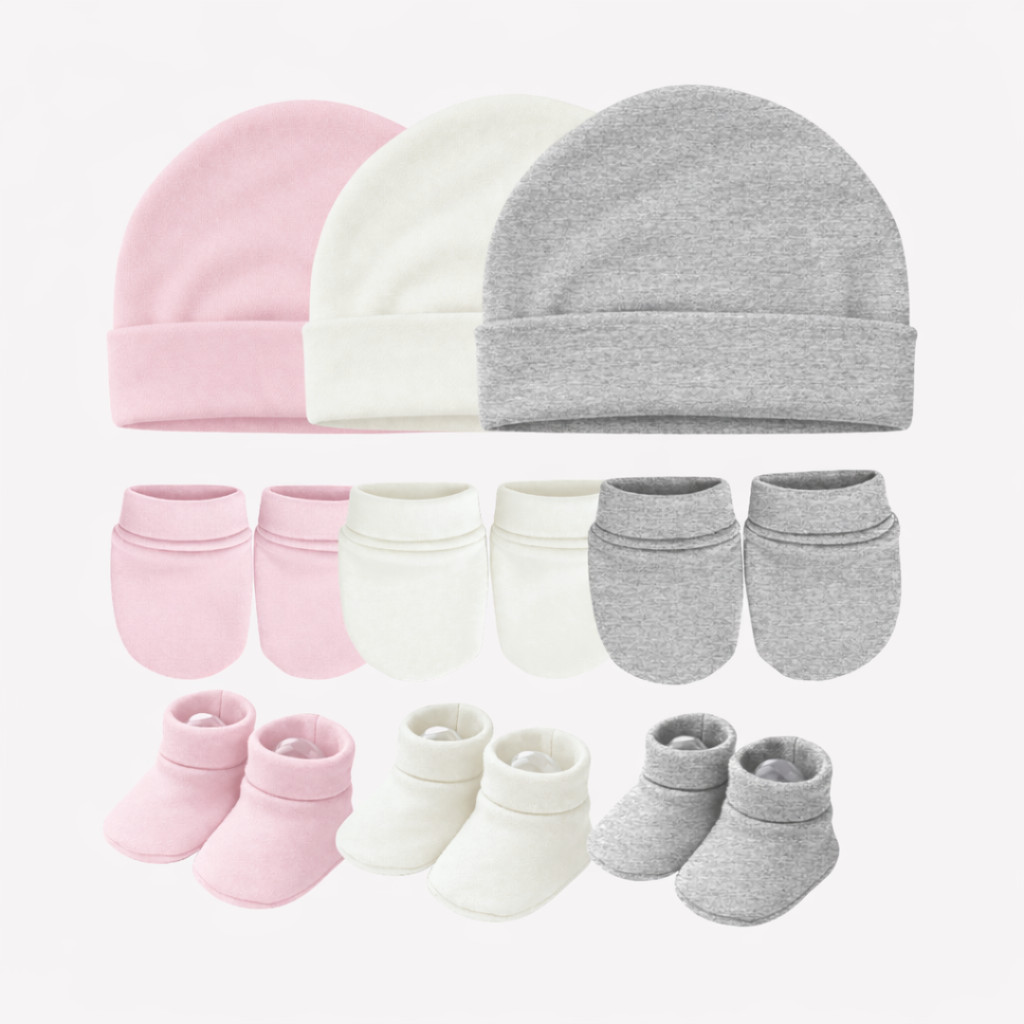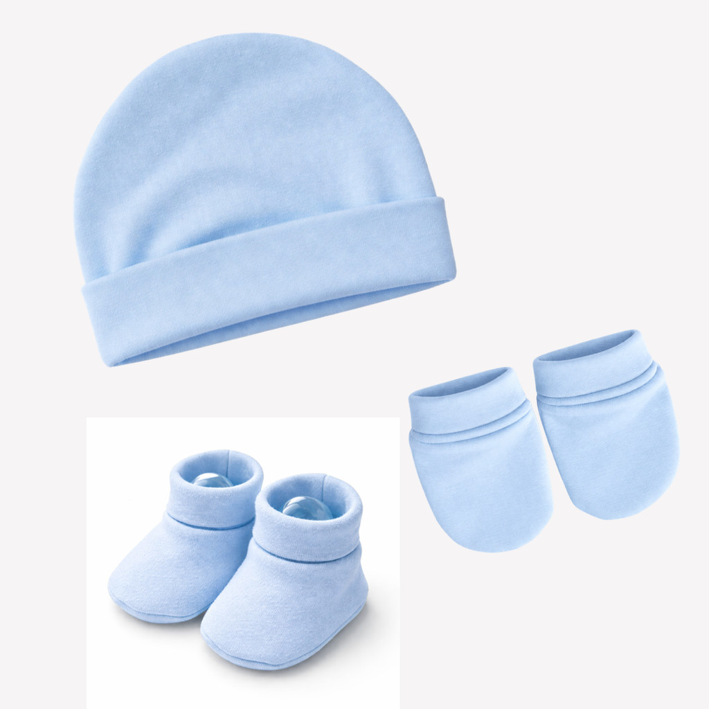 Touca de bebê RN, kit com 3 toucas e 3 pares de luvas 3 Sapatinhos, maternidade enxoval baby, 100% Algodão.