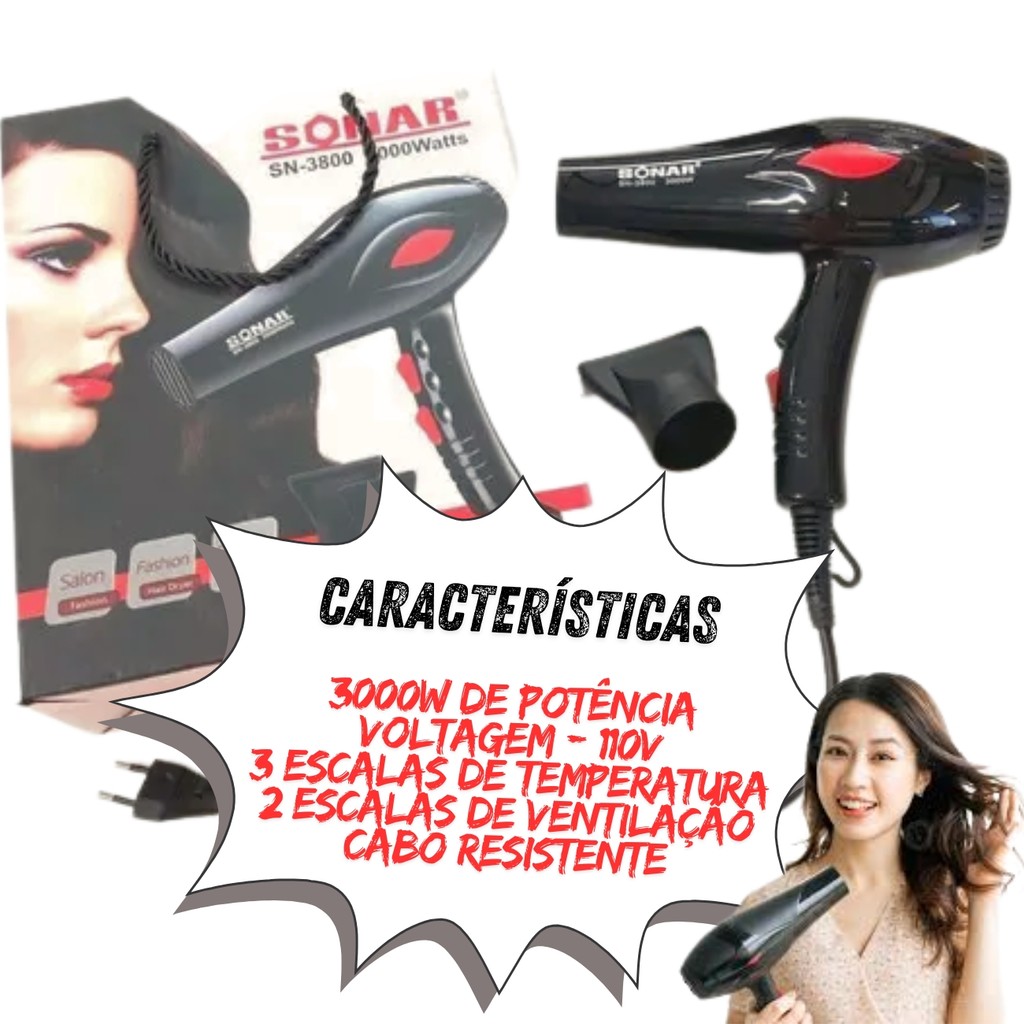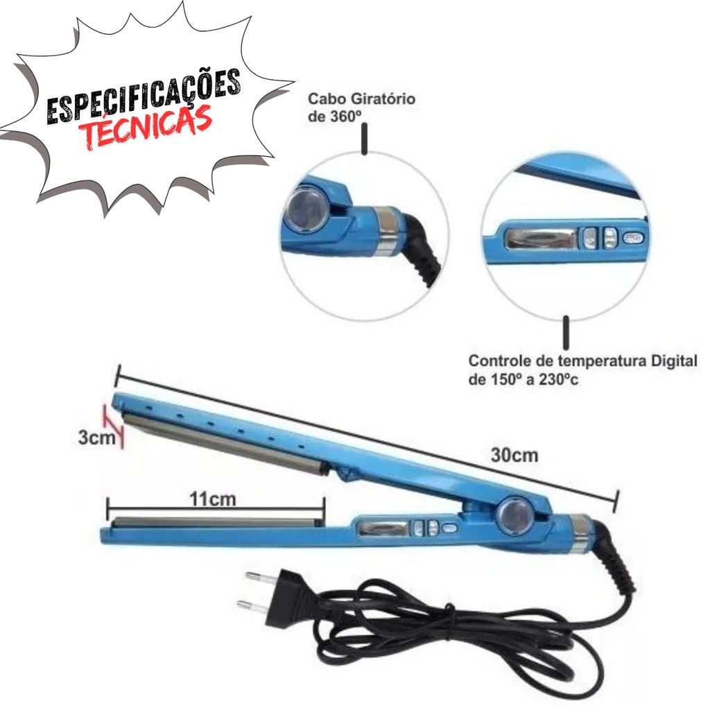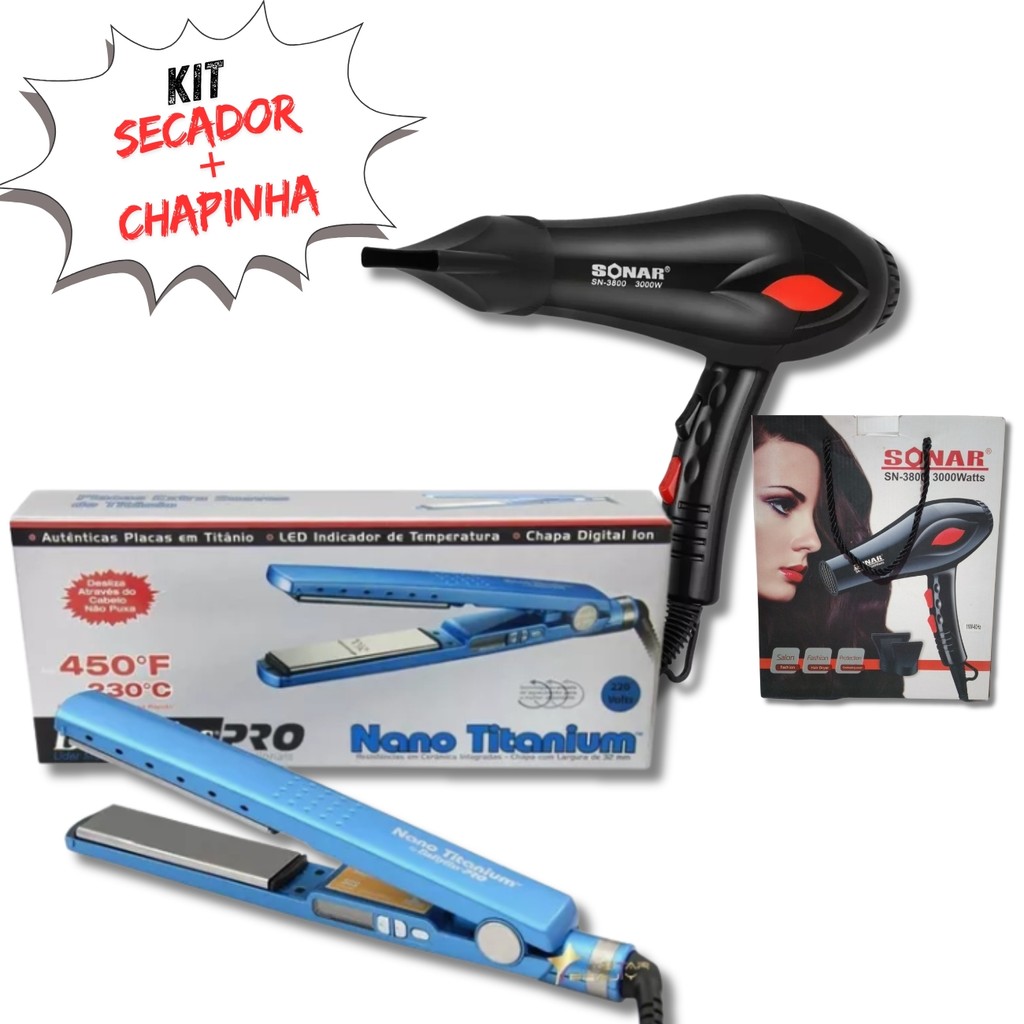 Kit Secador Preto de Cabelo 3000W + Chapinha Prancha Nano Titanium