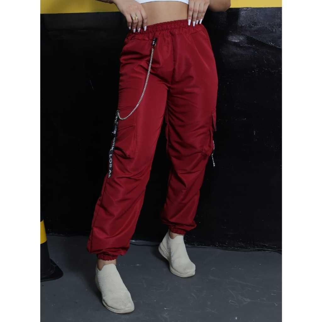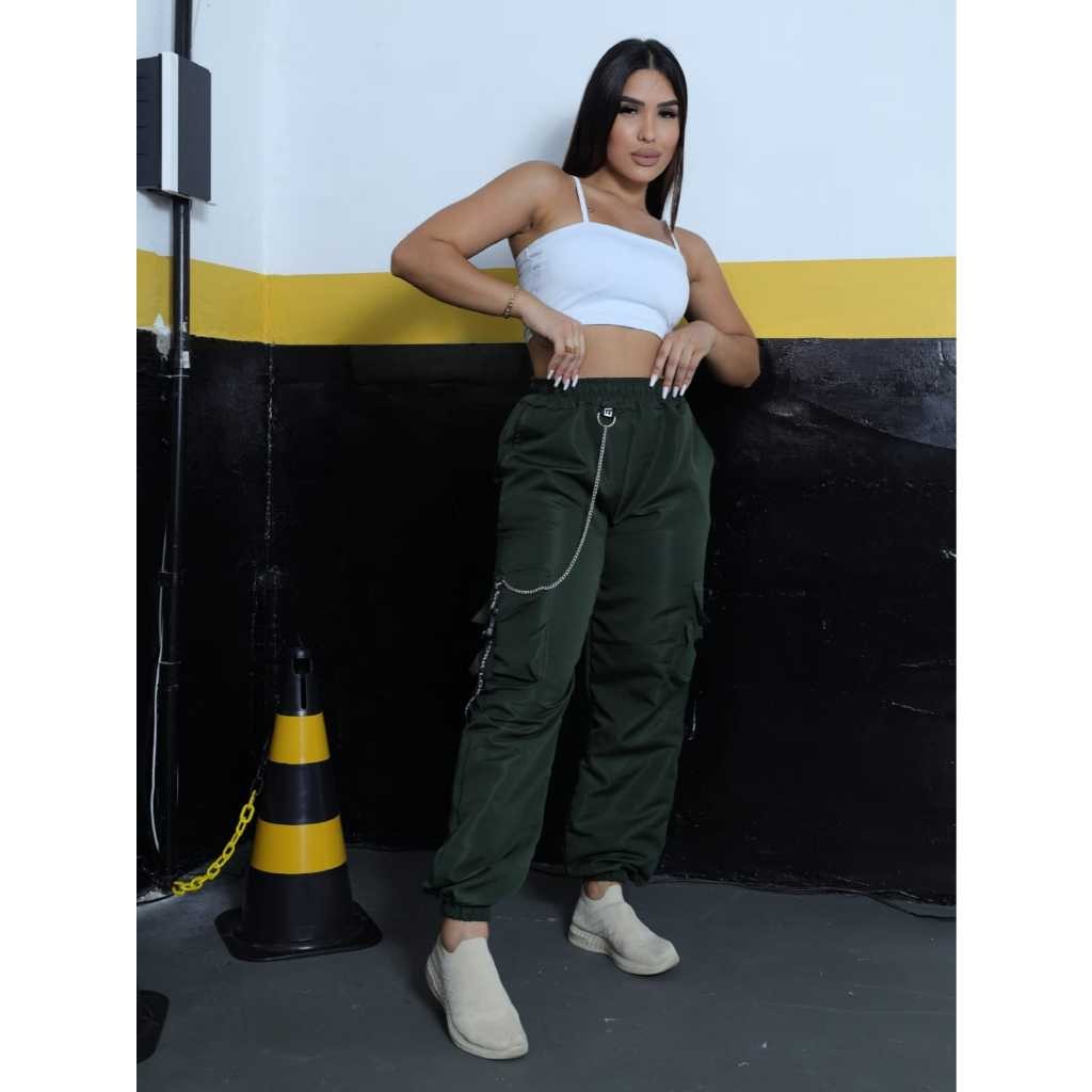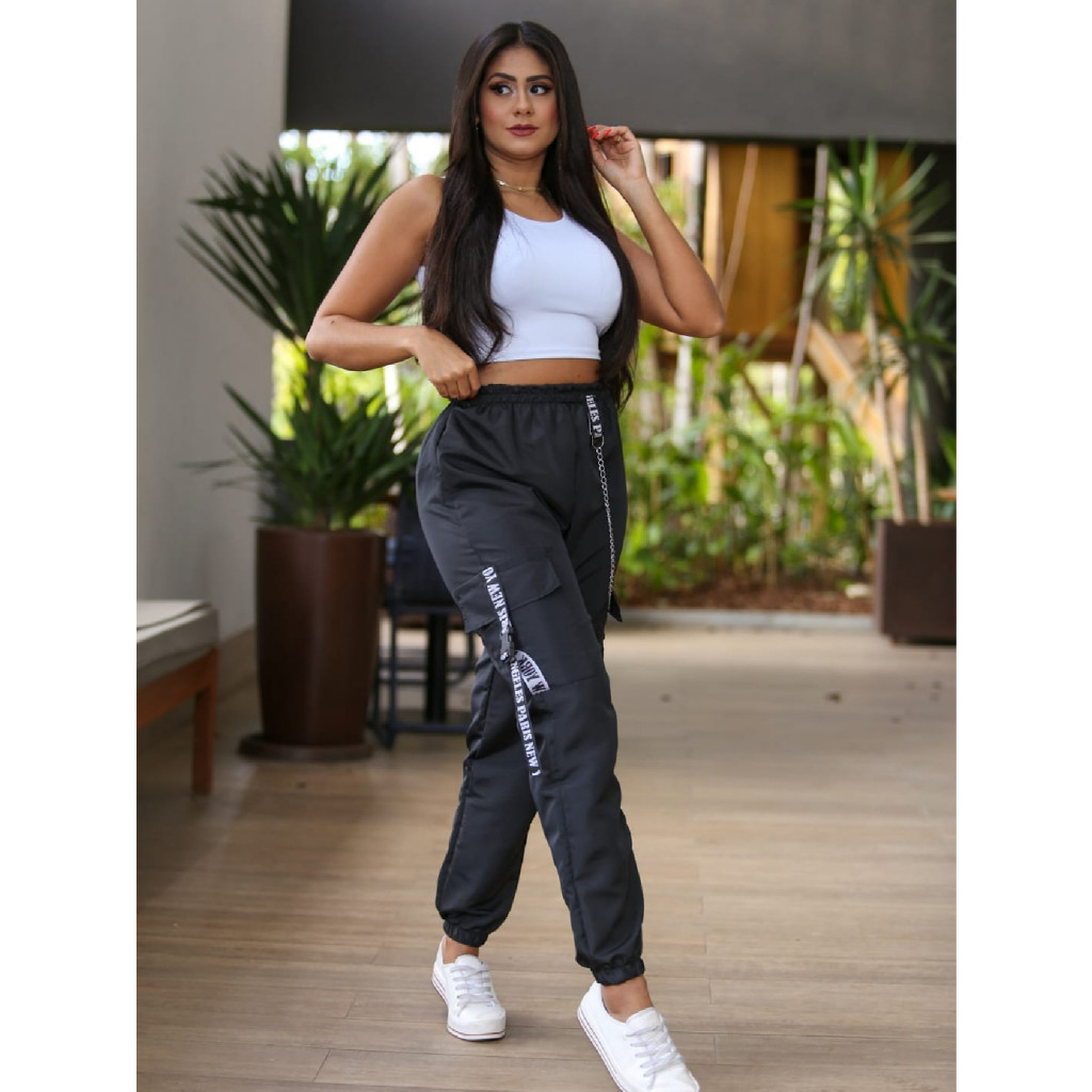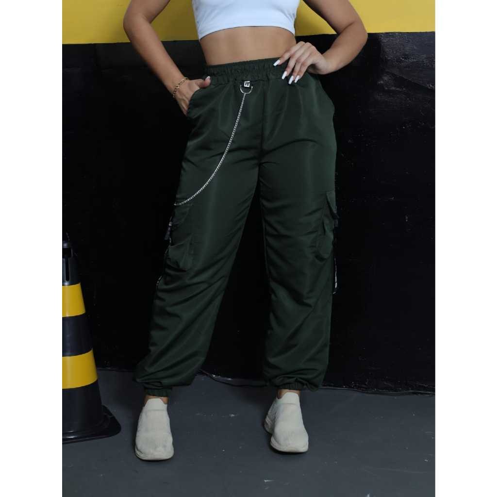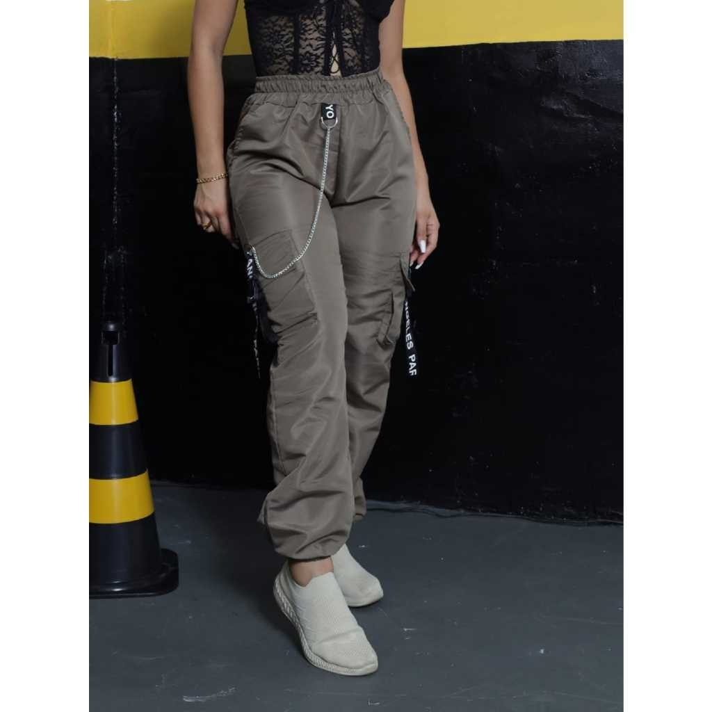 Calça Jogger Cargo bolsos laterais Feminina Com corrente e detalhe refletivo