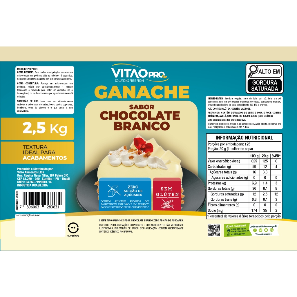 Ganache Chocolate Branco Zero Açúcar VitaoPRO 2,5 Kg