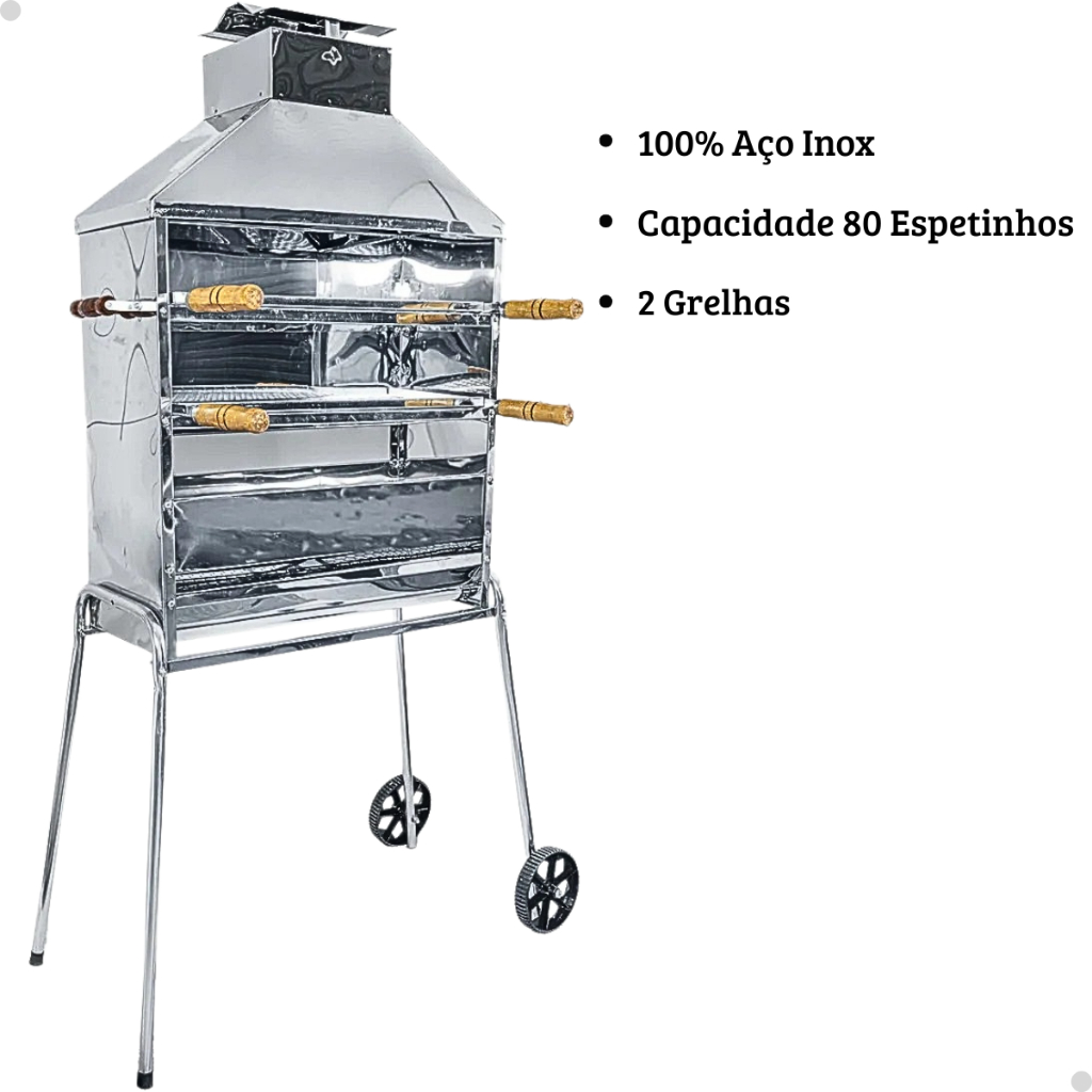 Churrasqueira Carrinho Espetinho Inox 80 Espetos Móvel 2 Grelhas