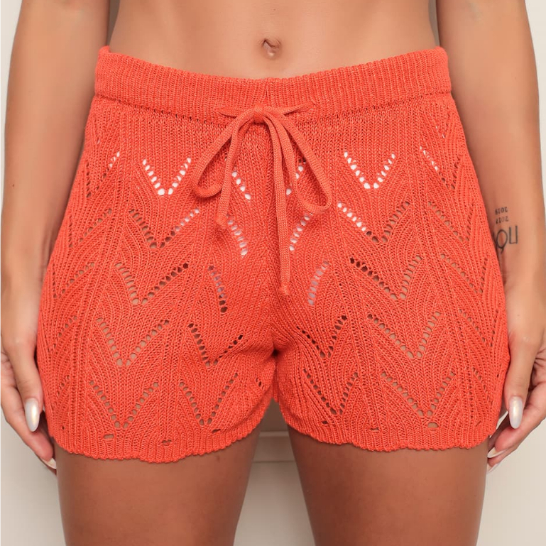 Short Saida De Praia Crochê Regulagem e Elástico na Cintura Trico Feminino Moda Praia