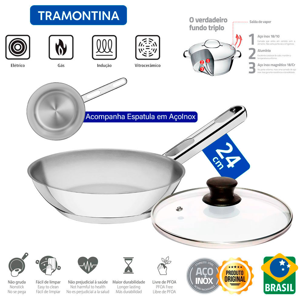 Frigideira com Tampa de Vidro 24cm Tramontina Allegra em Aço Inox e Indução 2,1L