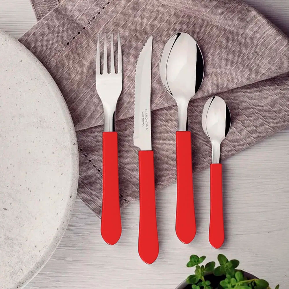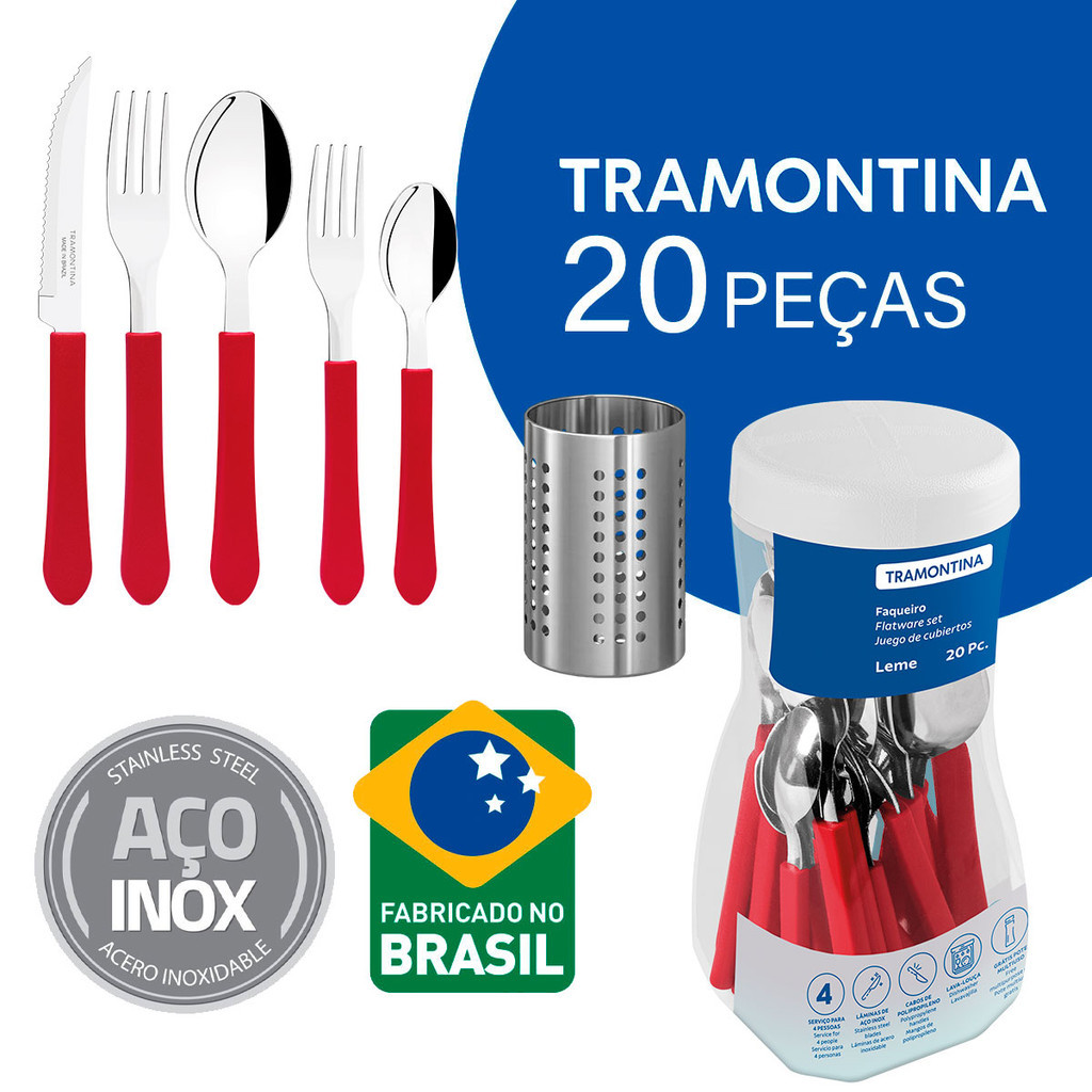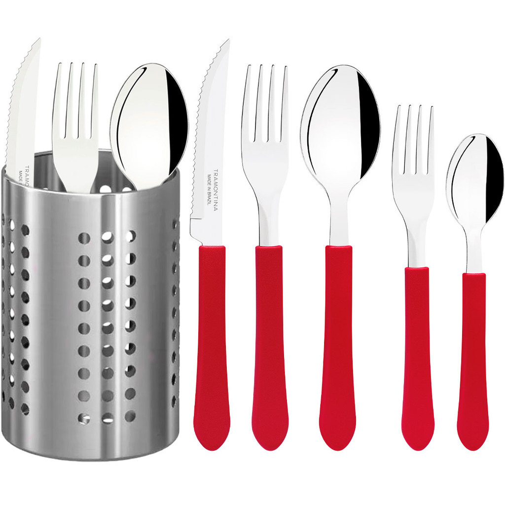 Conjunto De Talheres Tramontina Inox Leme Vermelho 20 Peças Com Suporte De Talheres Inox