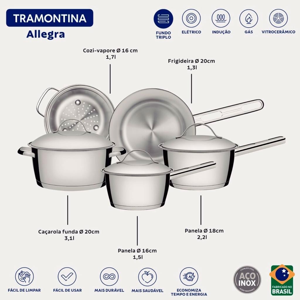 Jogo de Panelas Tramontina Allegra Aço Inox e Indução com Jogo de Potes Herméticos Electrolux 8pçs