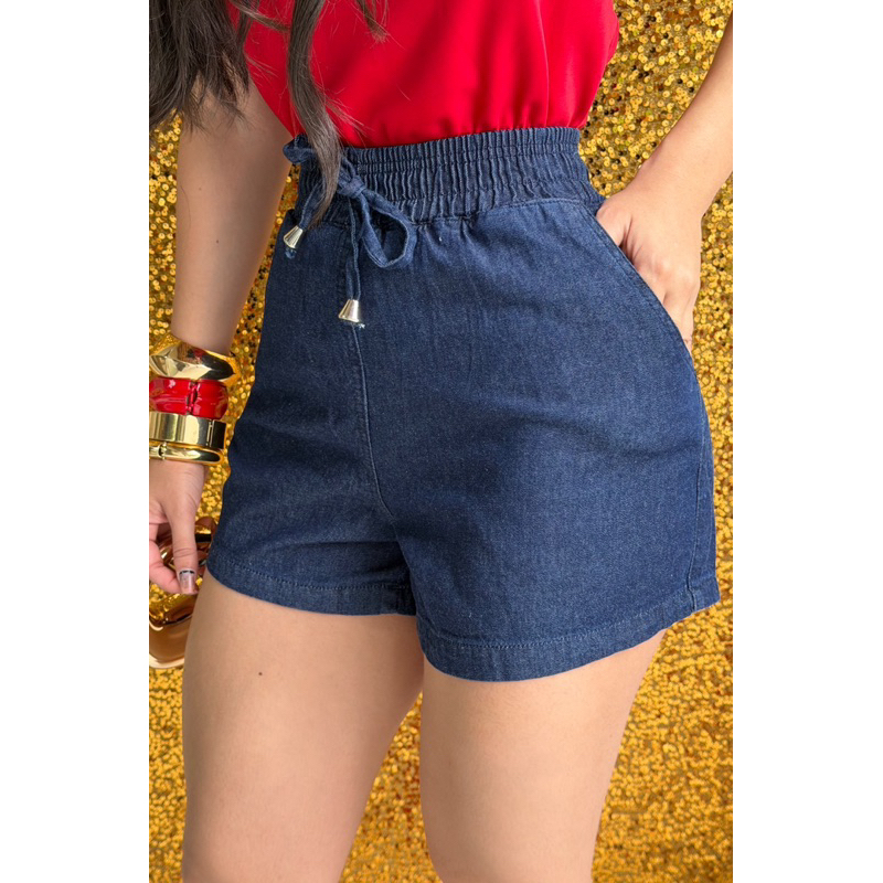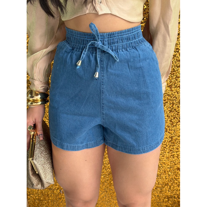 Shorts Feminino Jeans Claro Cintura Alta com elástico e cordão, Casual, Confortável, Moda Verão
