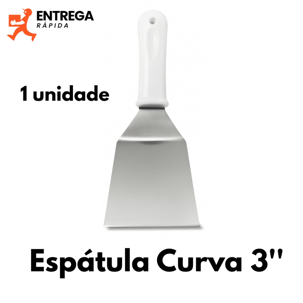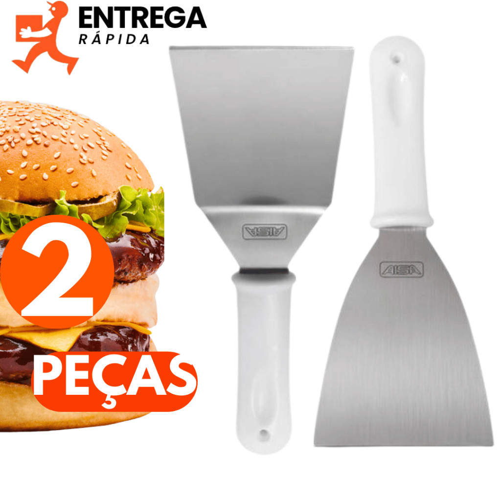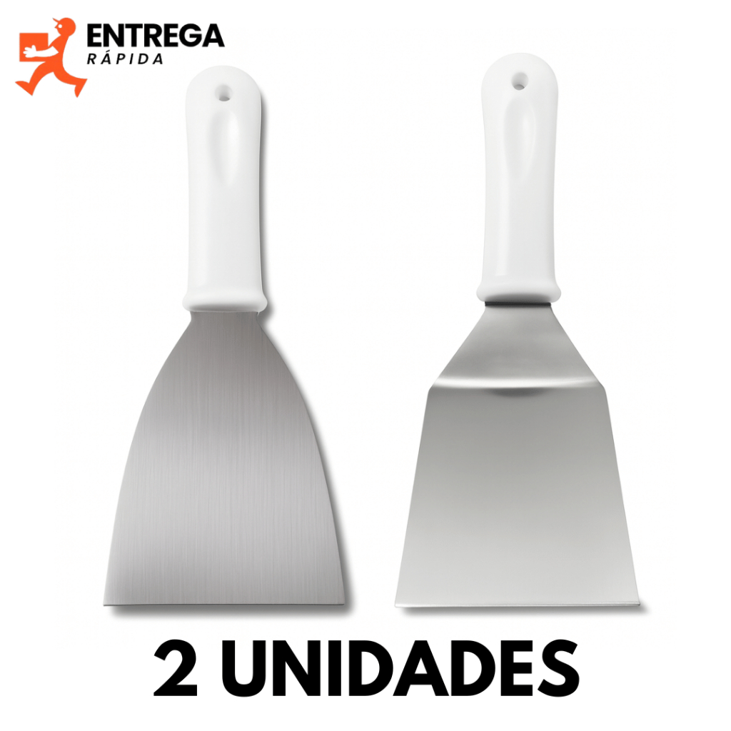 Kit 2 Espátulas Inox Cabo Branco 3” Curva e 4” Reta para Chapa Lanche Hambúrguer Grelhados