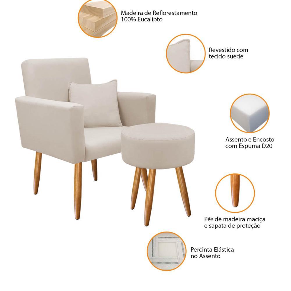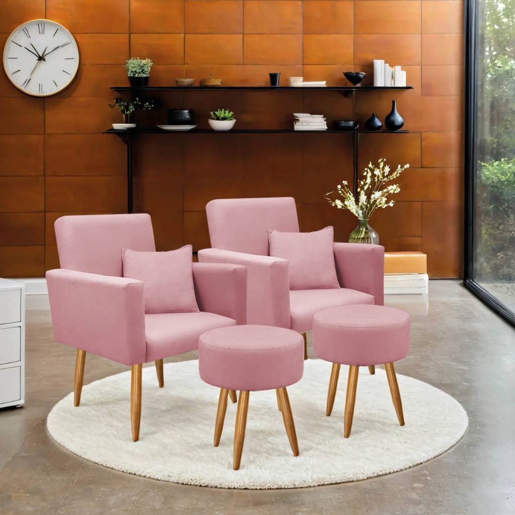 Conjunto 02 Poltronas Decorativas para Sala Nina com Almofadas e 02 Puff Redondo Suede Aninha Decor