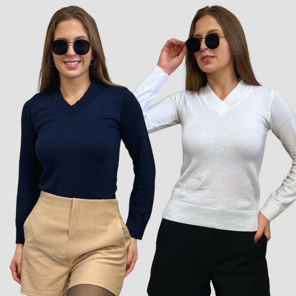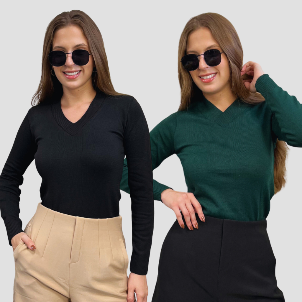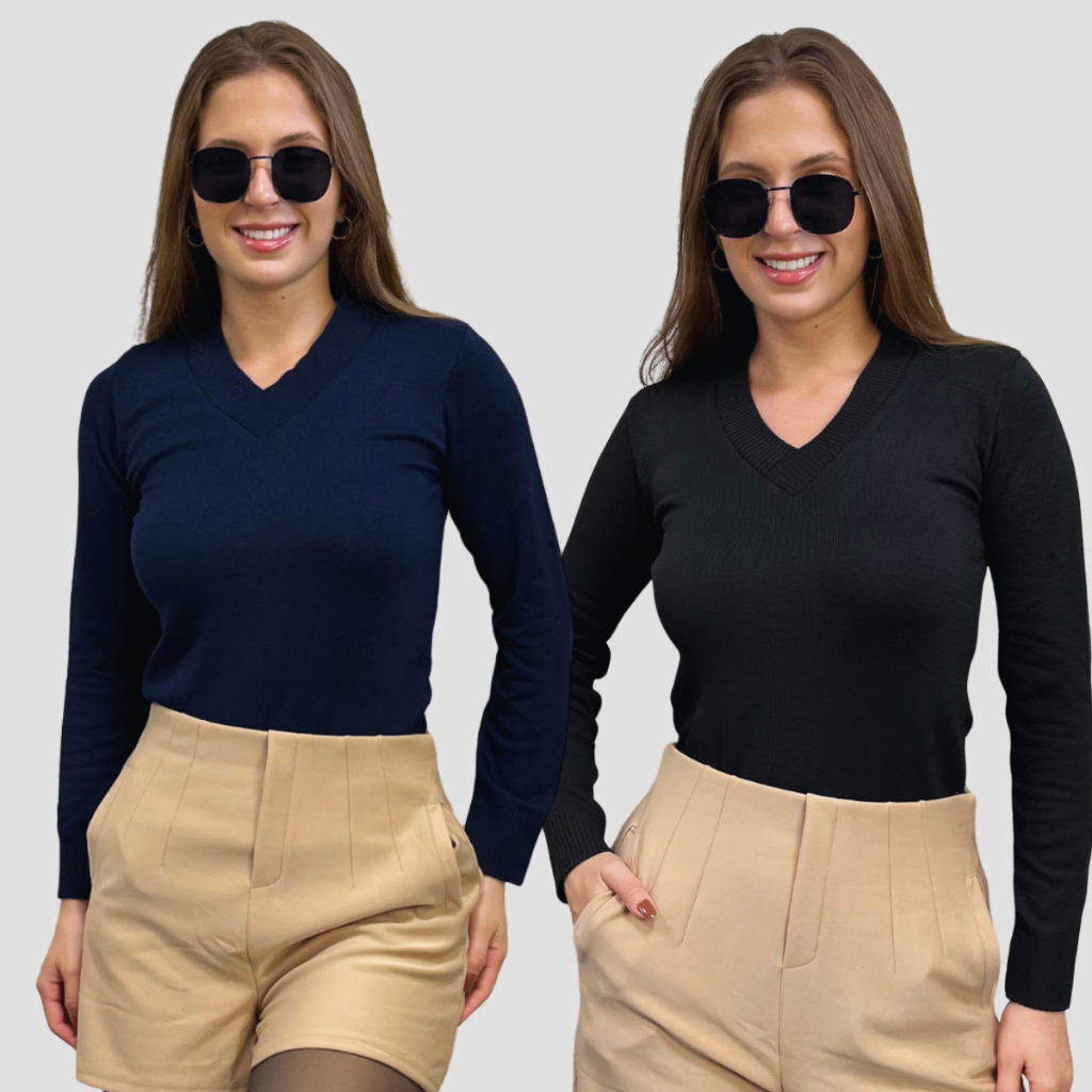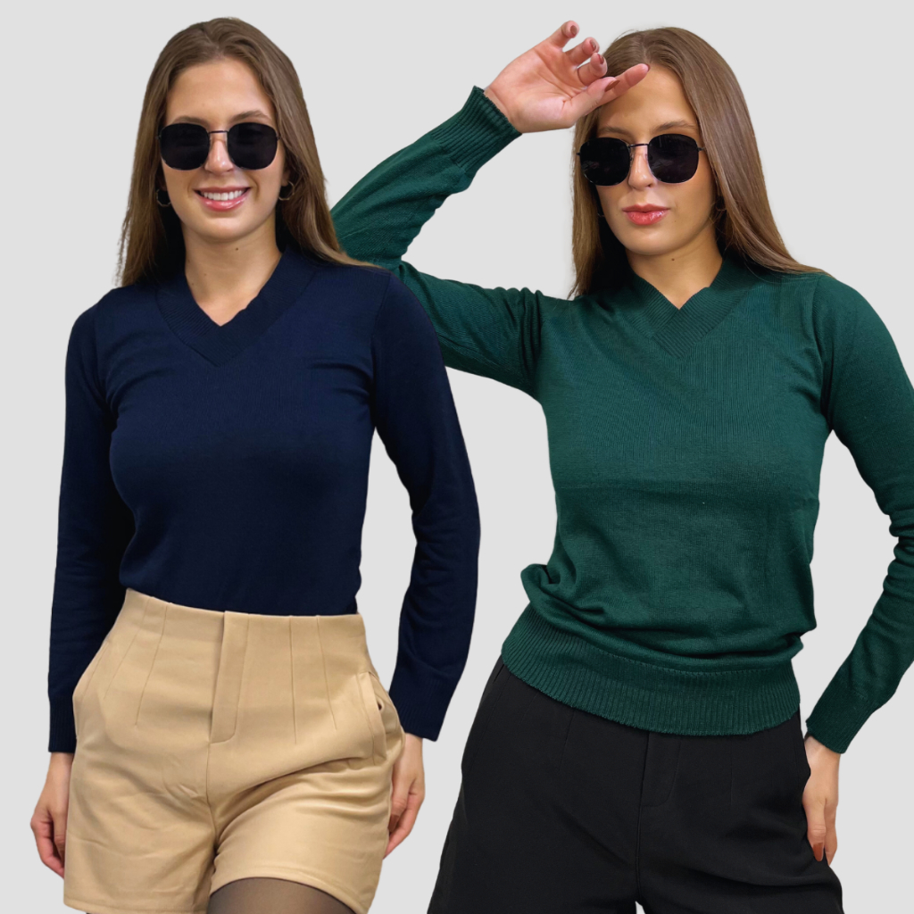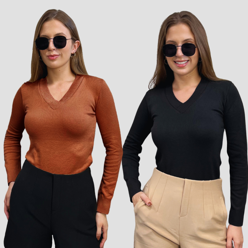 Kit 2 Blusa Feminina De Frio Tricô Suéter Feminino Manga Longa Decote V Lã Elastano