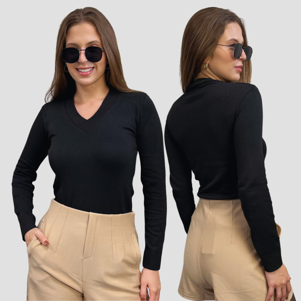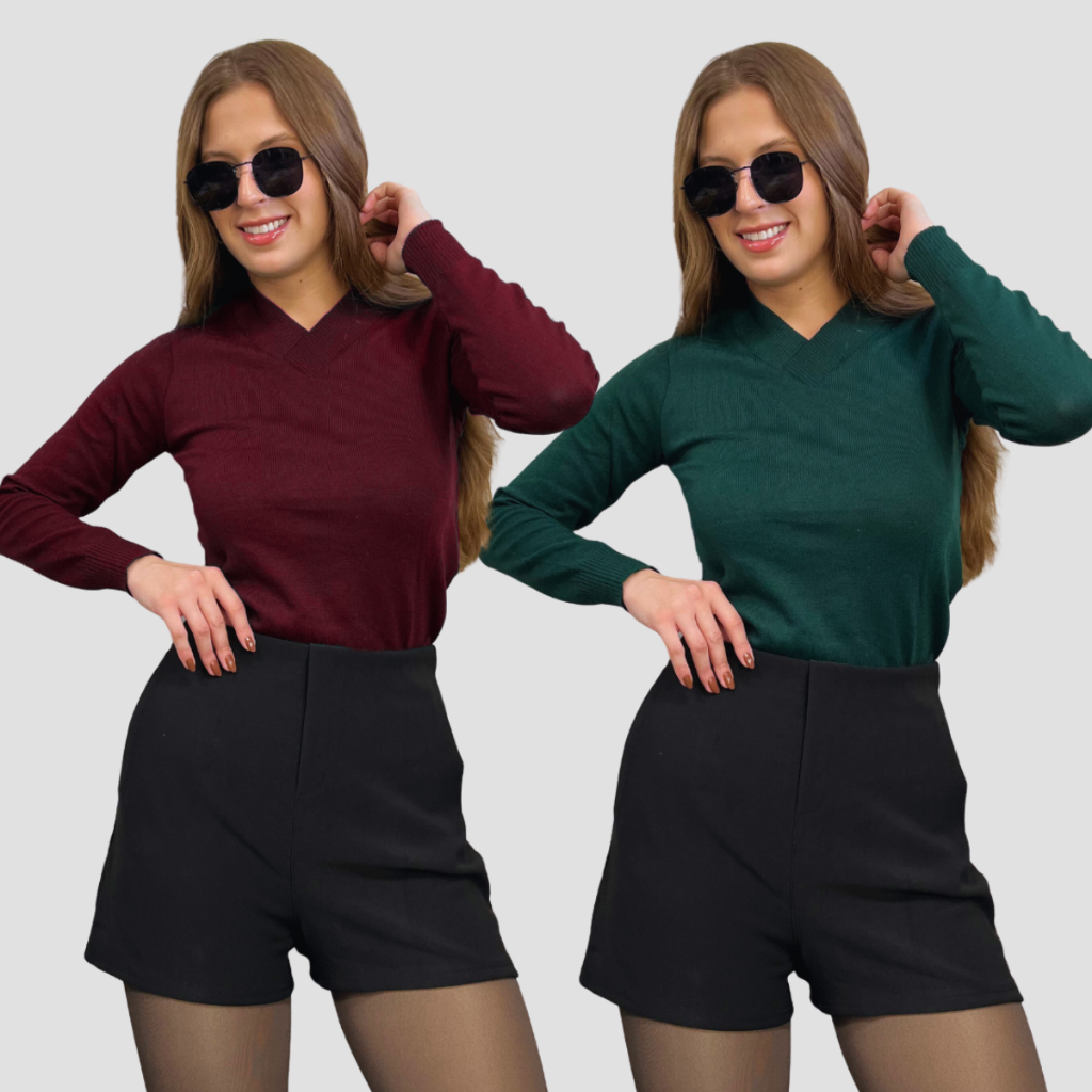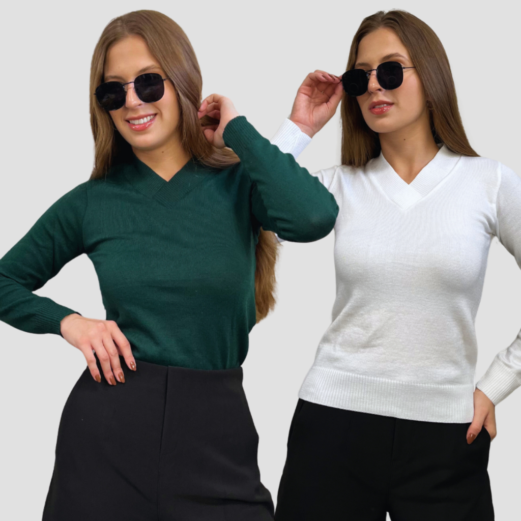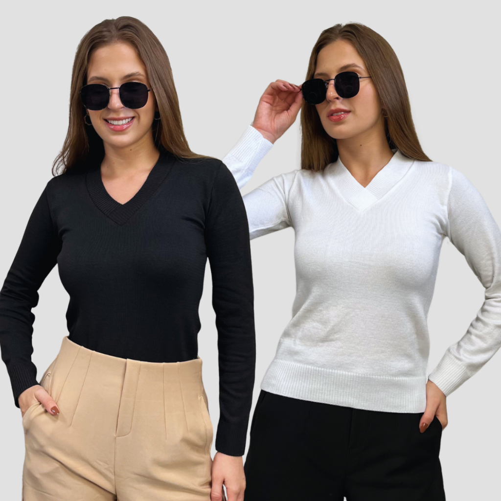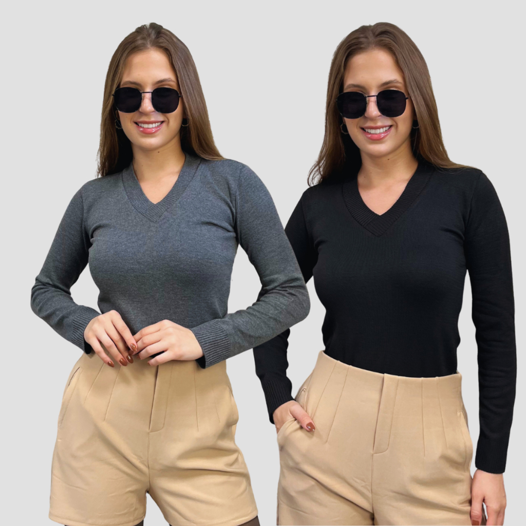 Kit 2 Blusa Feminina De Frio Tricô Suéter Feminino Manga Longa Decote V Lã Elastano
