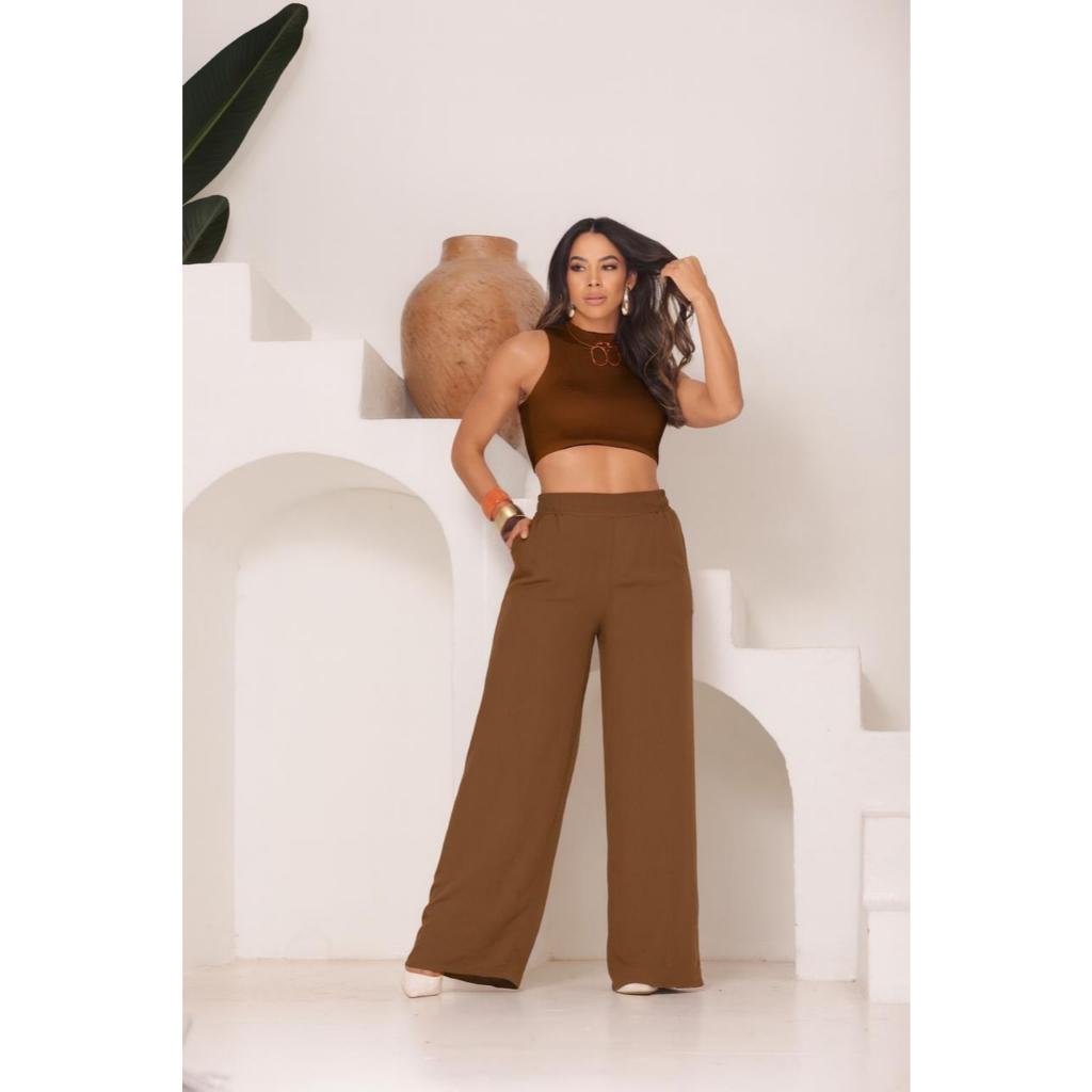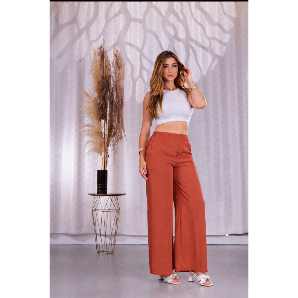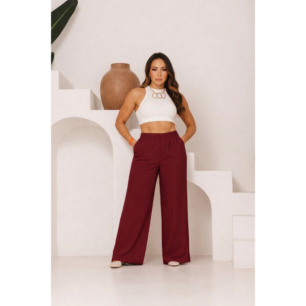 Calça Pantalona Feminina Viscolinho Elástico Na Cintura Com Bolso Cintura Estilo Alfaiataria forrada