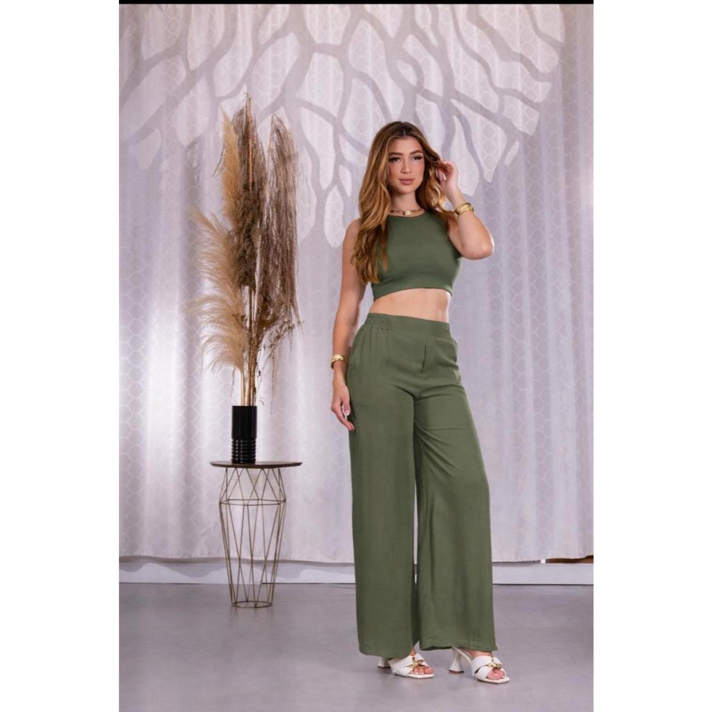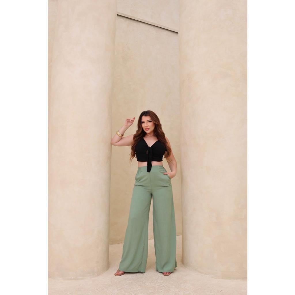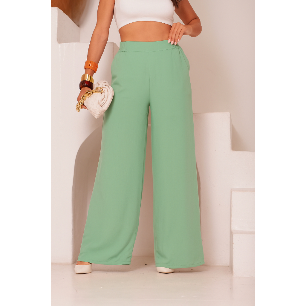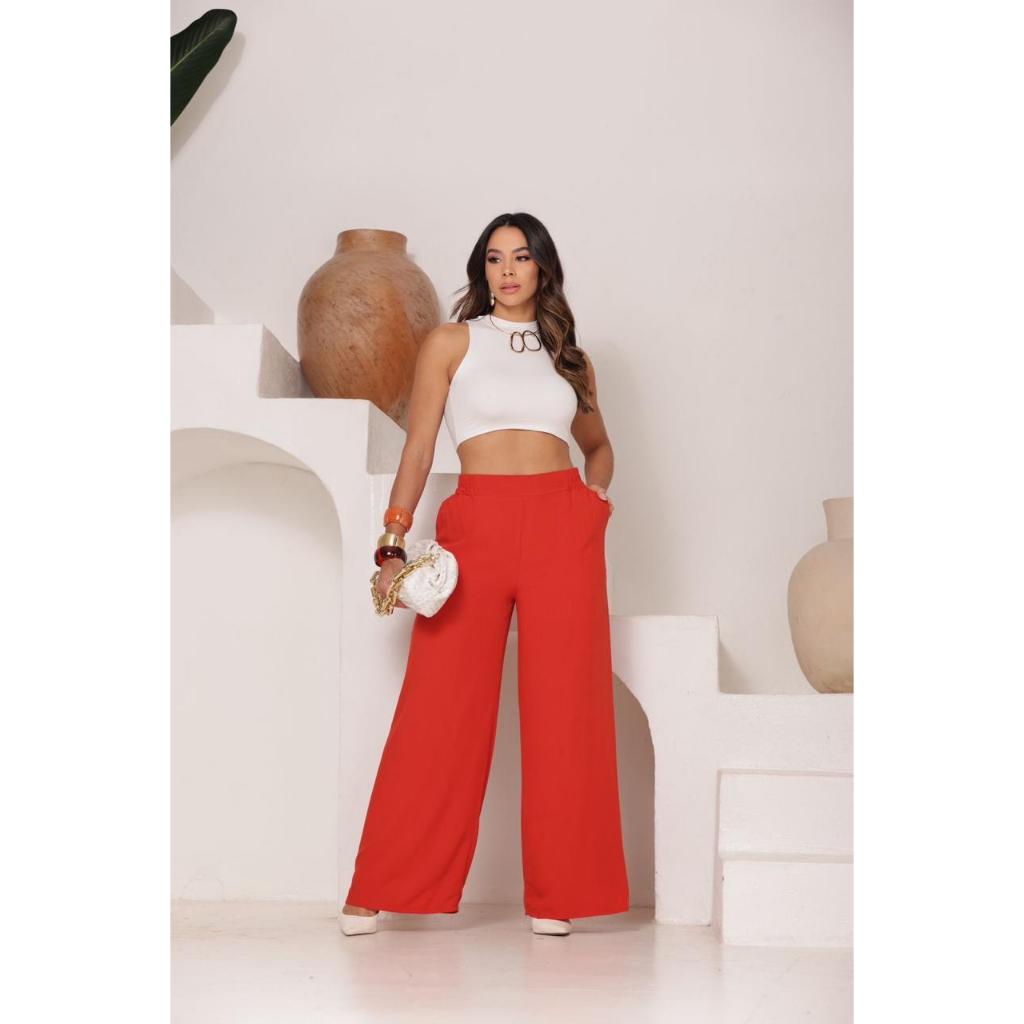 Calça Pantalona Feminina Viscolinho Elástico Na Cintura Com Bolso Cintura Estilo Alfaiataria forrada