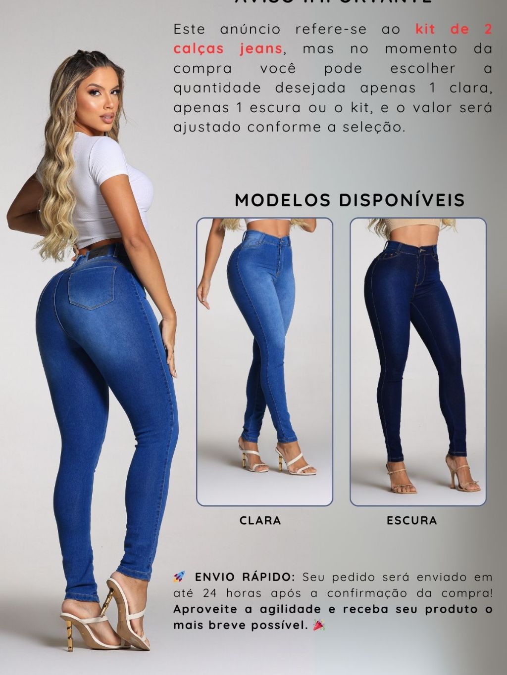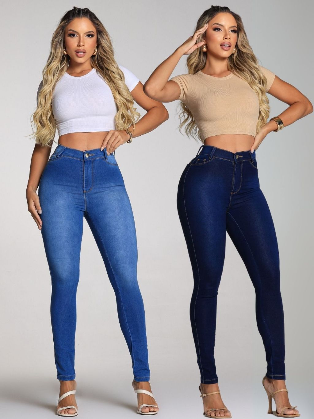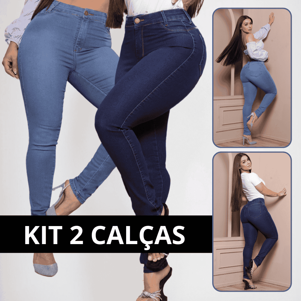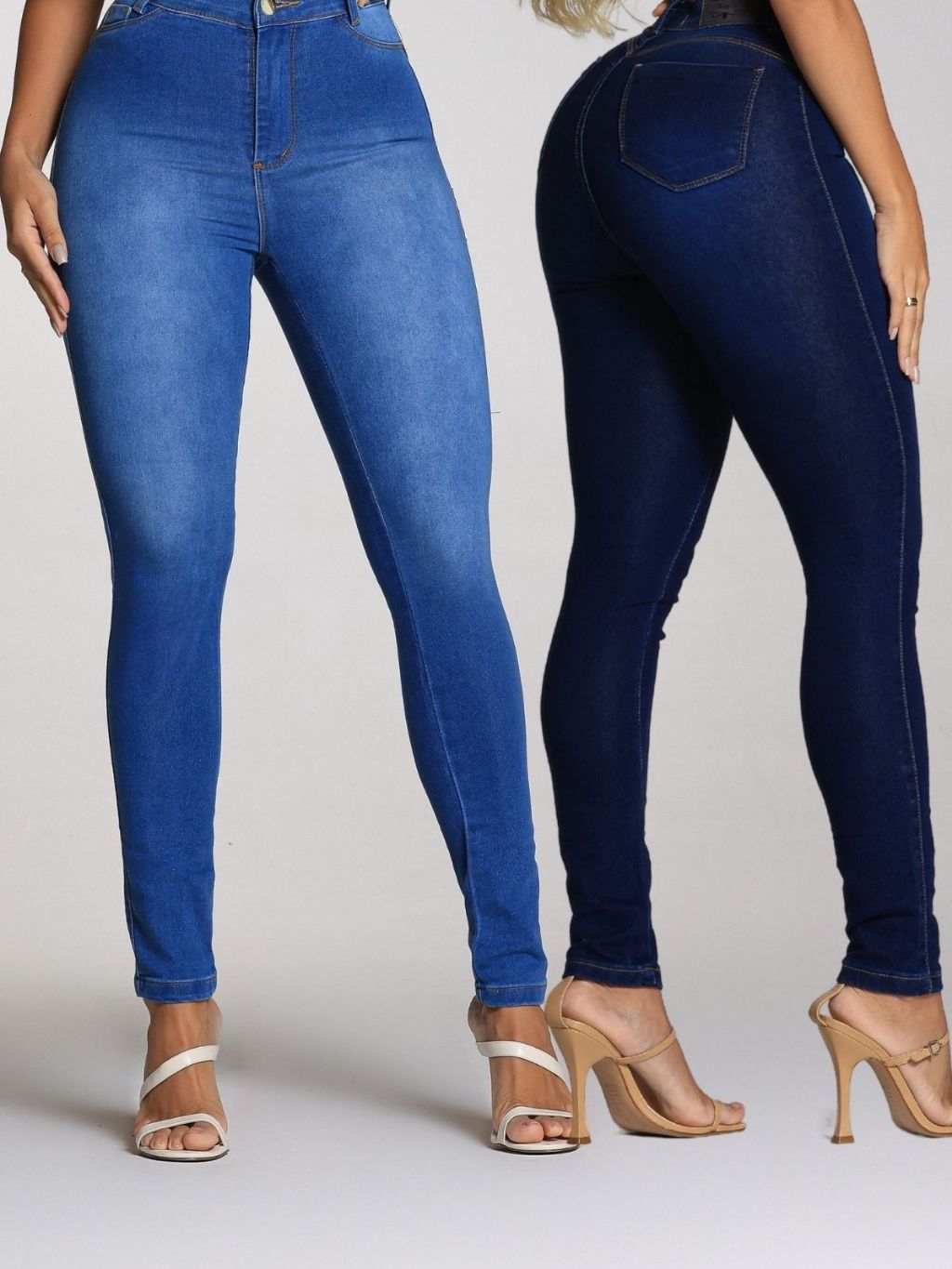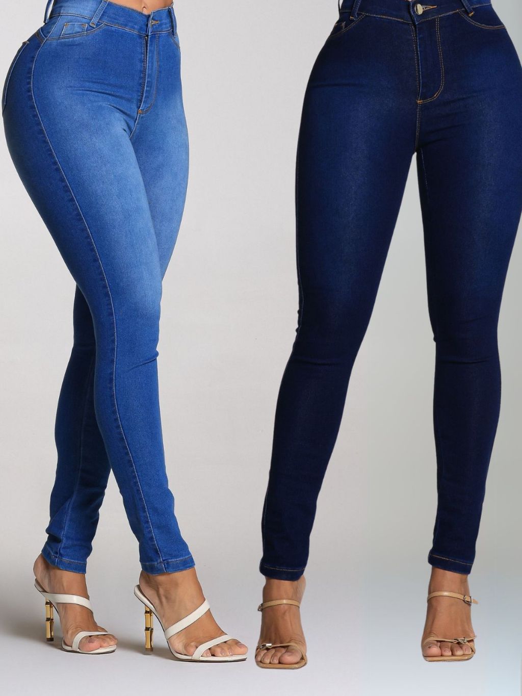 Kit 2 Calças Jeans Feminina Skinny Cintura Alta Lycra Confortável Levanta Bumbum Modeladora