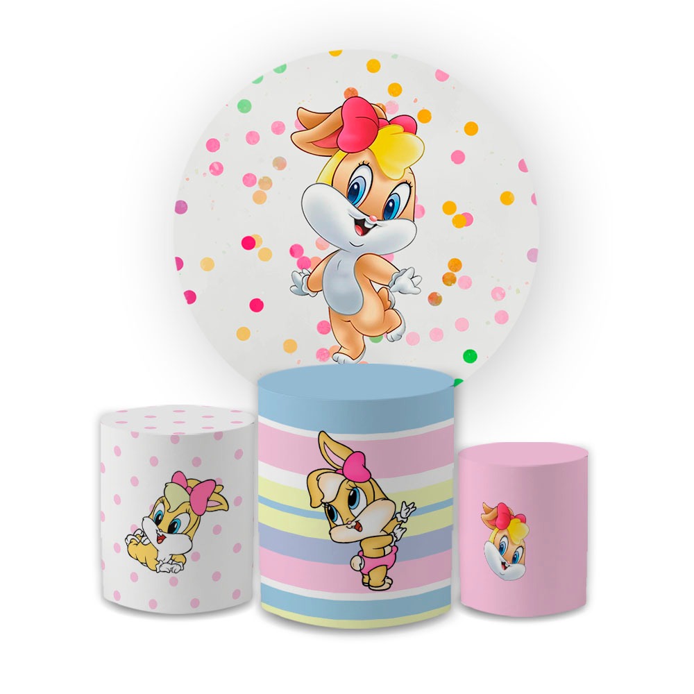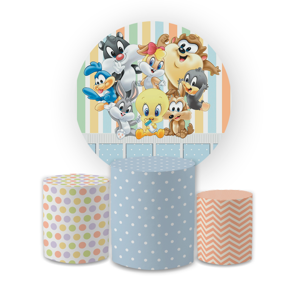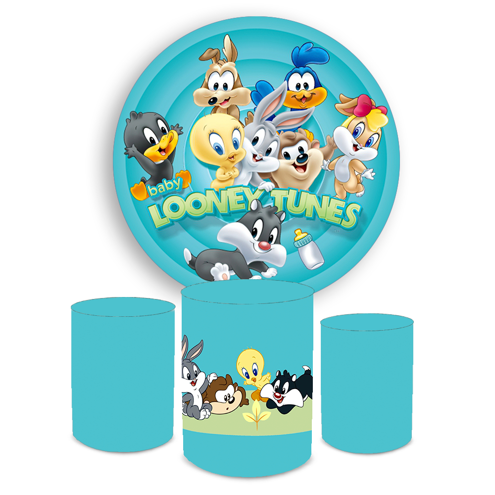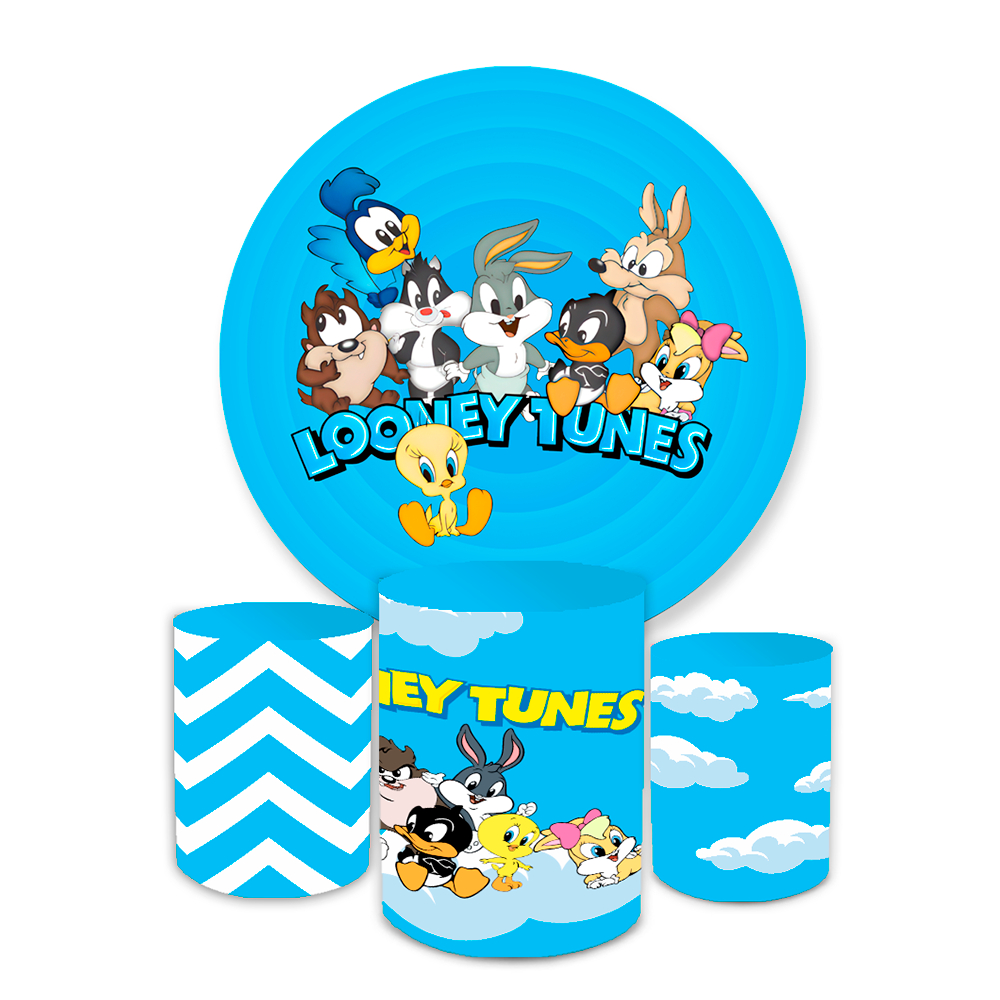 Kit Capa Painel de Festa Redondo + Trio Capas de Cilindro Sublimado Tema L00ney Tones Desenho Infantil