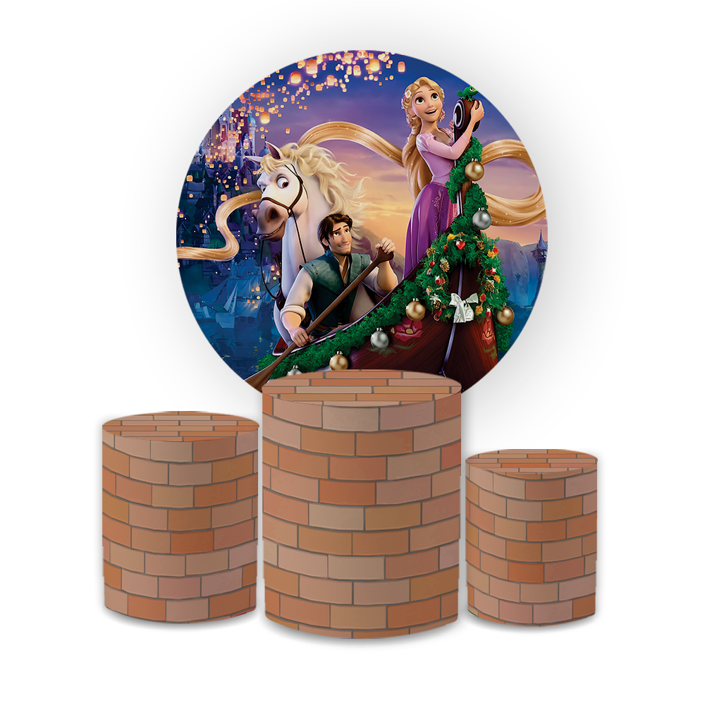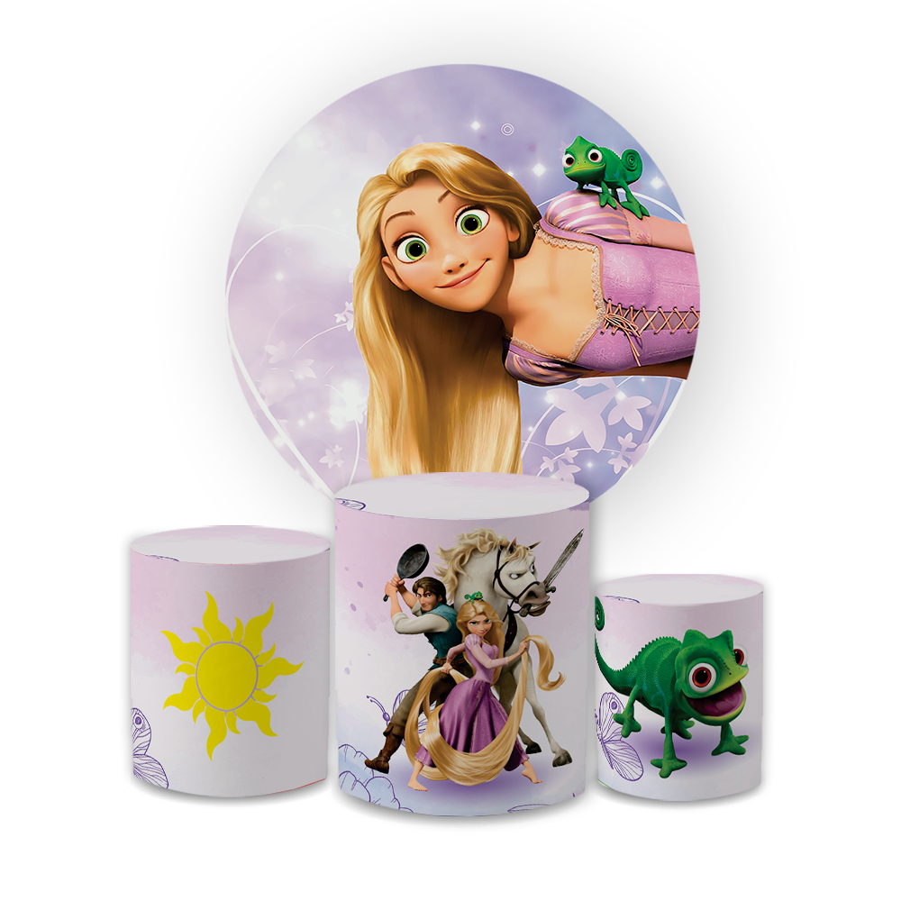 Capa Painei de Festa Veste Fácil Redondo+ Cilindro Sublimado Malha New Tema Enrolads Rapnzel Decorativo Bibi Paineis