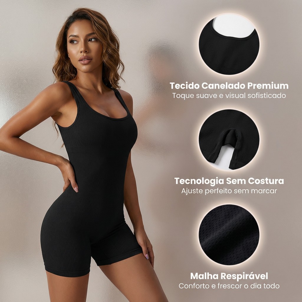 Macacão Feminino Canelado Sem Costura para Academia Body com Shorts Respirável Modelador Levanta Bumbum