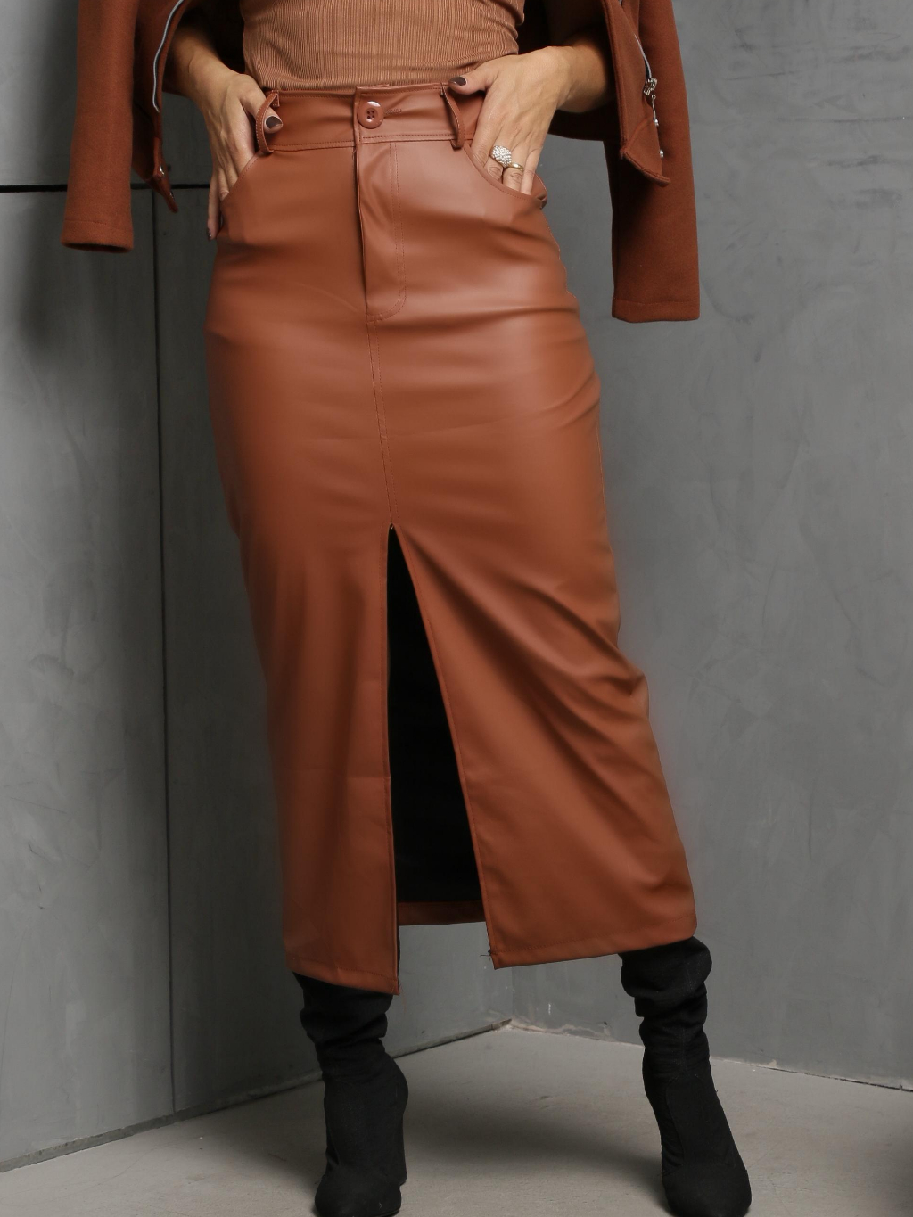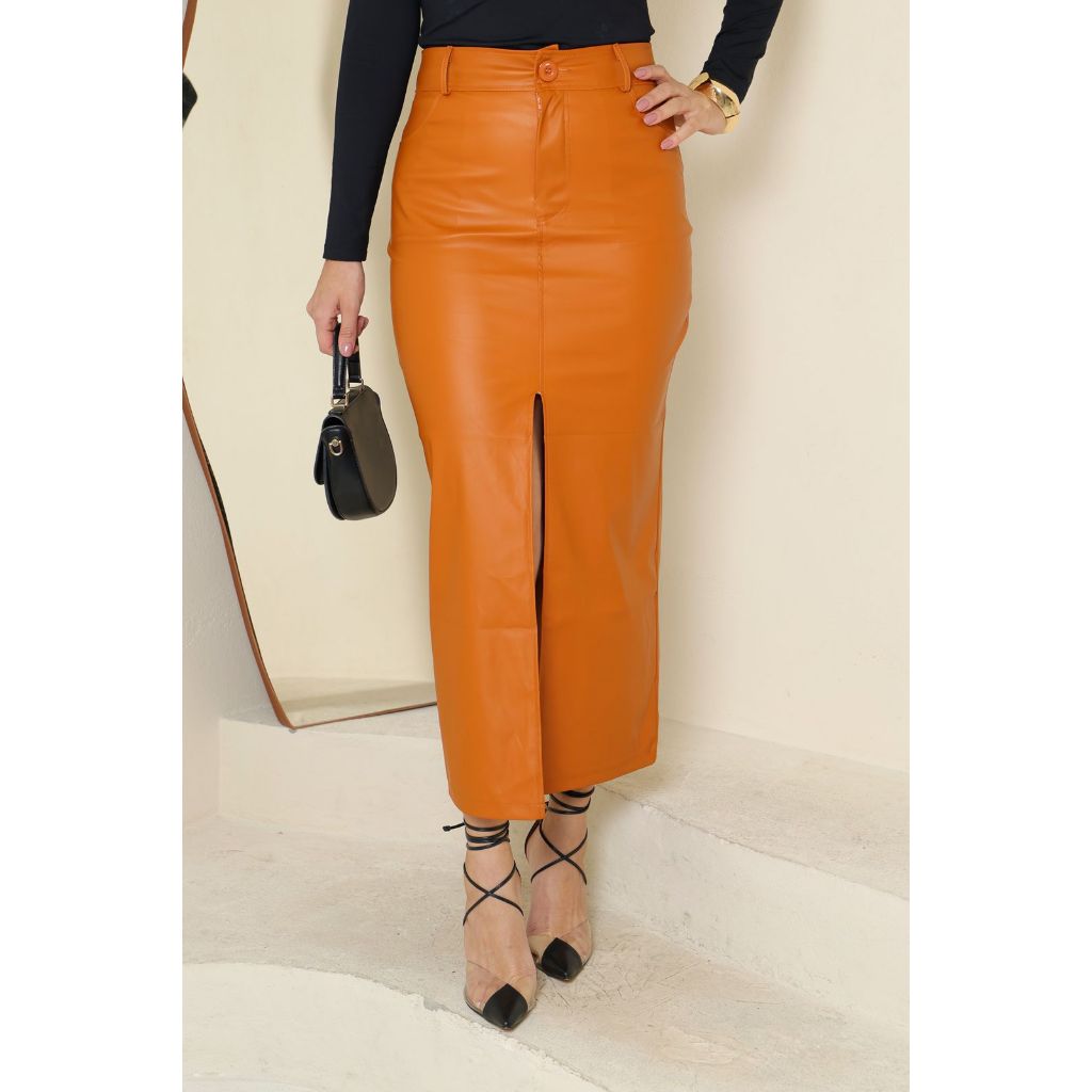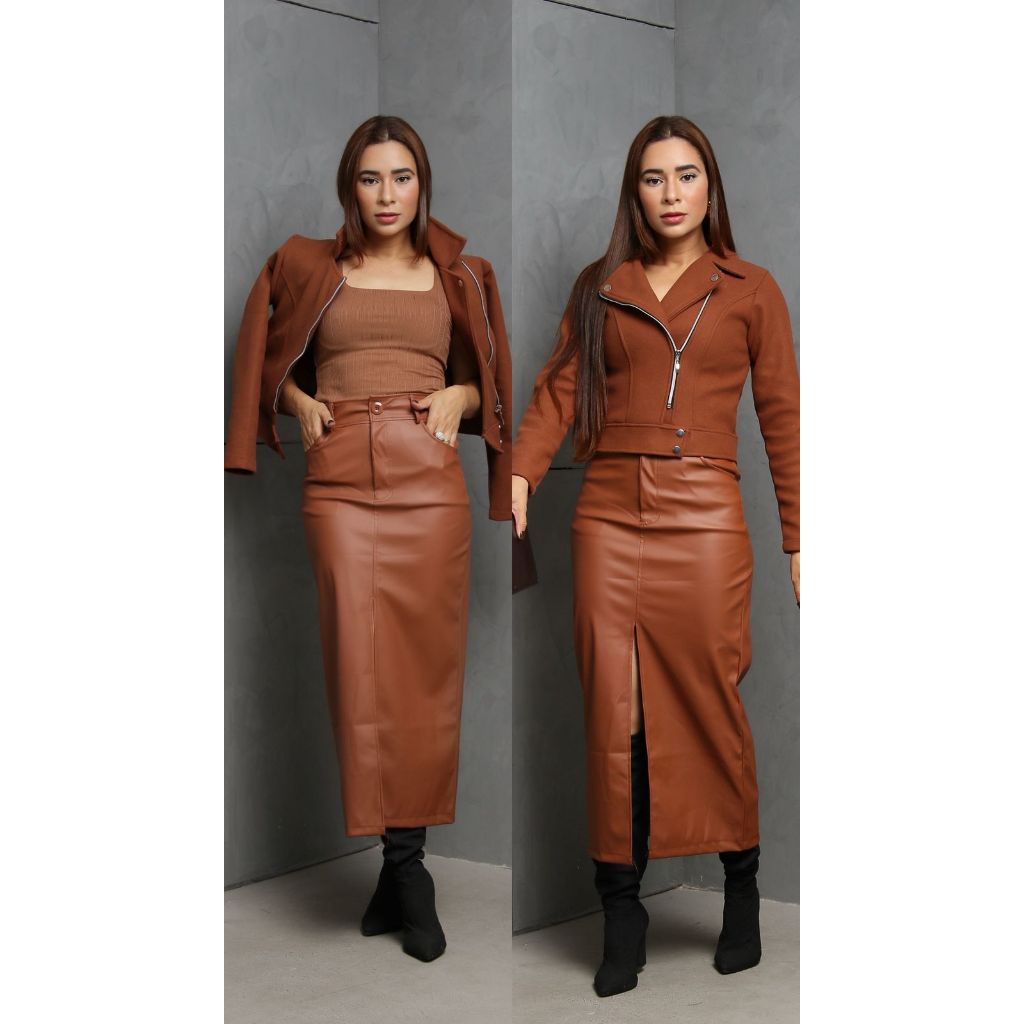 SAIA LONGA COM FENDA TECIDO EM COURO FAKE SÚPER ELEGANTE