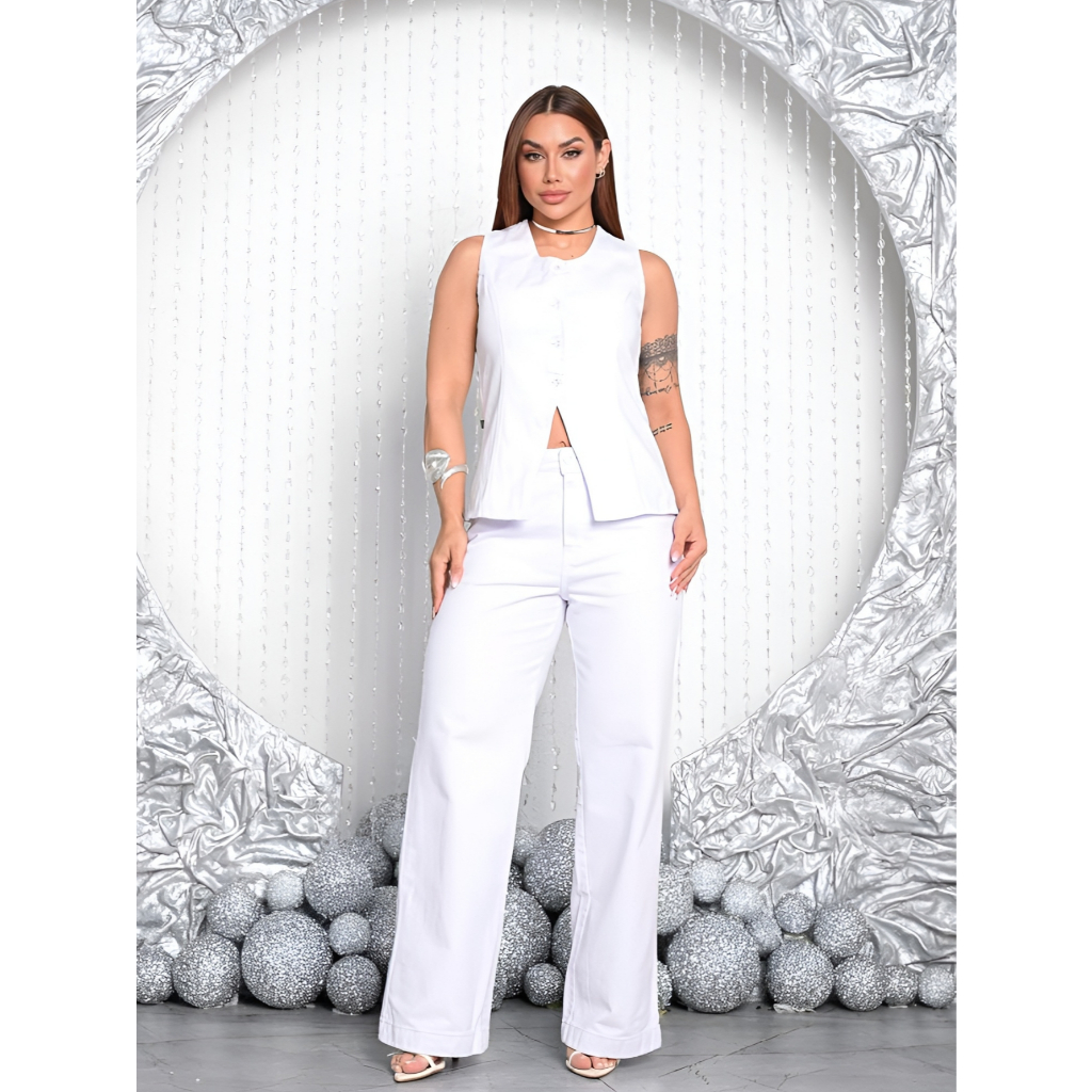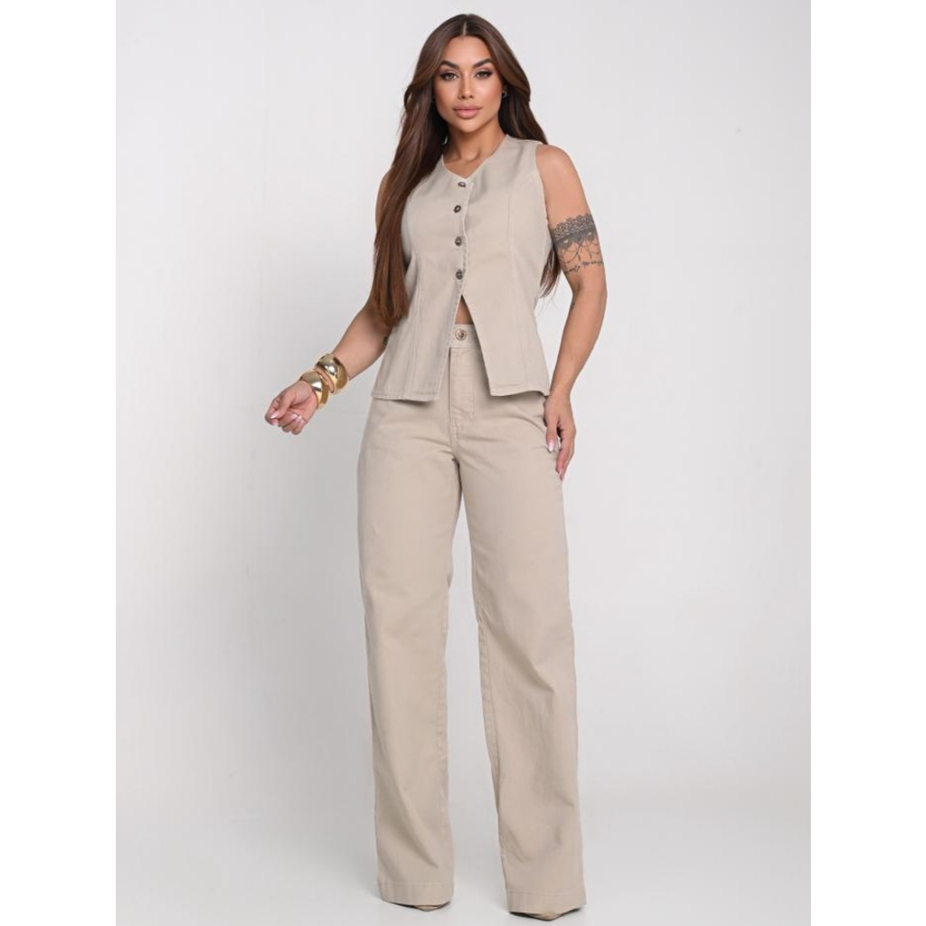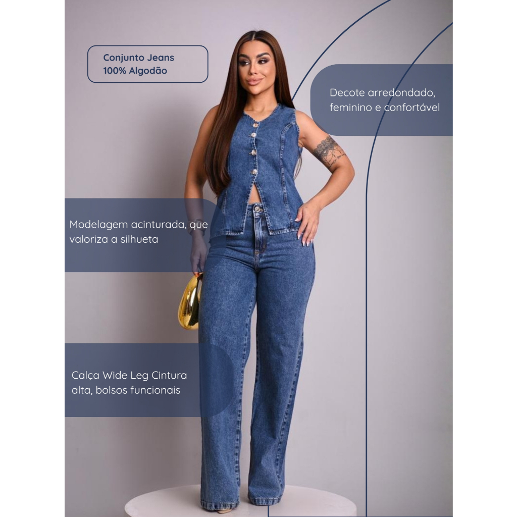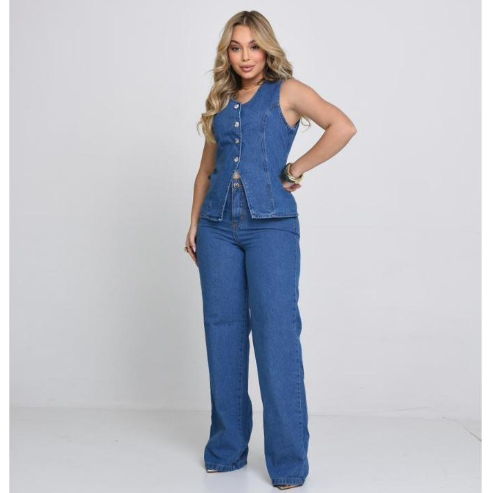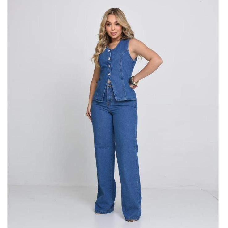 Conjunto Jeans Enny Feminino Verão Calça Wide Leg e Colete Collen Elegante e Sofisticado