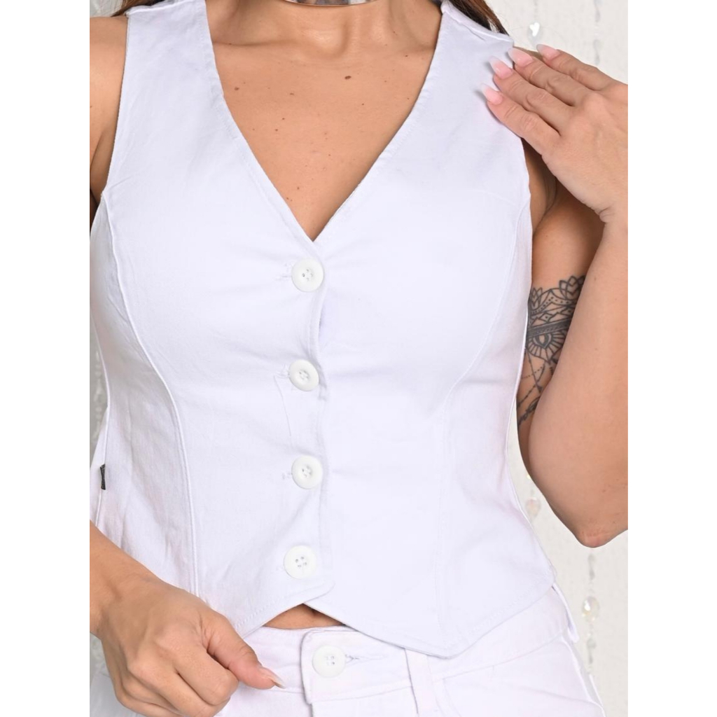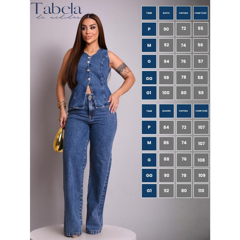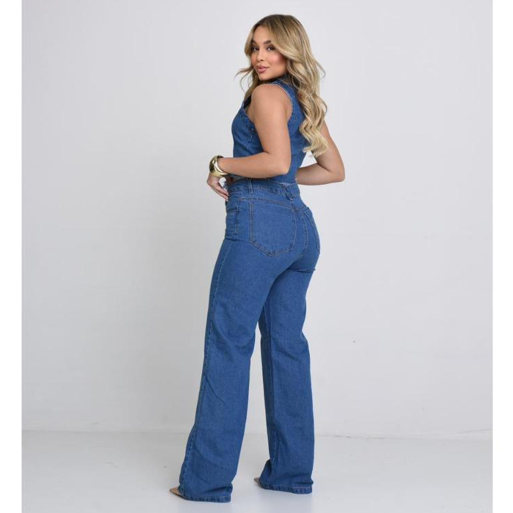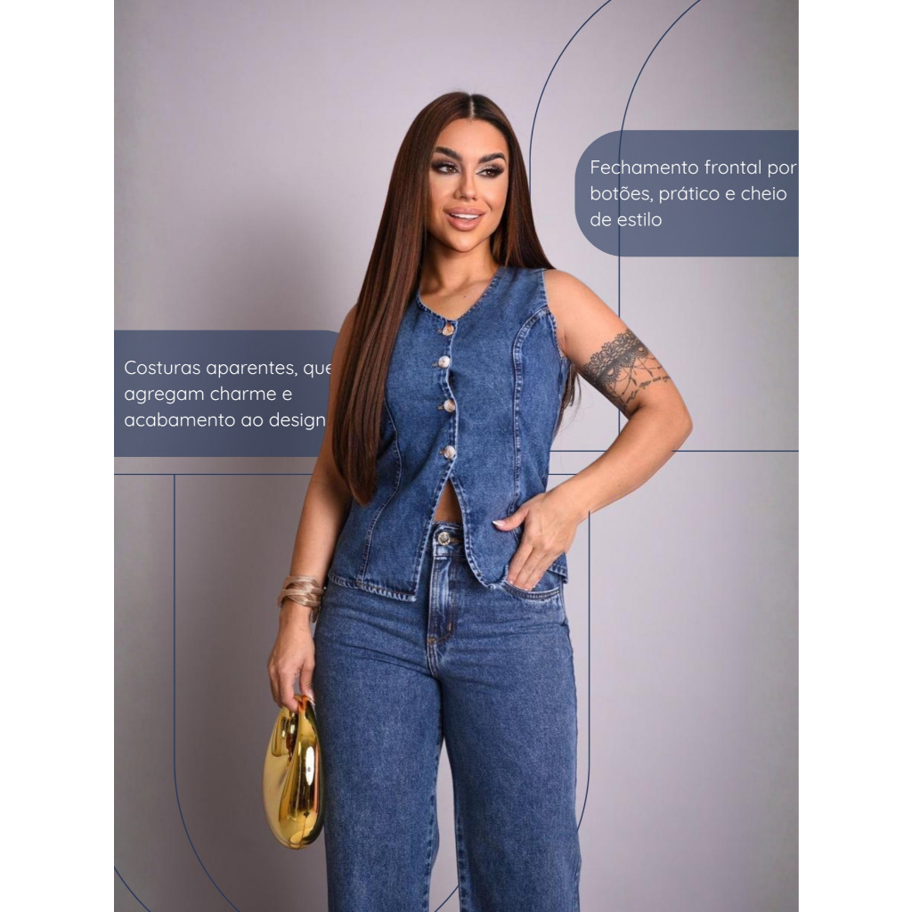 Conjunto Jeans Enny Feminino Verão Calça Wide Leg e Colete Collen Elegante e Sofisticado