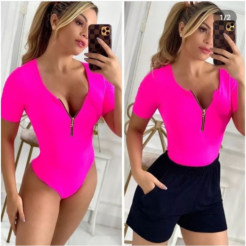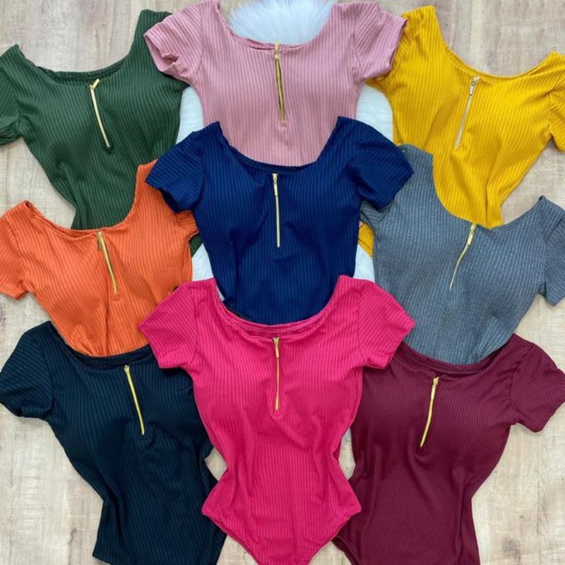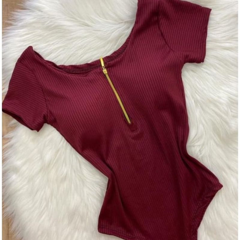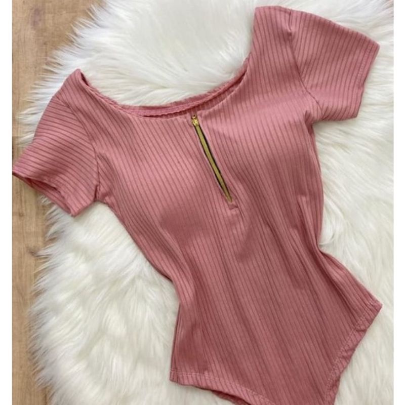 body decote zíper manga curta com bojo malha canelada