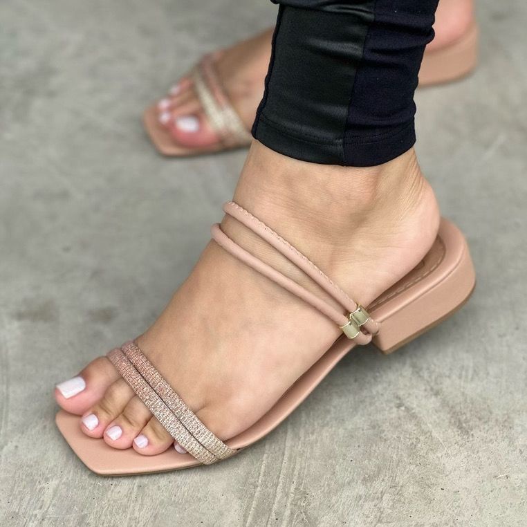 Sandália Feminina Com Salto Grosso Baixo De Brilho Bloco Tamanco Saltinho Confortável
