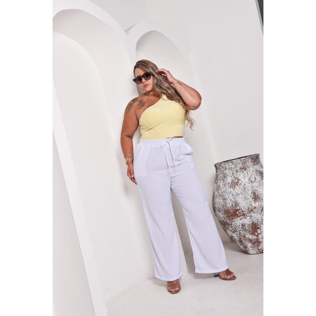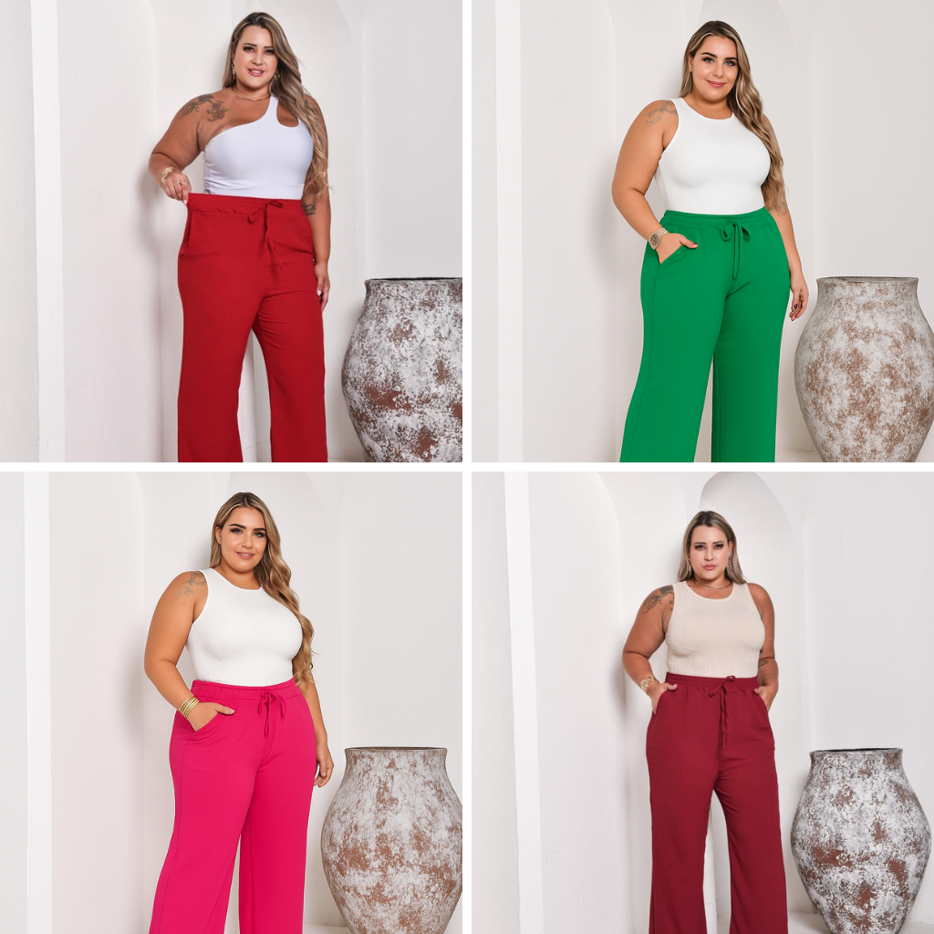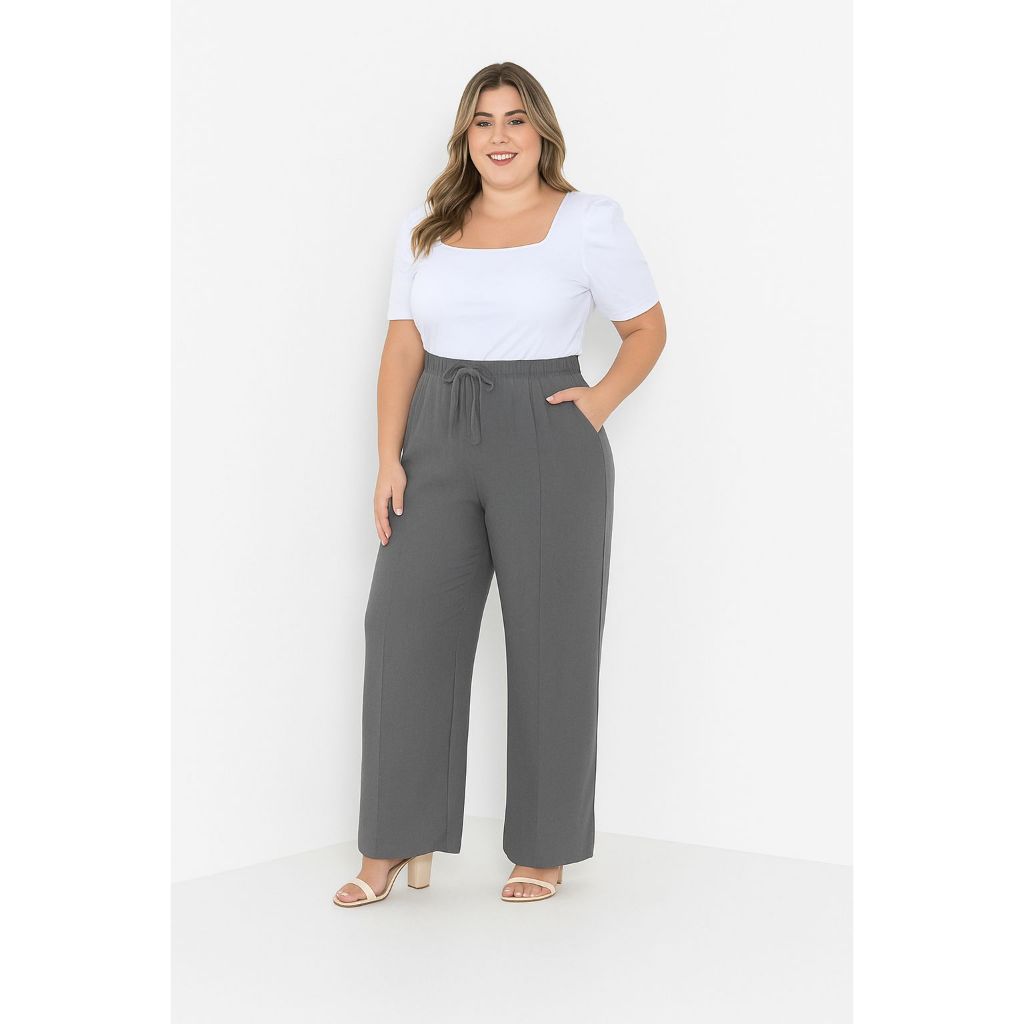 Wide Leg Calça Pantalona Feminina Plus Size Alfaitaria Duna Cintura Alta Com Elástico e Bolso Social