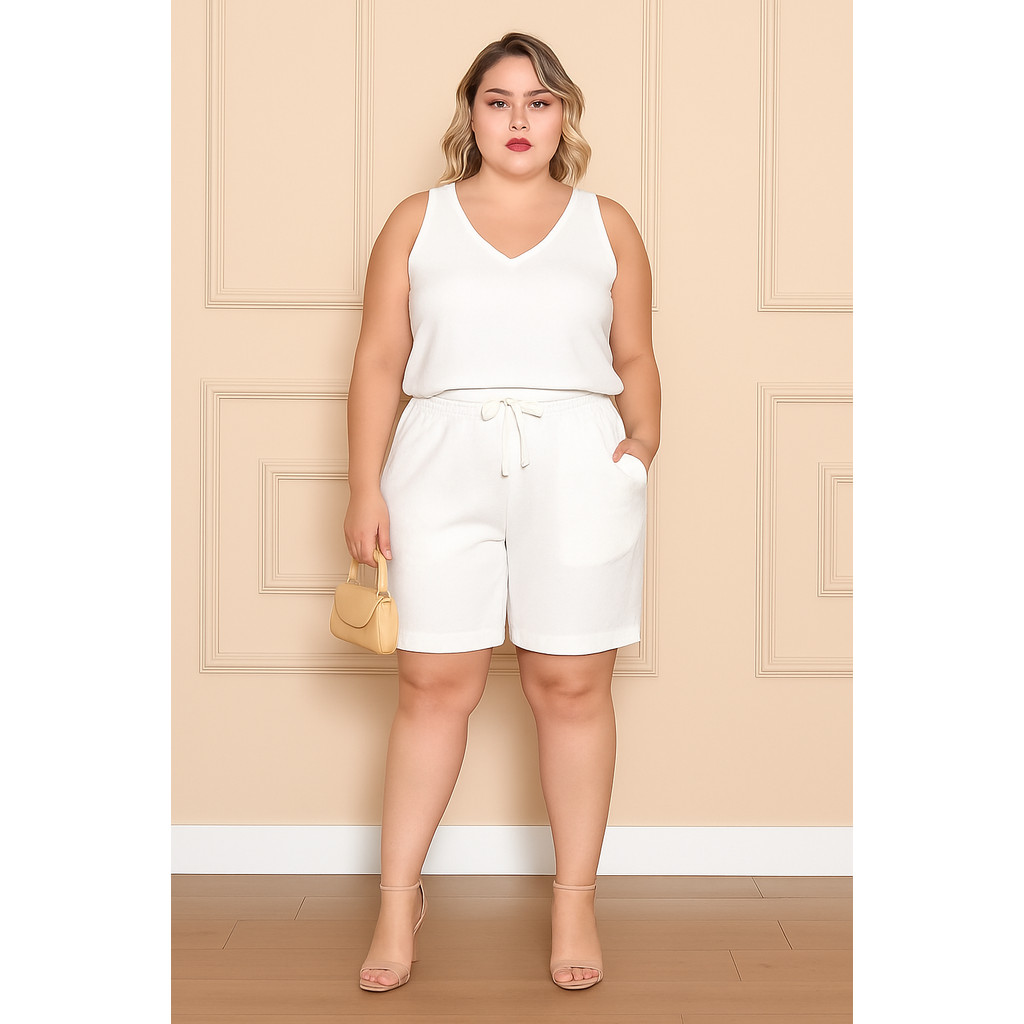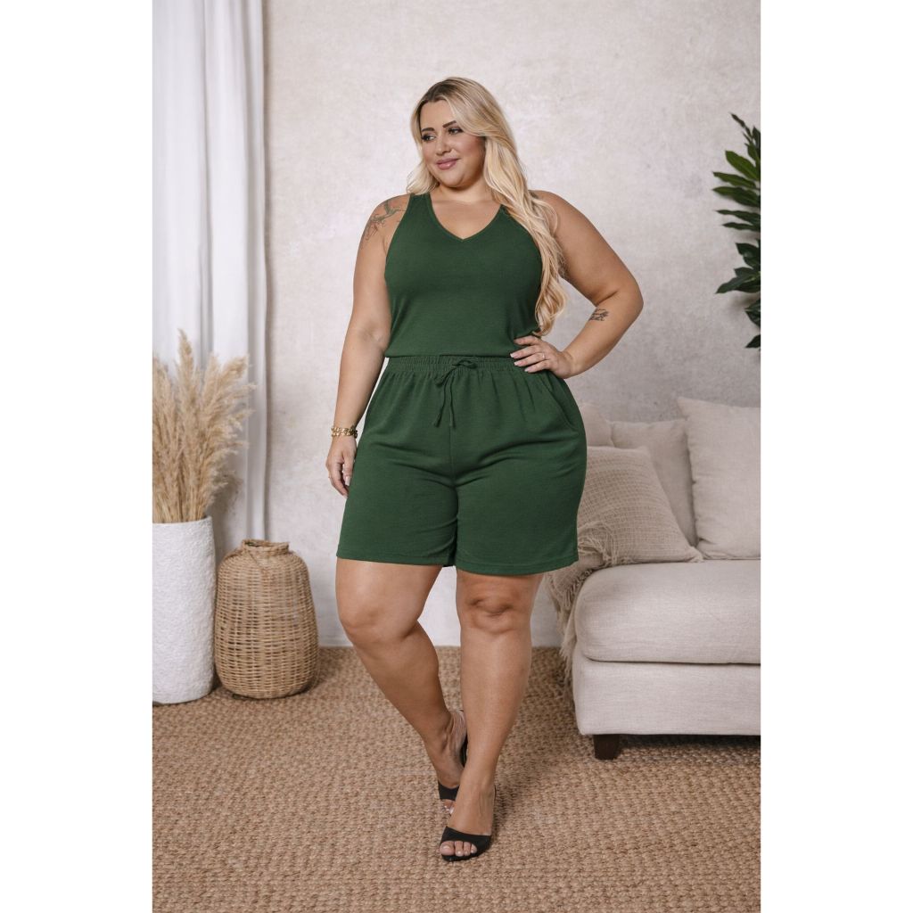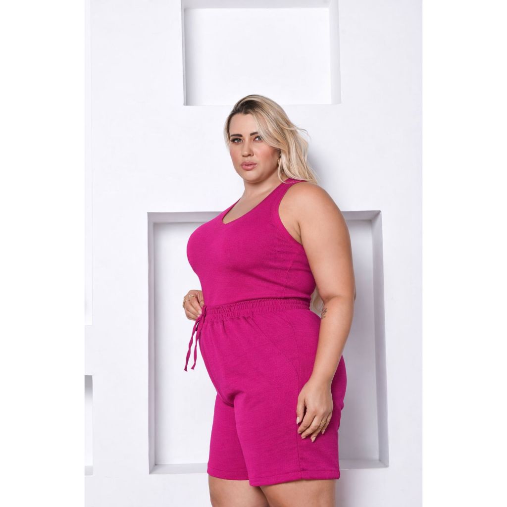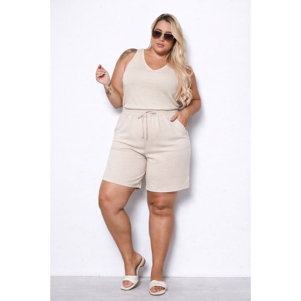 Kit Blusa e Bermuda Feminina Regata Alça Grossa Duna Tendência Cintura Alta Cordão Moda Verão