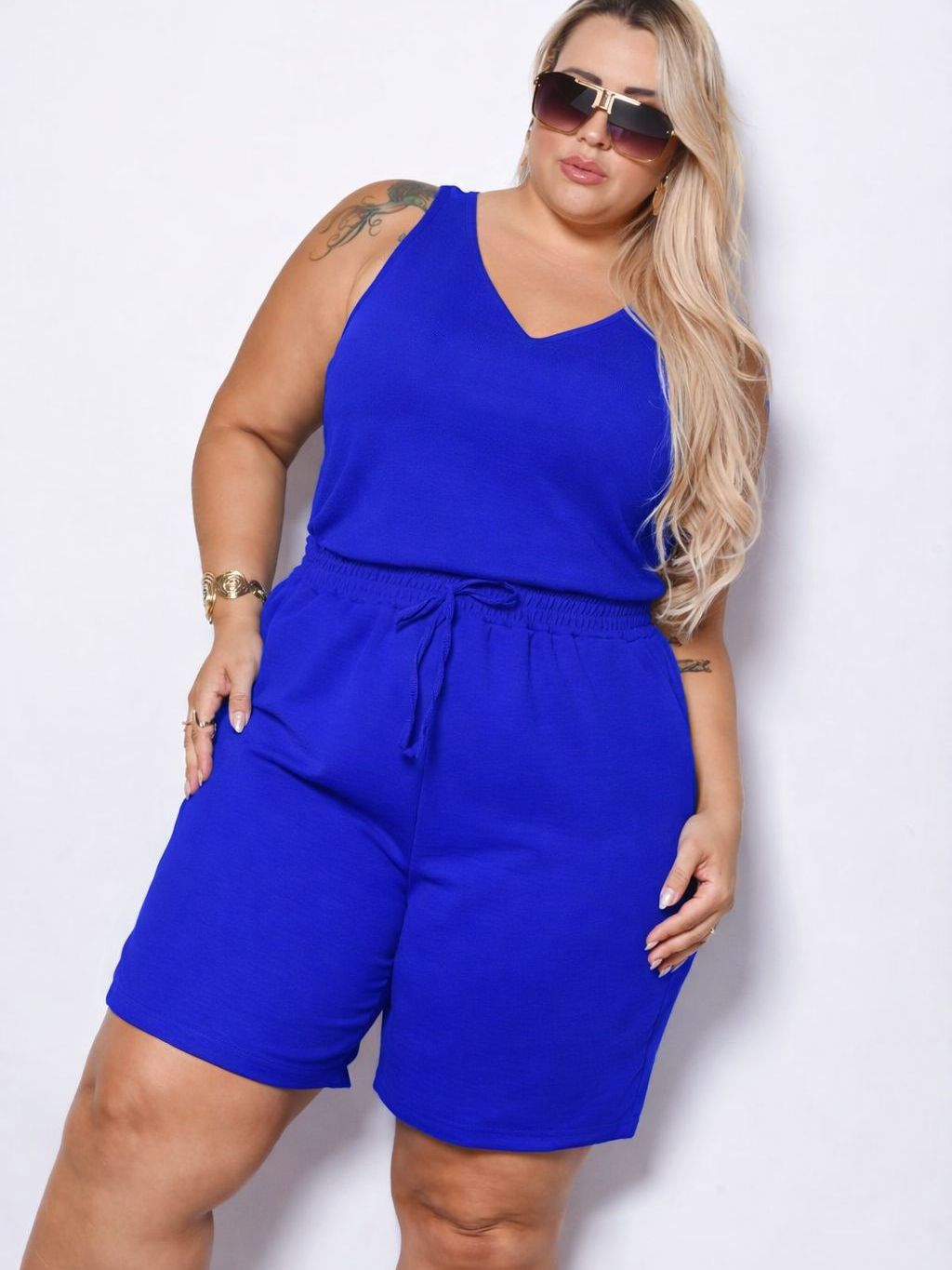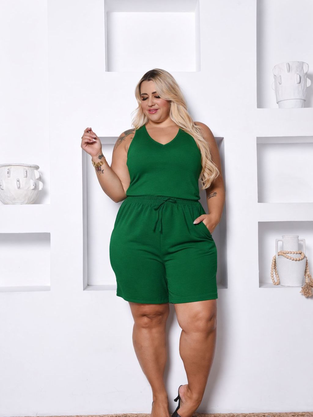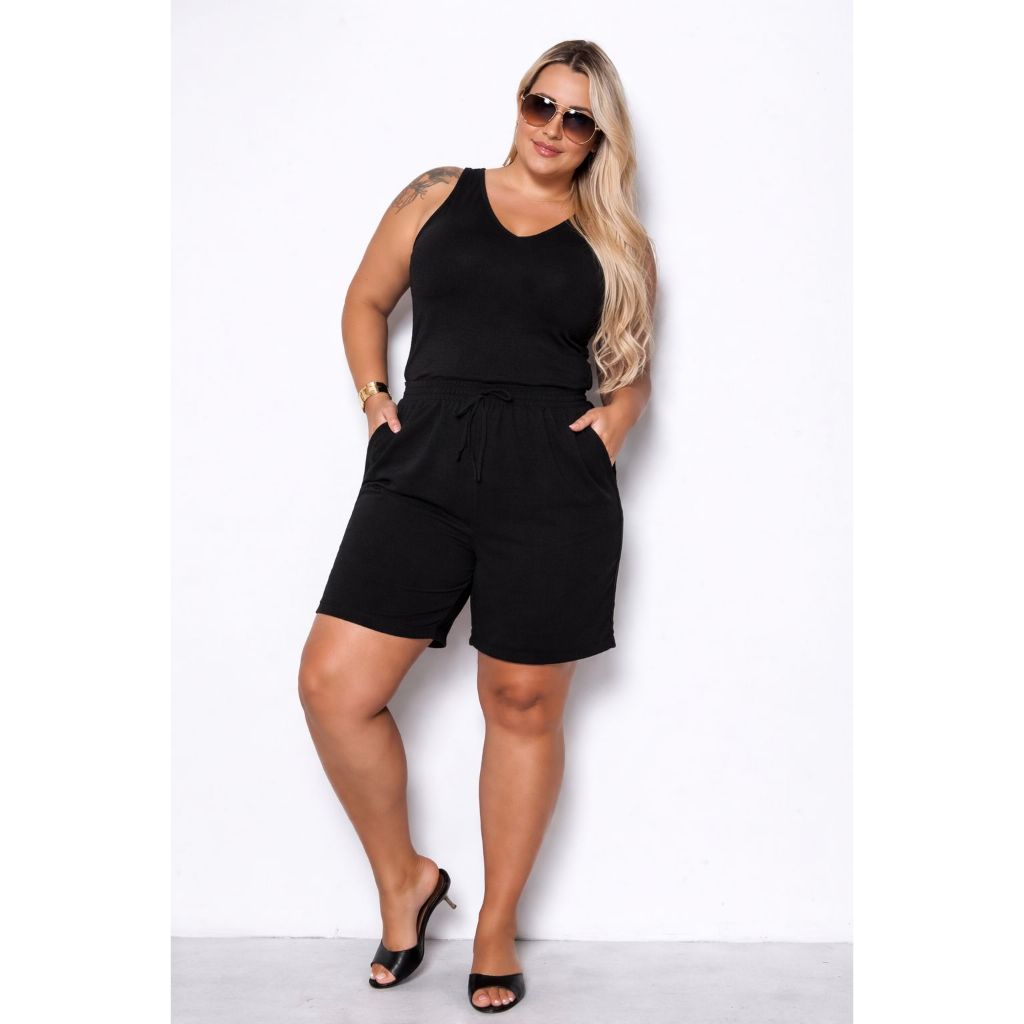 Kit Blusa e Bermuda Feminina Regata Alça Grossa Duna Tendência Cintura Alta Cordão Moda Verão