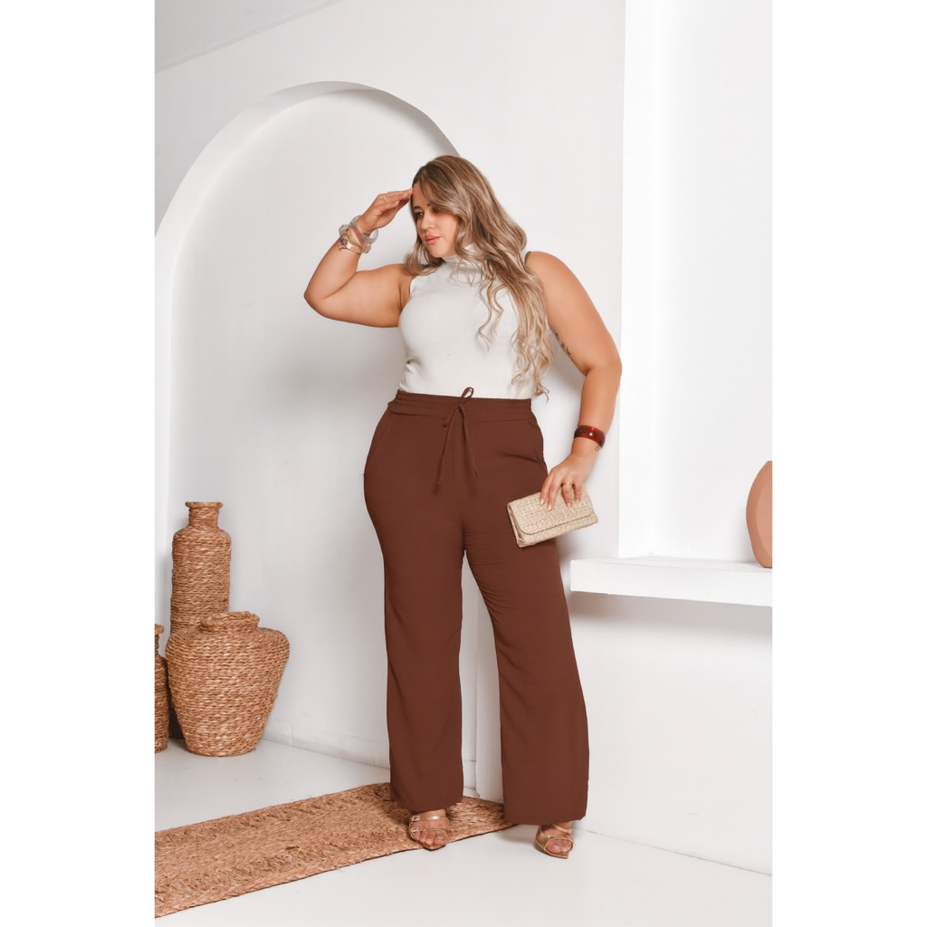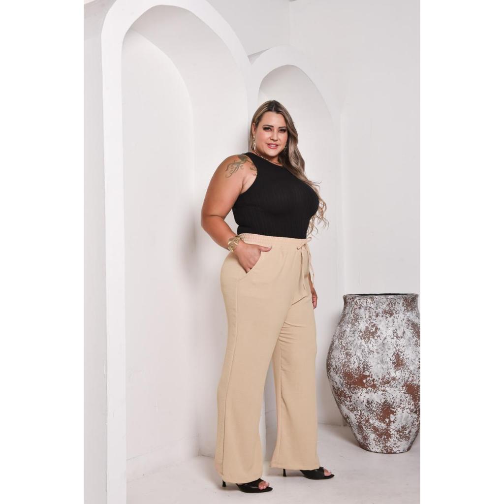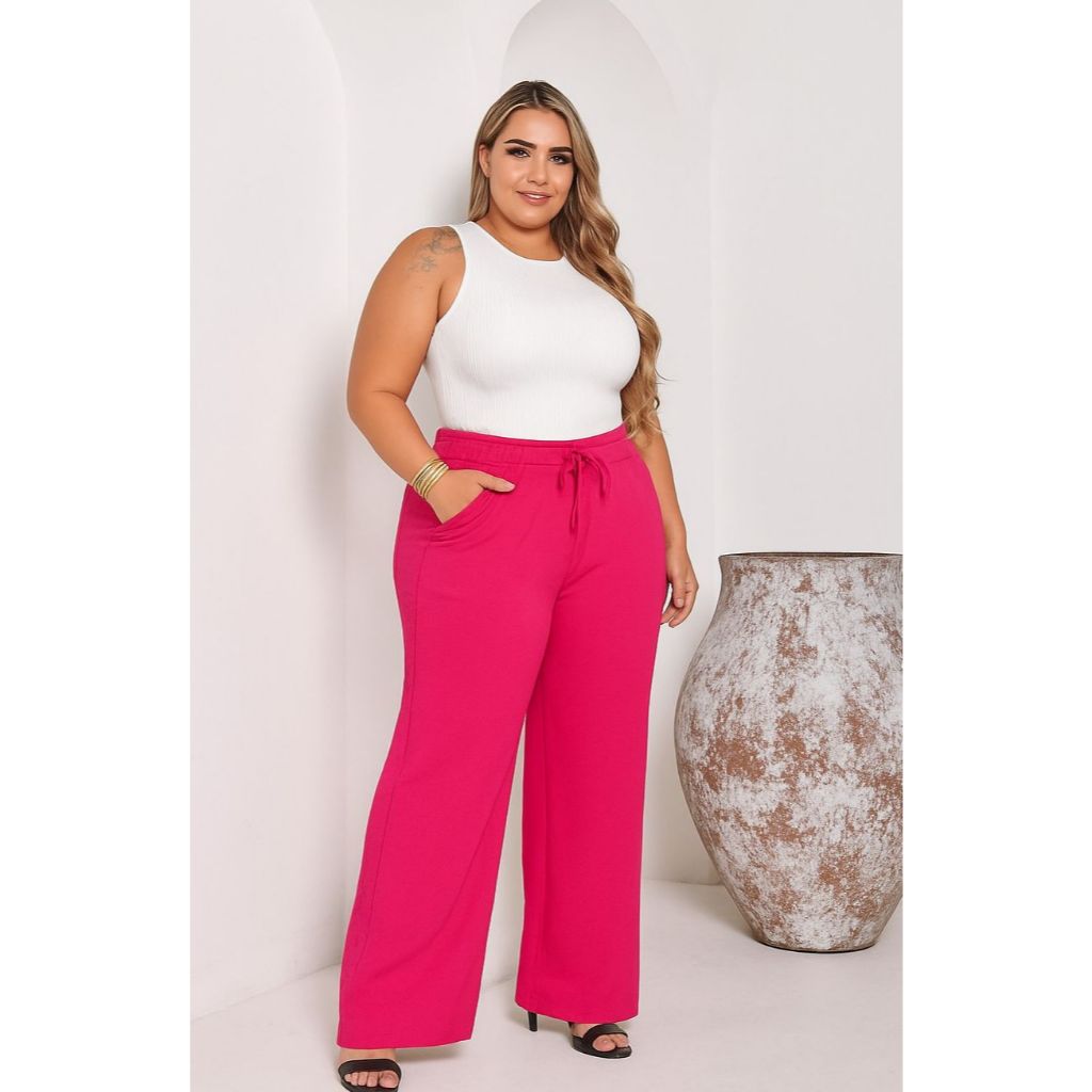 Calça Wide Leg Pantalona Plus Size Duna Alfaitaria Estilo Gringa Com Elástico Com Bolso Social