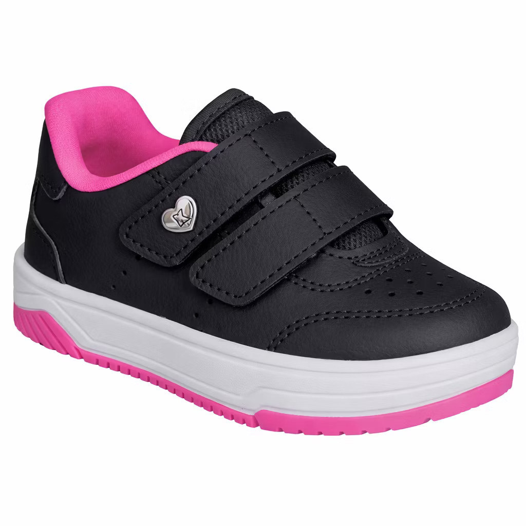 Tênis Infantil Feminino Bebê Escolar Kidy Fechamento Velcro Palmilha Anatômica Confortável Preto/Rosa 313-0050