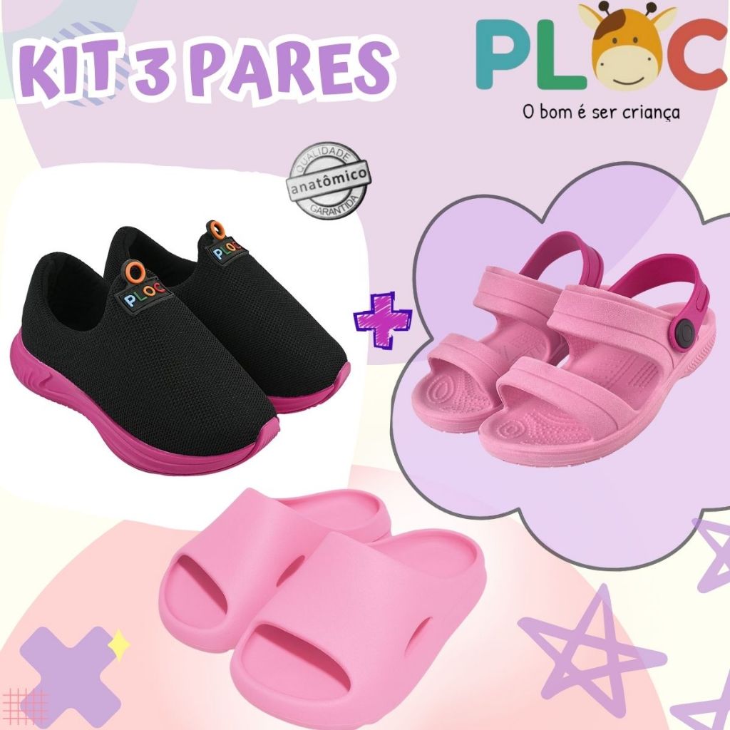 Kit 3 Pares: Tênis Calce Fácil P26 Menina + Papete + Chinelo Ploc - Casual Verão