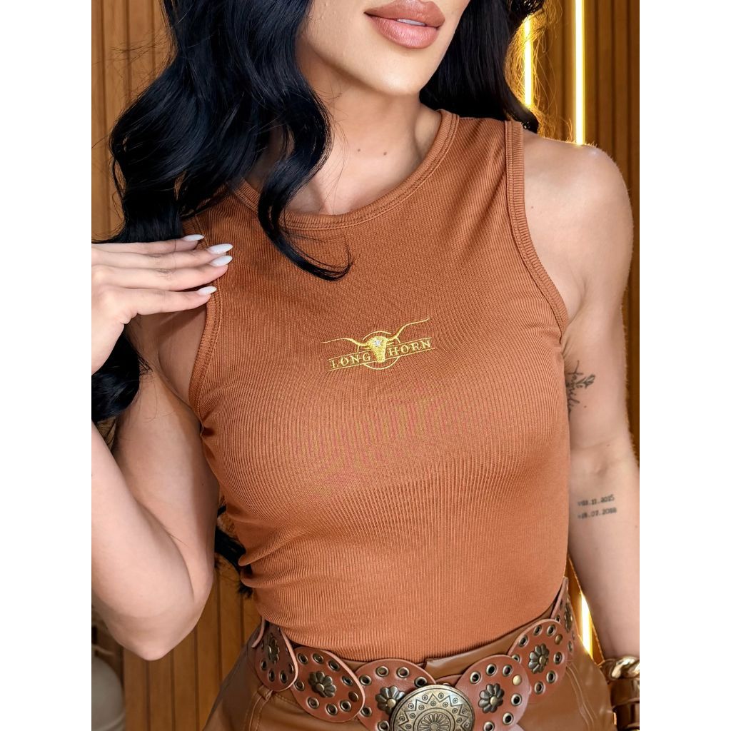Regata feminina country, estilo canelada com detalhe bordado ribana canelada basica