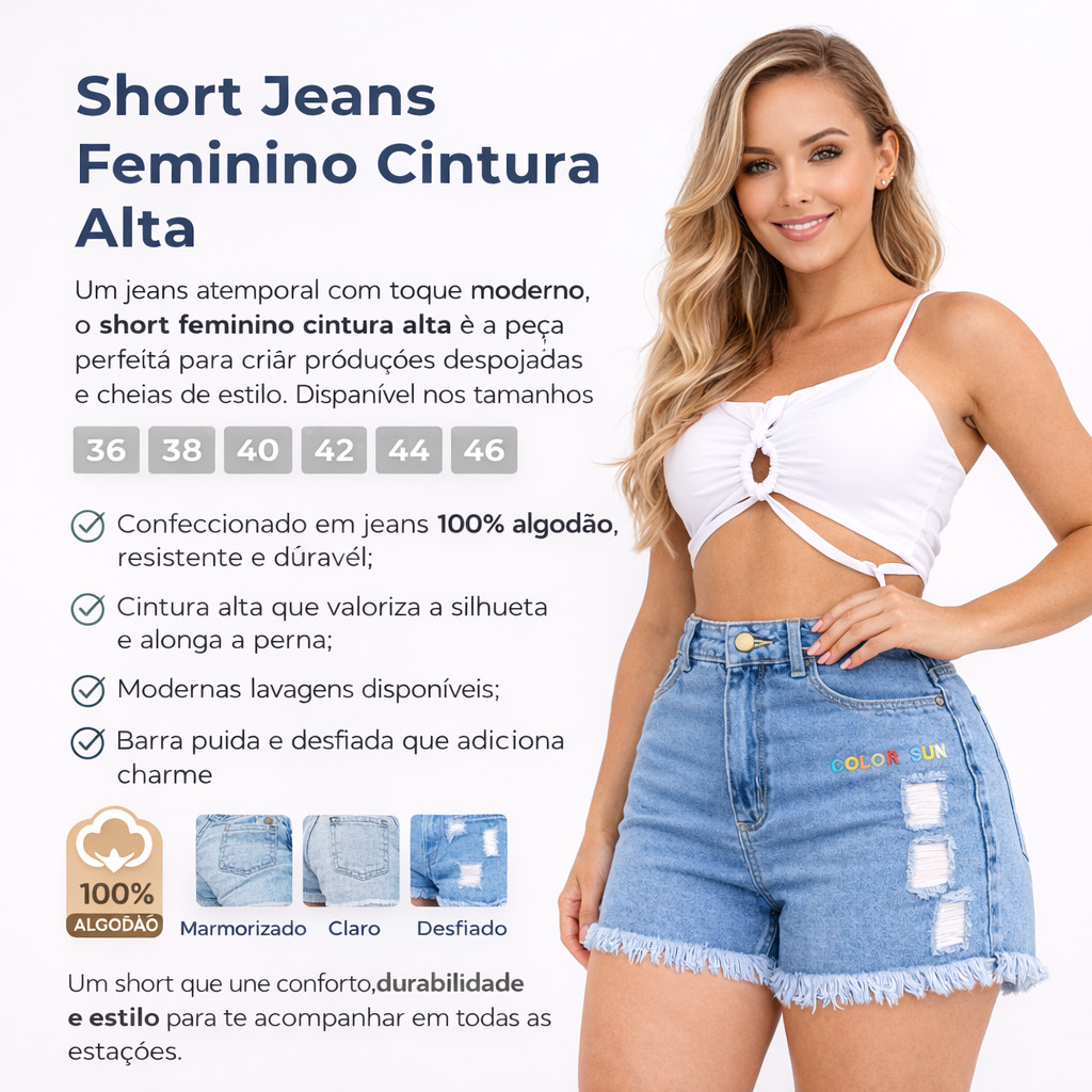 Short Jeans Feminino Marmorizado e Claro Cintura Alta Destroy Básico Confortavel