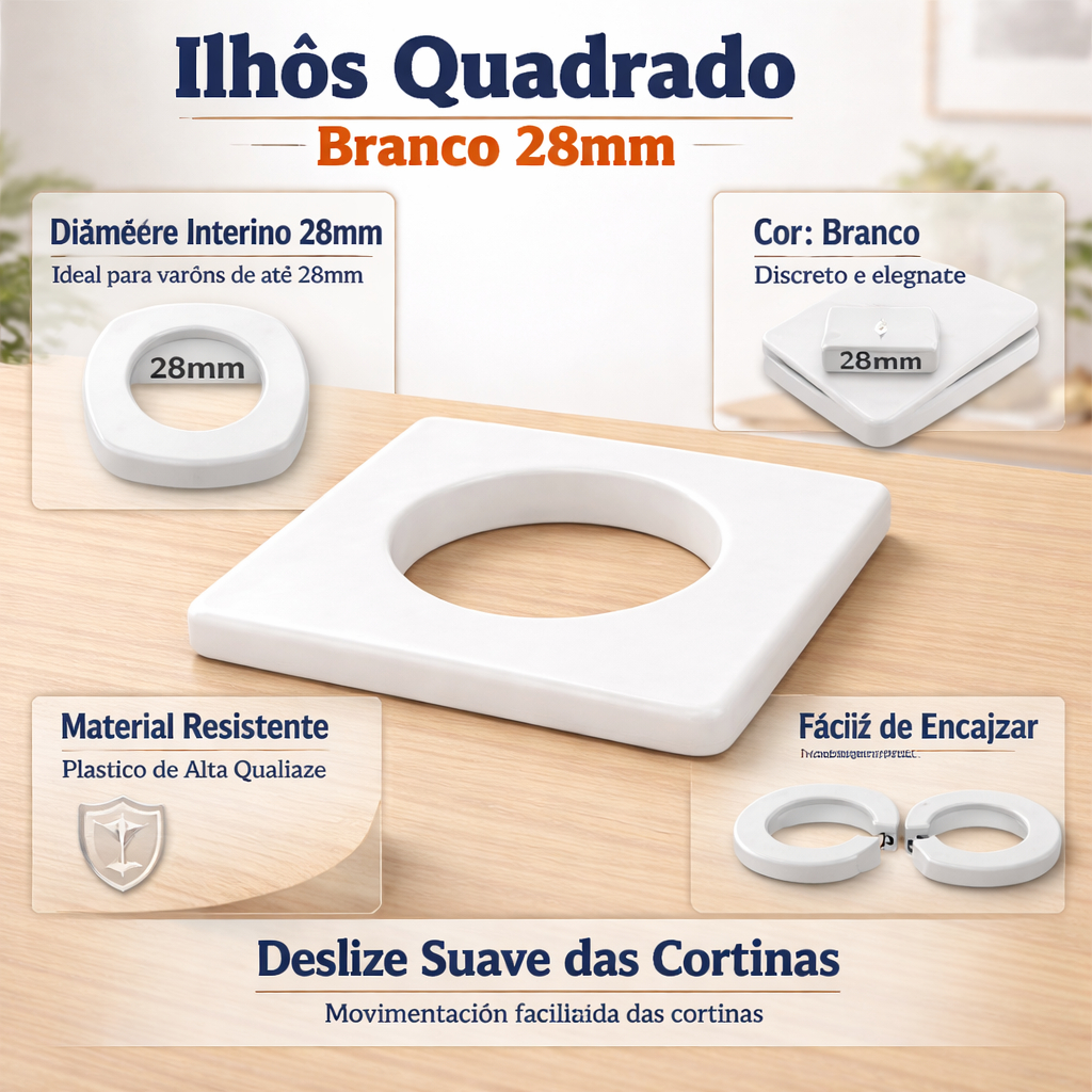 Ilhós 28mm Branco para Cortina Quadrado Plástico Resistente Encaixe Fácil