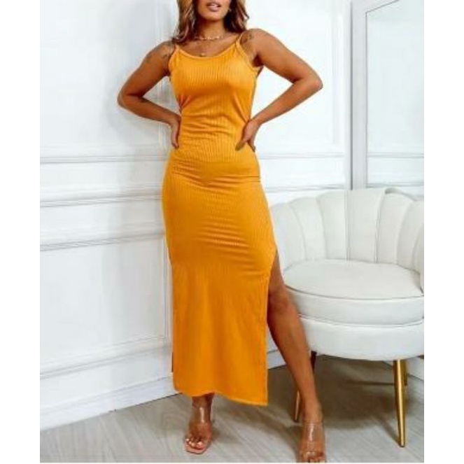 VESTIDO FEMININO LONGO DE ALCINHA COM FENDAS LATERAIS MAHLA CANELADO