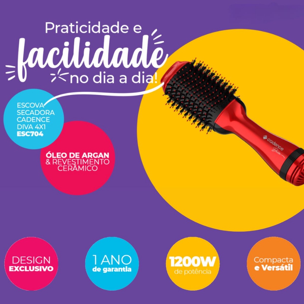 Escova Elétrica 4 em 1: Seca, Escova, Alisa e Modela Cadence ESC704 Diva Argan Vermelha 110v