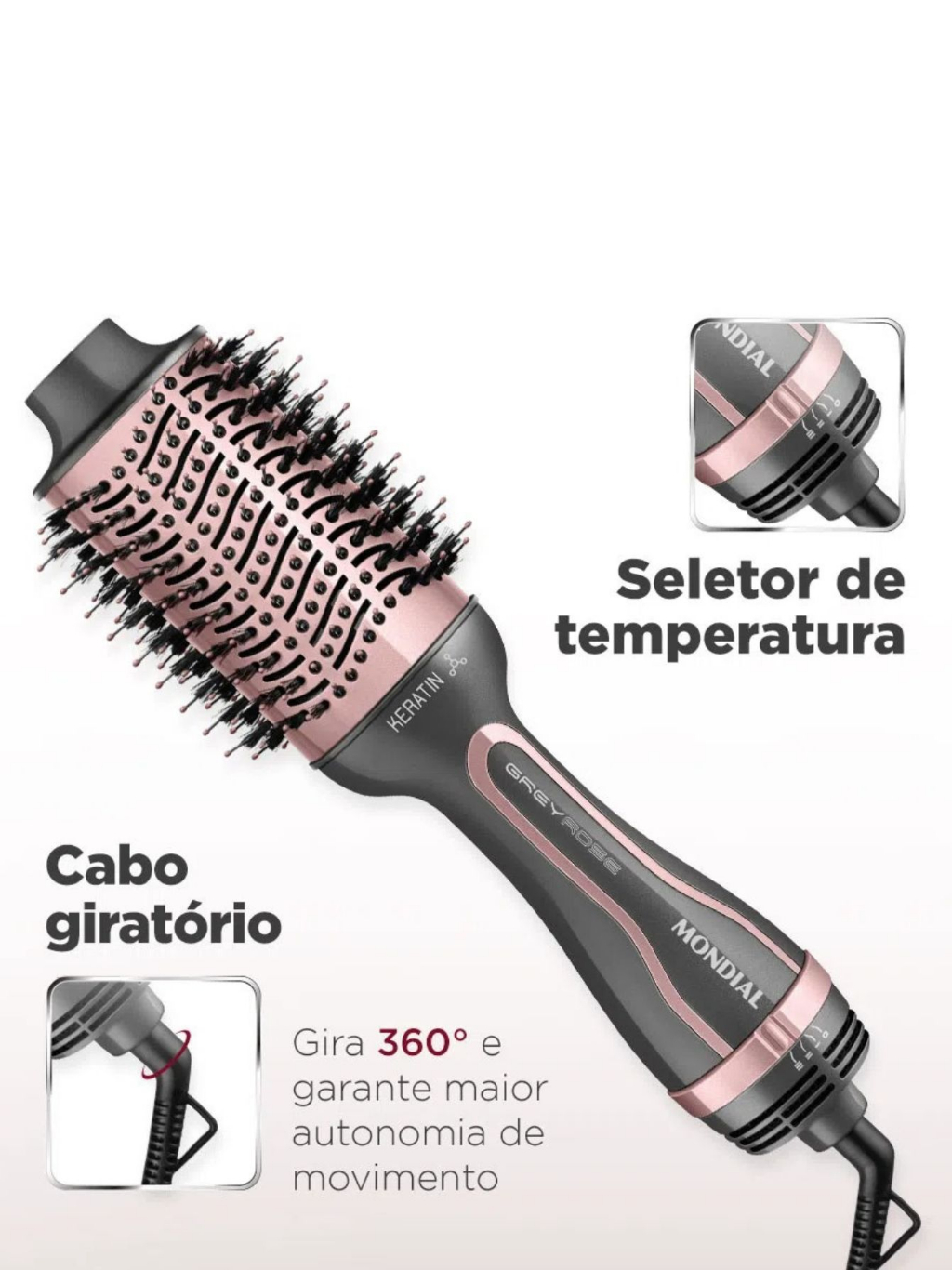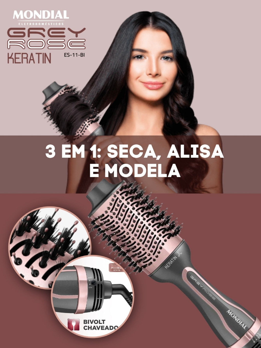 Escova Secadora Modeladora e Alisadora 3 em 1 Mondial ES-11-BI 1300w Rose Grey Keratin Bivolt