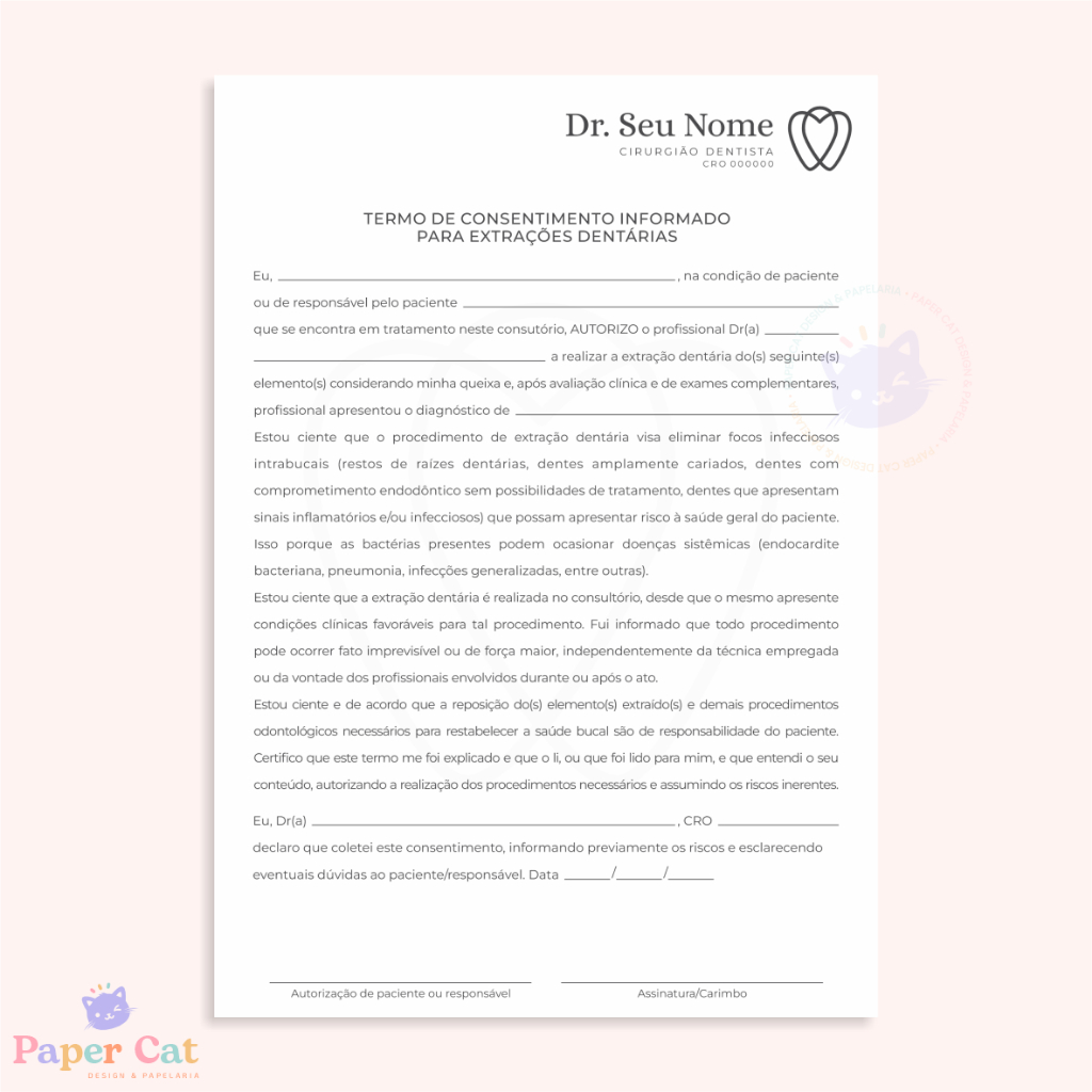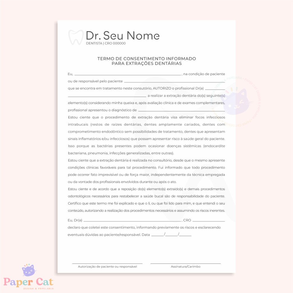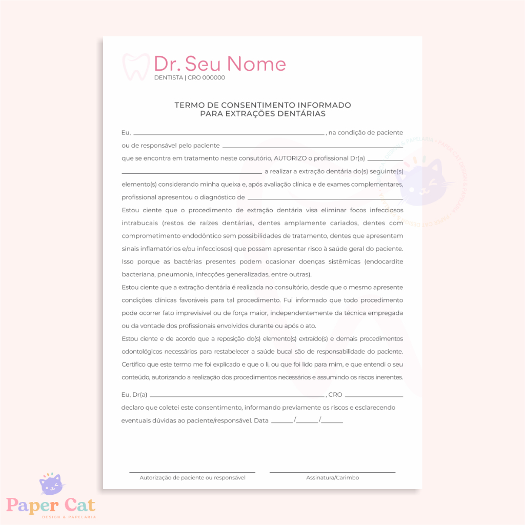 Bloco Termo de Consentimento Extração Dentária | Odontologia | Personalizado | Tamanho A5 | 50 Folhas